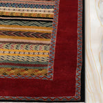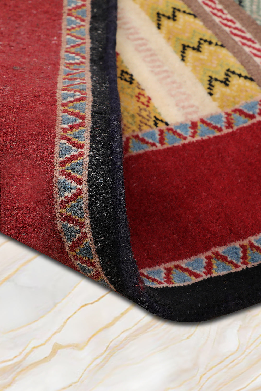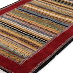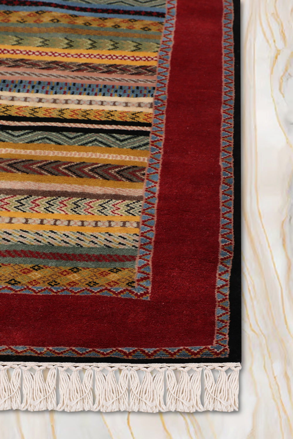 Transform your space with the Aurea rug, a beautifully hand-knotted piece from our Odyssey Collection that blends modern flair with timeless craft. This 3 x 6 ft wool rug, featuring a medium pile with a mild soft texture, showcases a series of horizontal stripes with geometric accents in rich maroon garnet, vibrant saffron glow, and hints of warm ochre. Its design draws from early 20th-century modernist movements, where abstract stripes symbolized freedom and innovation, while echoing tribal weaving traditions that used geometric patterns for protection and storytelling since ancient times. These patterns, reflecting a fusion of cultural narratives and artistic evolution, have influenced contemporary design, offering a fresh yet rooted aesthetic. The inviting texture makes it perfect for living rooms or bedrooms seeking a contemporary touch.