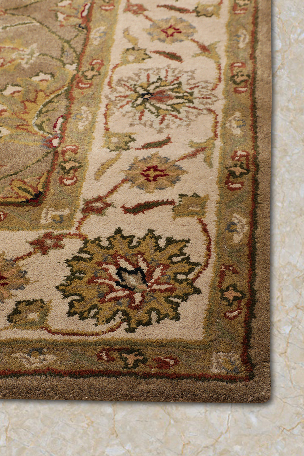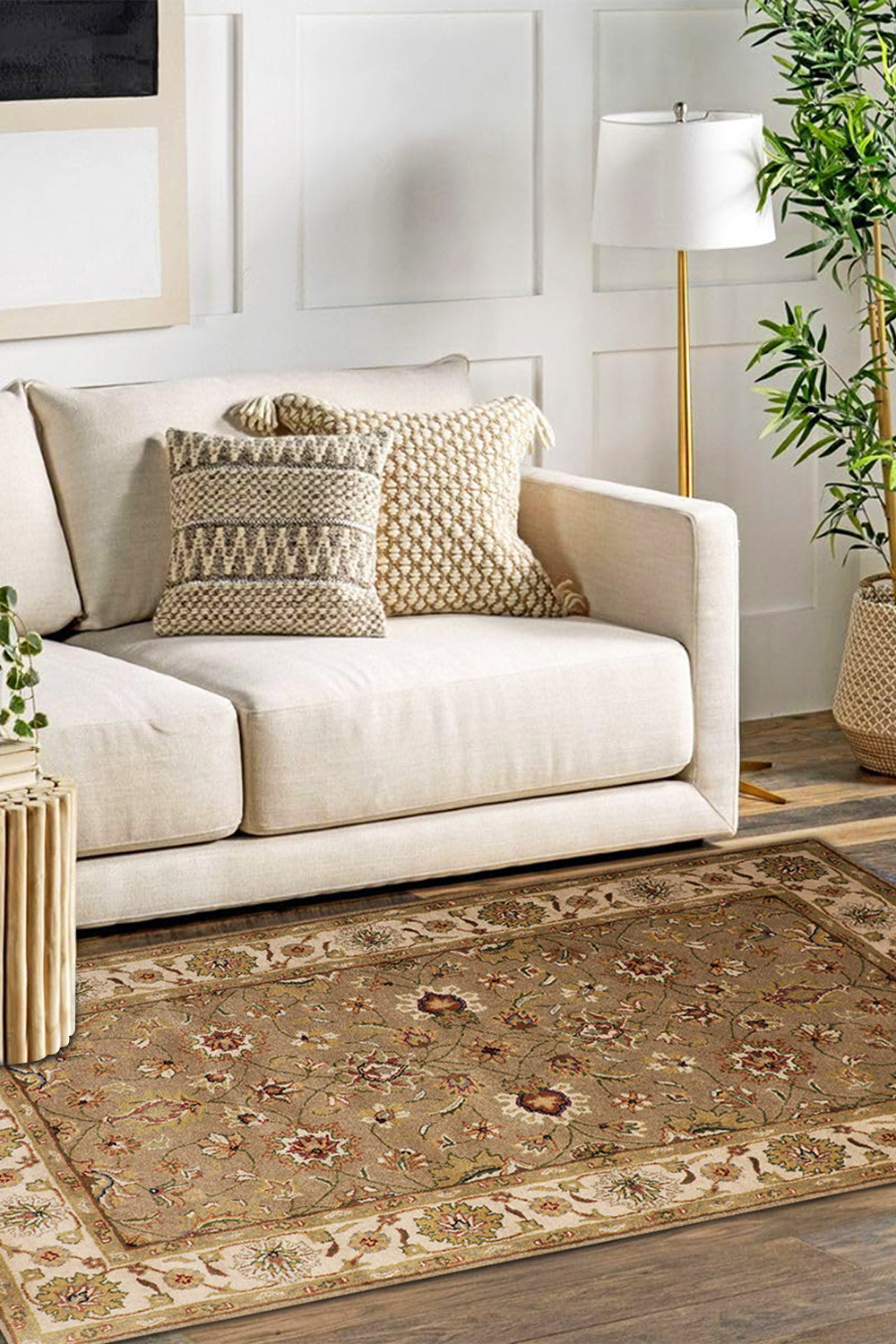 Infuse your home with timeless elegance using the Bahram rug, a skillfully crafted piece from our Chahat Collection that embodies Oriental heritage. This 5 x 8 ft hand-tufted wool rug, featuring a high pile with a mild soft texture, showcases a repeating floral and vine motif with intricate borders in warm beige sand, earthy mushroom taupe, and hints of soft fawn. Its design draws from Persian and Central Asian traditions, where floral and vine patterns symbolized growth and prosperity since the 16th century, often woven into rugs for ceremonial and domestic spaces. These motifs, reflecting cultural narratives of abundance, influenced textile arts across trade routes, blending tradition with enduring appeal. The plush feel underfoot makes it ideal for living rooms or bedrooms seeking a classic accent.