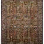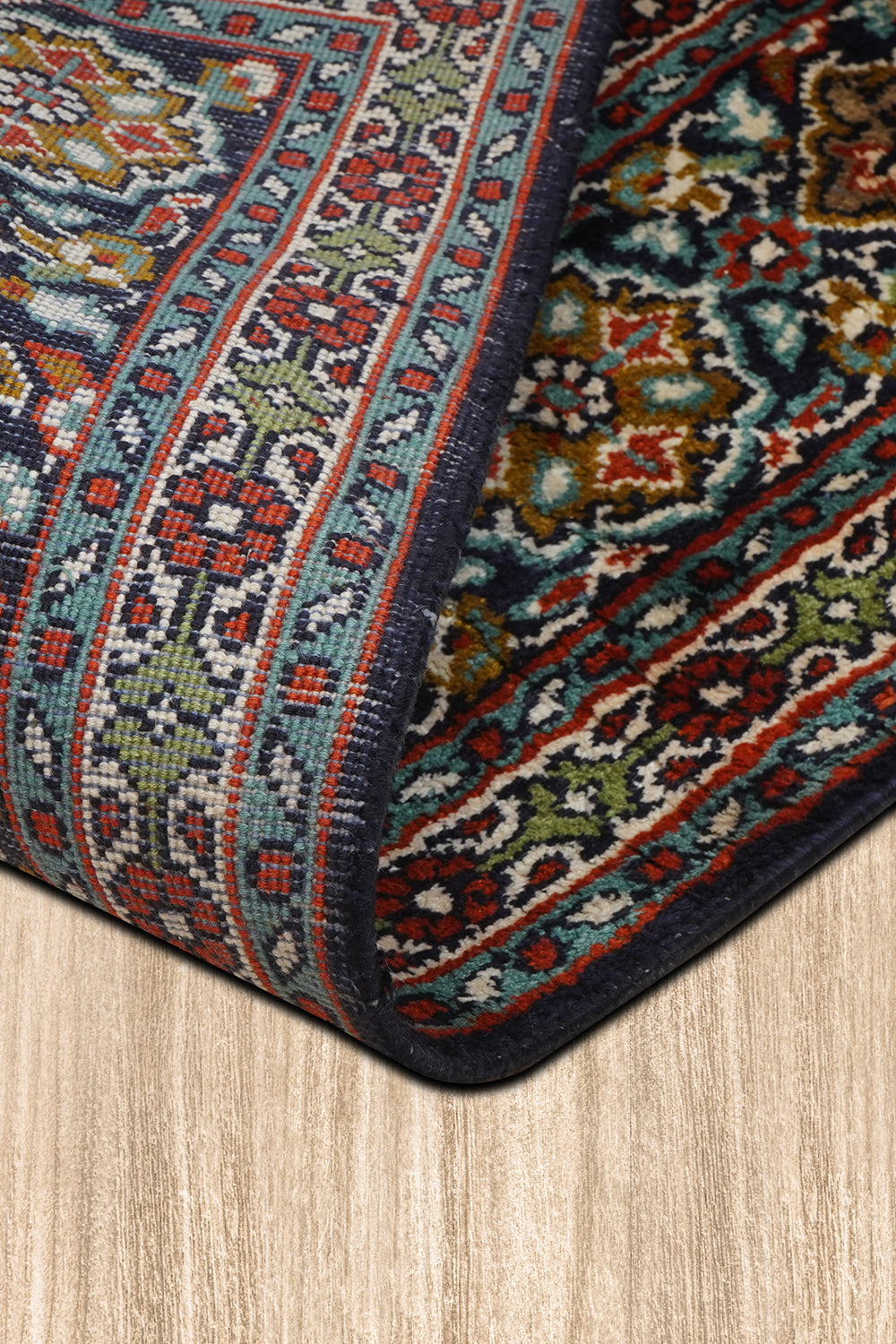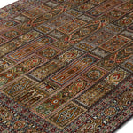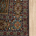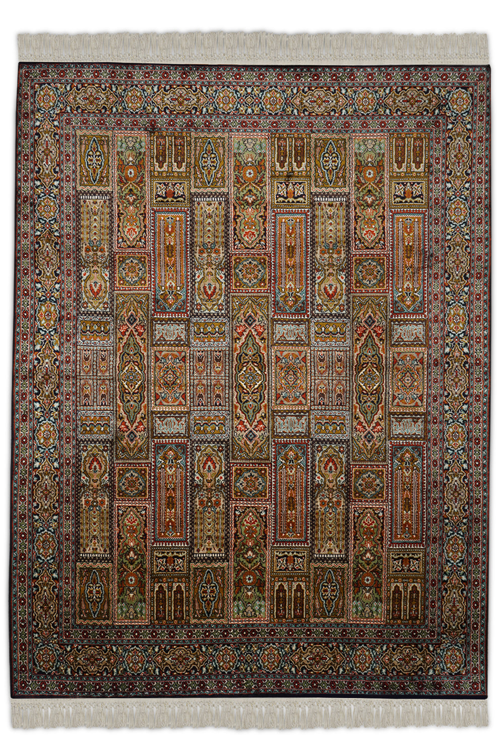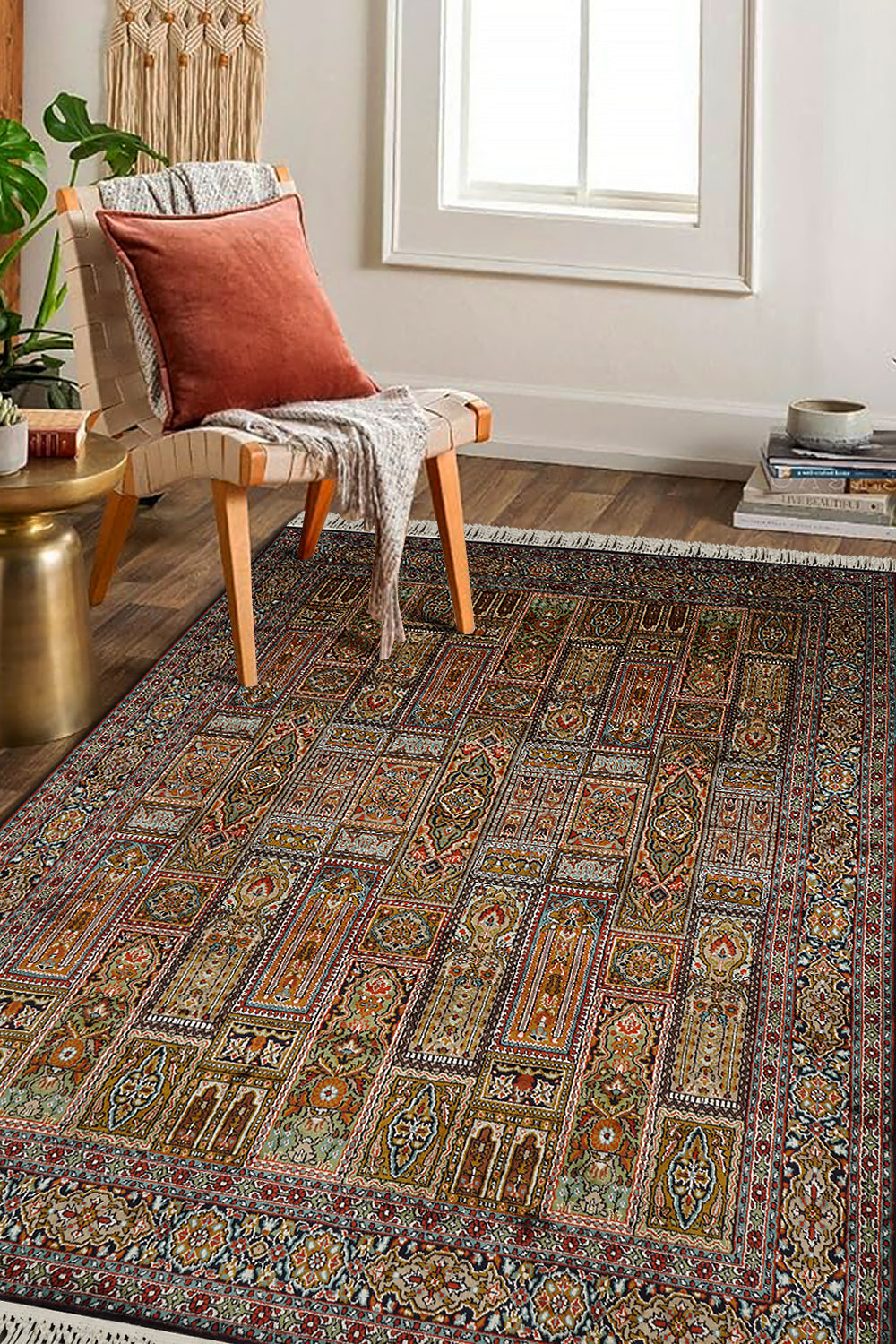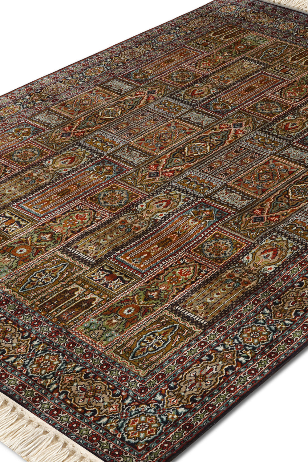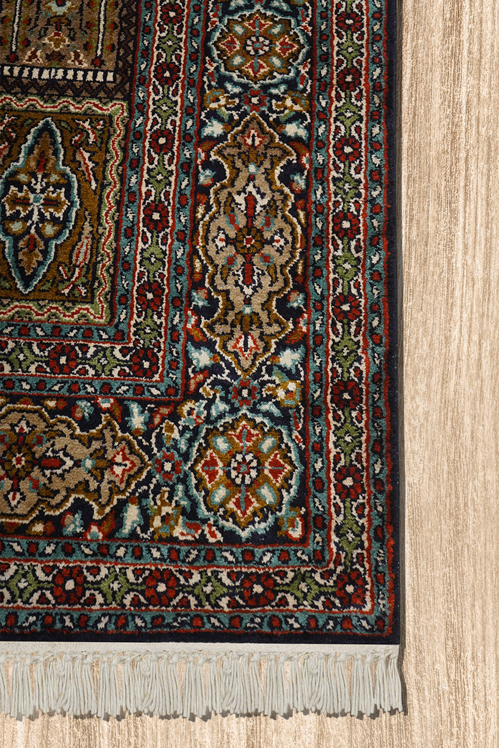 The Bakhtiyar Khatiras design elevates the traditional Bakhtiyar aesthetic by adding a touch of architectural finesse. While classic Bakhtiyar designs focus on bold floral and geometric patterns, the Khatiras variation incorporates intricate panel-like motifs that resemble the grandeur of ancient palace walls. Its unique interplay of symmetry and detailing sets it apart, creating a more structured and refined visual appeal. This blend of traditional roots with an elevated design makes it a standout in Indian carpet artistry.