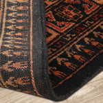 The Junoon collection's Kazak design is a celebration of tribal artistry and enduring craftsmanship. This 5x7 hand-knotted wool rug, rendered in deep navy blue and earthy brown, exudes a commanding presence while maintaining a harmonious balance. It’s a piece that not only grounds your living room or bedroom but also tells a story of tradition and resilience.