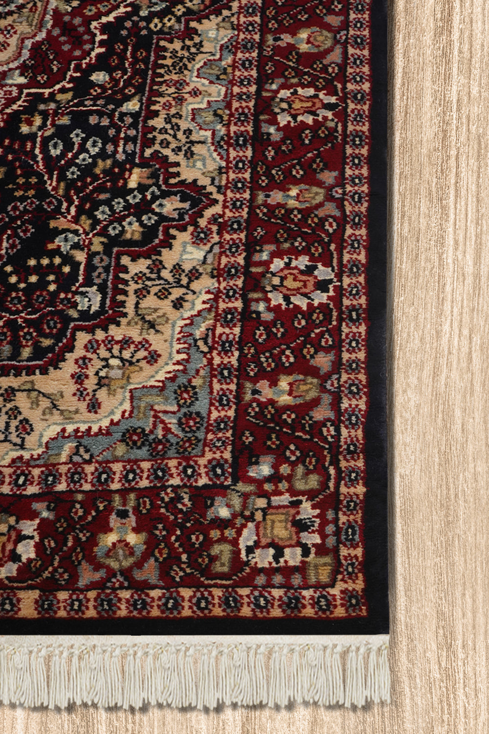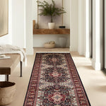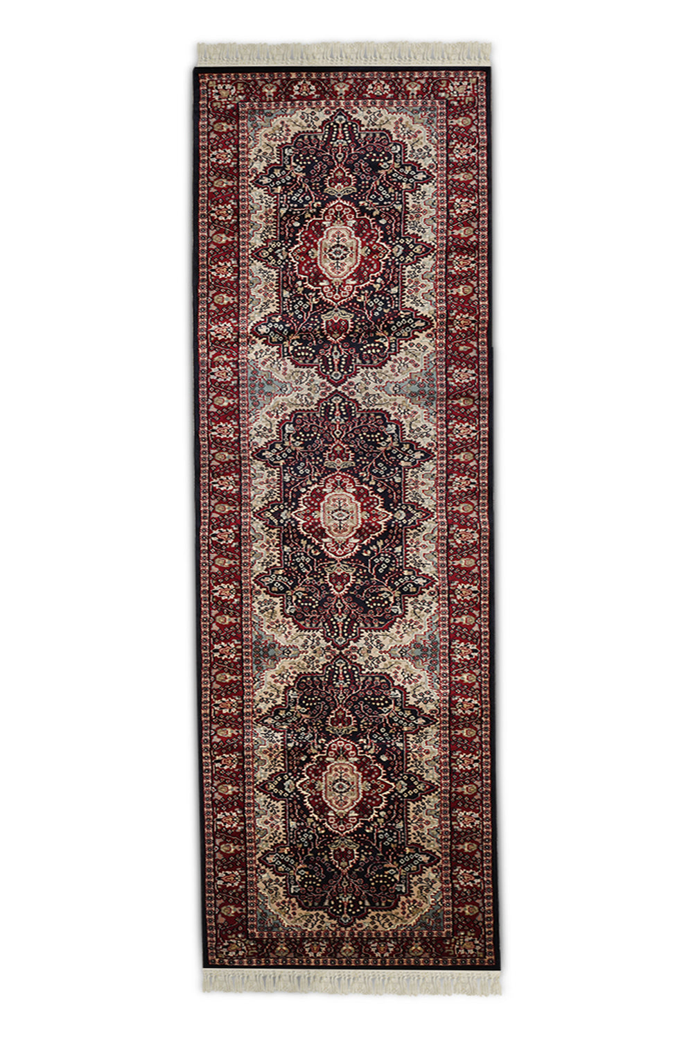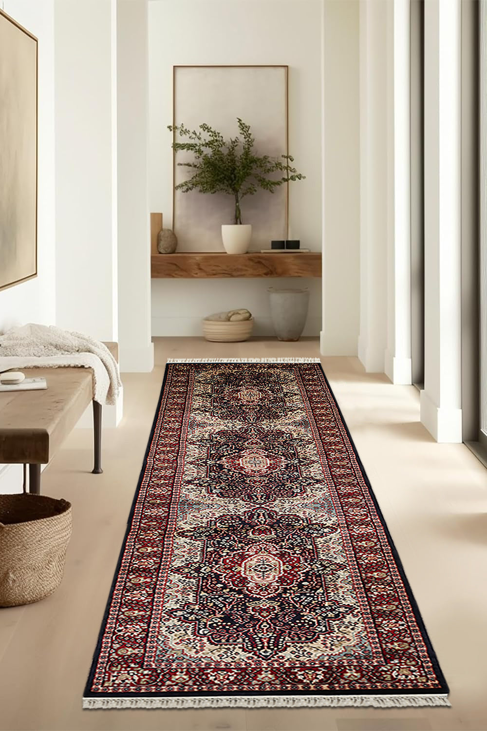 The deep Navy hue of this runner creates a sense of sophistication and timeless elegance, while the contrasting Wine accents add a touch of warmth and vibrancy. As you walk along this runner, imagine yourself surrounded by the grandeur of a bygone era, where such rugs adorned the floors of palaces and mansions.