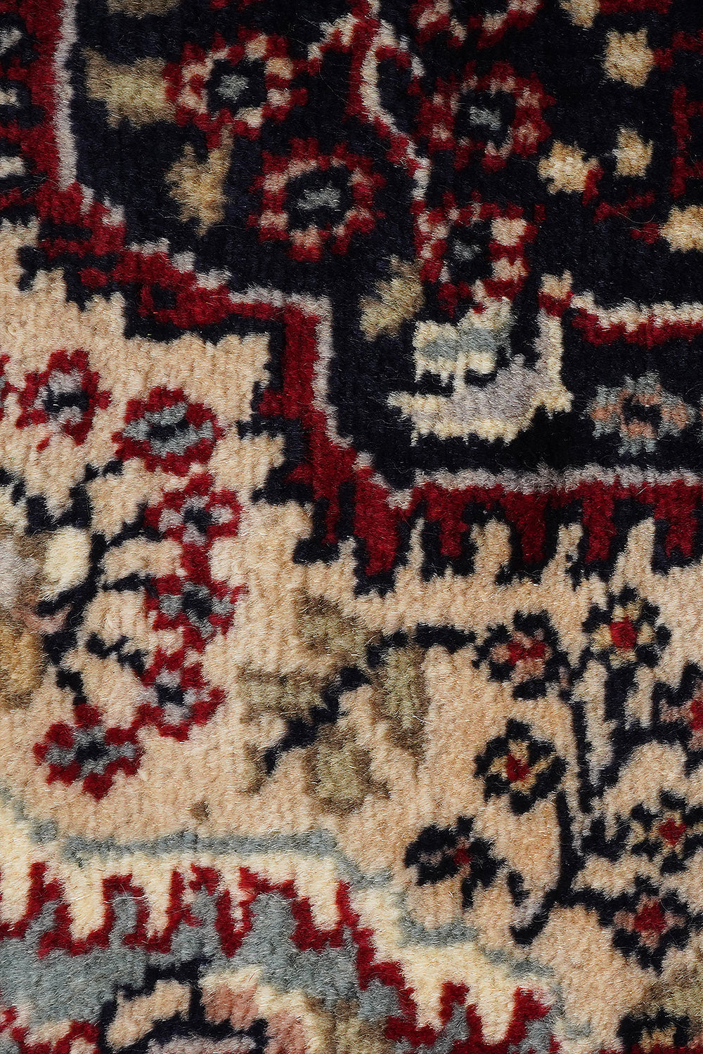 This Traditional Oriental Baghdar rug is a testament to the enduring power of artistry and craftsmanship. Baghdar rugs are renowned for their unique geometric patterns on the three central medallions and mesmerizing symmetry, often featuring intricate floral motifs and captivating medallions. These designs are a testament to the skill and dedication of Indian artisans, who meticulously craft each rug by hand.