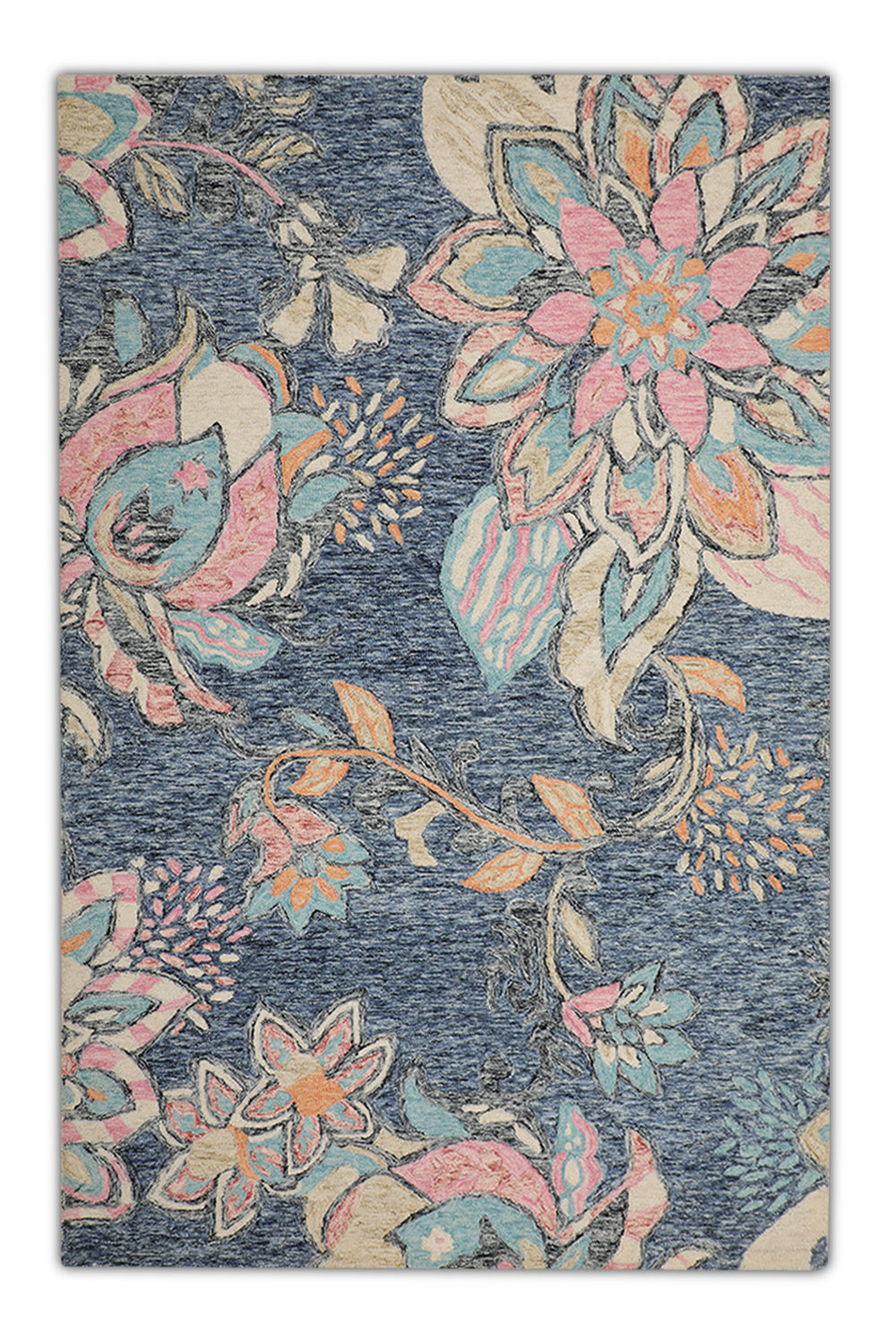 Elevate your space with the Elnaz rug, a beautifully crafted piece from our Odyssey Collection that blends modern design with timeless inspiration. This 5 x 8 ft hand-tufted wool rug, featuring a high pile with a mild soft texture, showcases a minimalist tulip motif with subtle stem accents in deep cerulean blue, creamy ivory whisper, and hints of soft azure. Its design draws from Persian and Central Asian traditions, where tulip motifs symbolized love and renewal since the 17th century, often woven into rugs for ceremonial spaces and later reimagined in modern floral aesthetics. These patterns, reflecting cultural narratives of beauty and rebirth, influenced decorative arts across trade routes, merging heritage with contemporary elegance. The plush feel underfoot makes it ideal for living rooms or bedrooms seeking a serene accent.