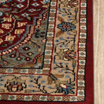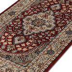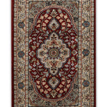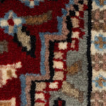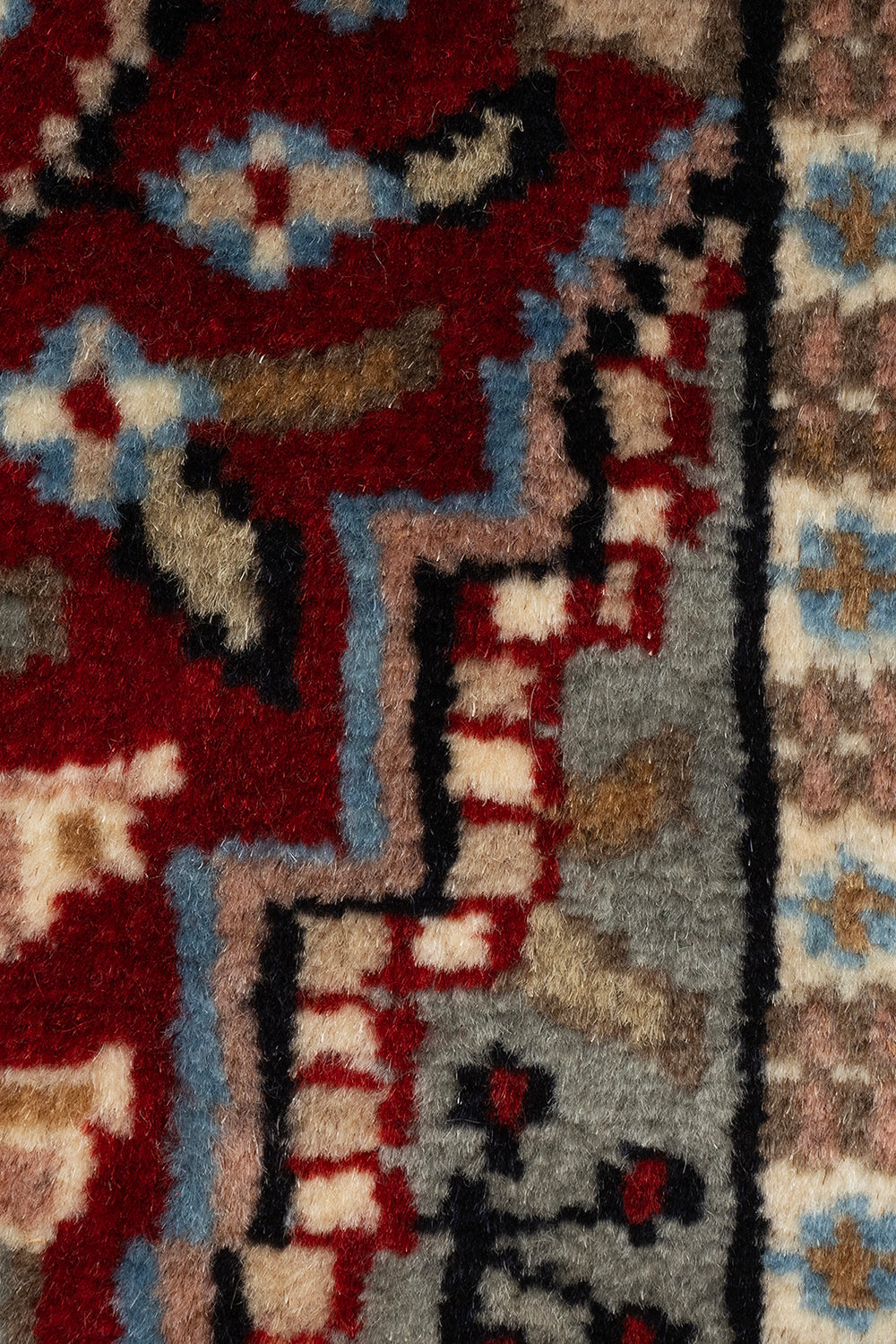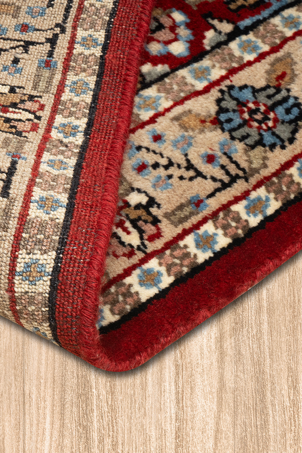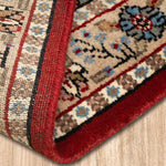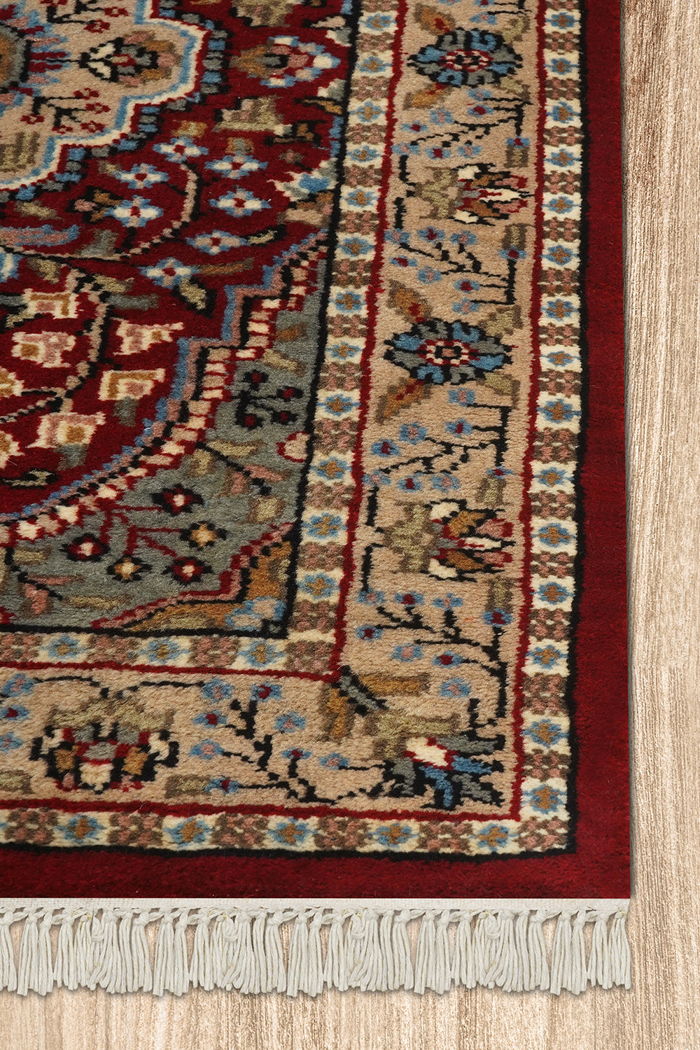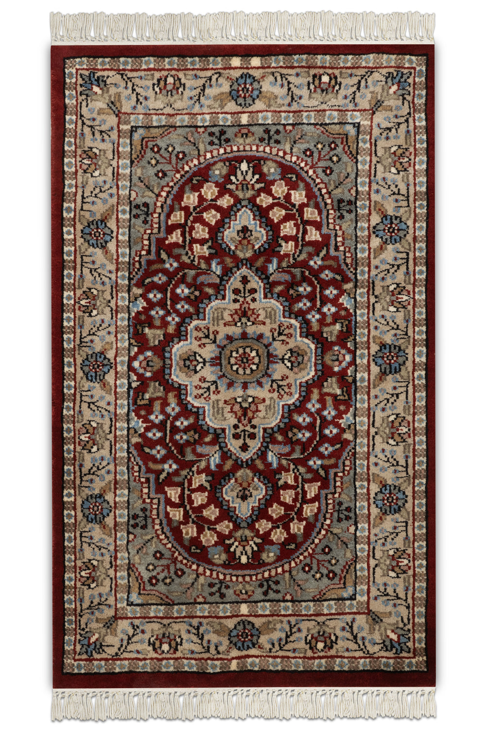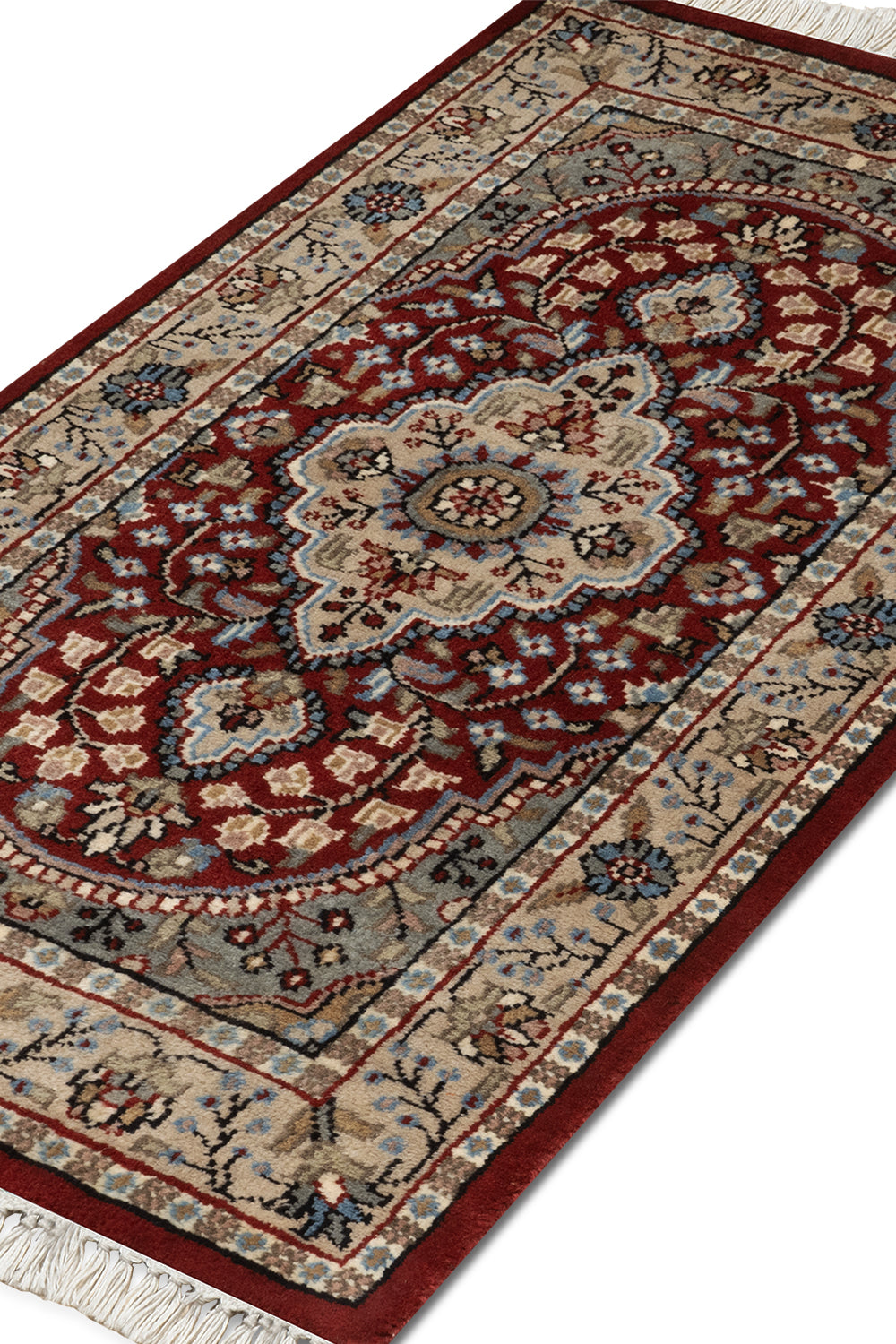 Firdaws translates to Heaven and Paradise, which is the essence and the inspiration of this carpet. This Kashan-inspired rug captures the grace of traditional Indian rugs craftsmanship. Its compact size (2x3 feet) makes it versatile for various spaces, from enhancing the warmth of a bedroom to serving as a striking wall feature. The intricate floral and geometric motifs are rendered in a balanced palette of maroon, green, and deep blue, framed by an ornate border that ties the design together seamlessly in this Indian traditional rug.