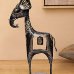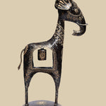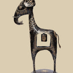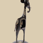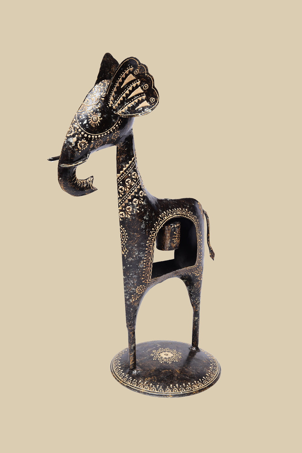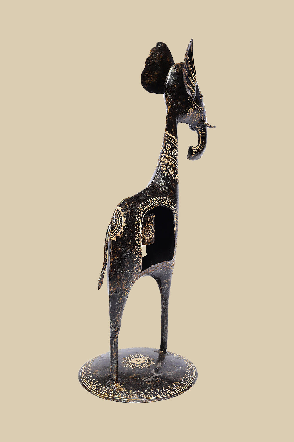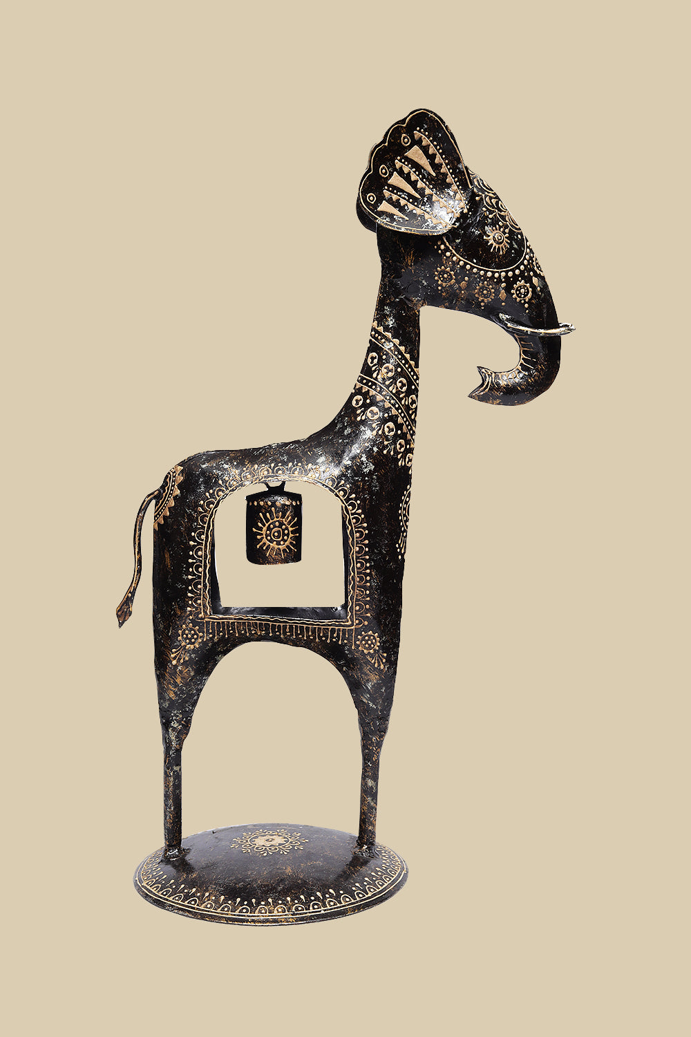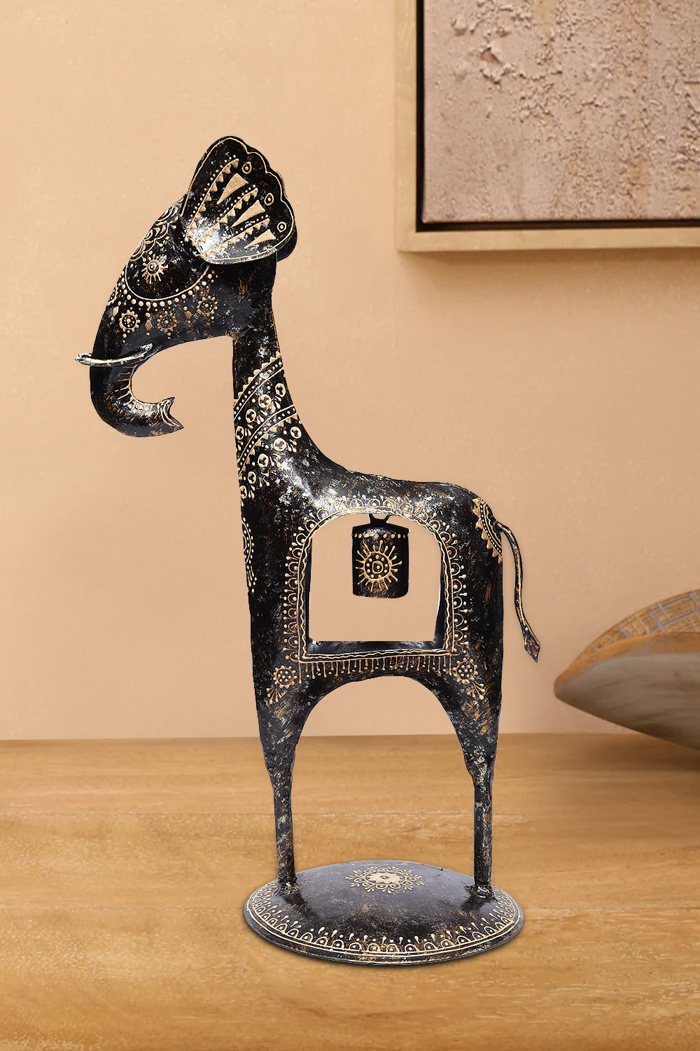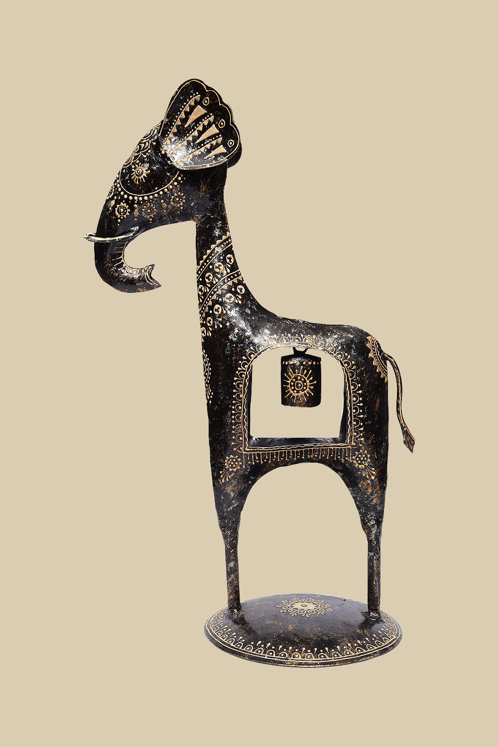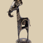 This striking metal elephant sculpture blends Indian tribal artistry with a modern twist, featuring an elongated form with etched floral motifs and a golden-bronze overlay. The raised trunk, slender legs, and a suspended bell within a cutout symbolize poise and movement, finished in a burnished patina. This handcrafted masterpiece serves as a unique statement piece for entryway consoles, mantlepieces, or curated art collections, enriching modern and heritage-inspired interiors with cultural finesse.
