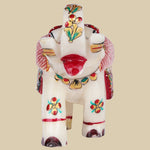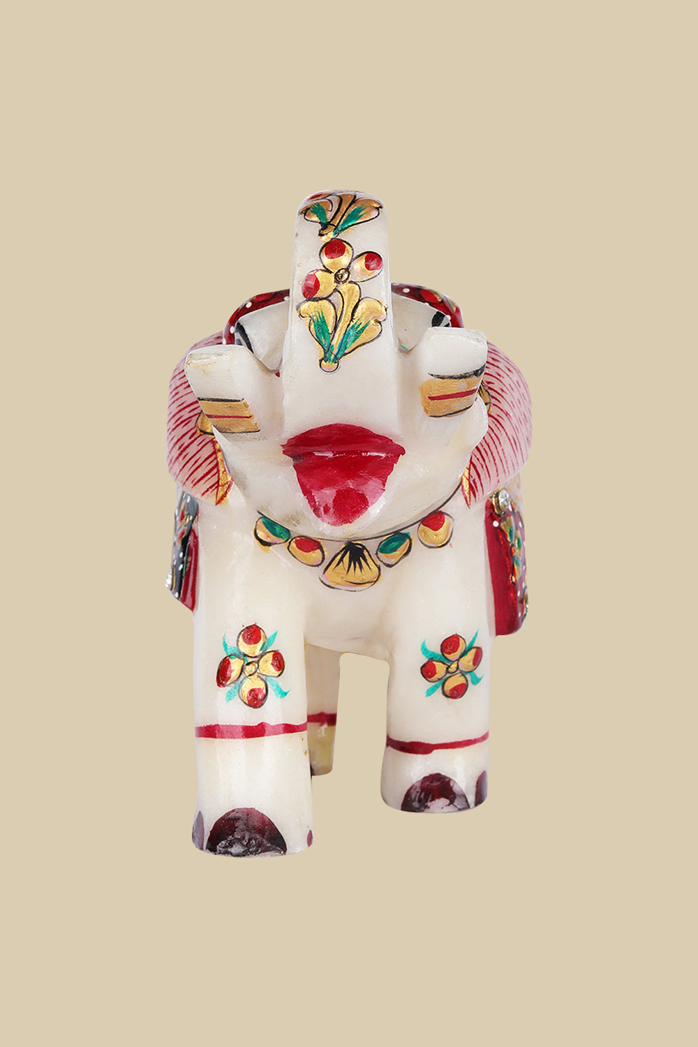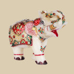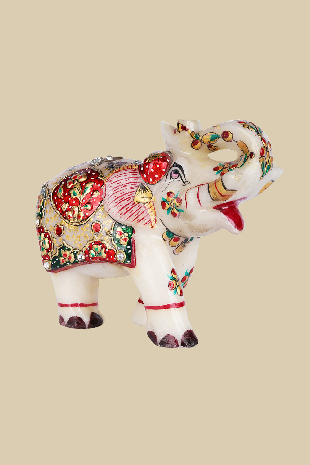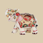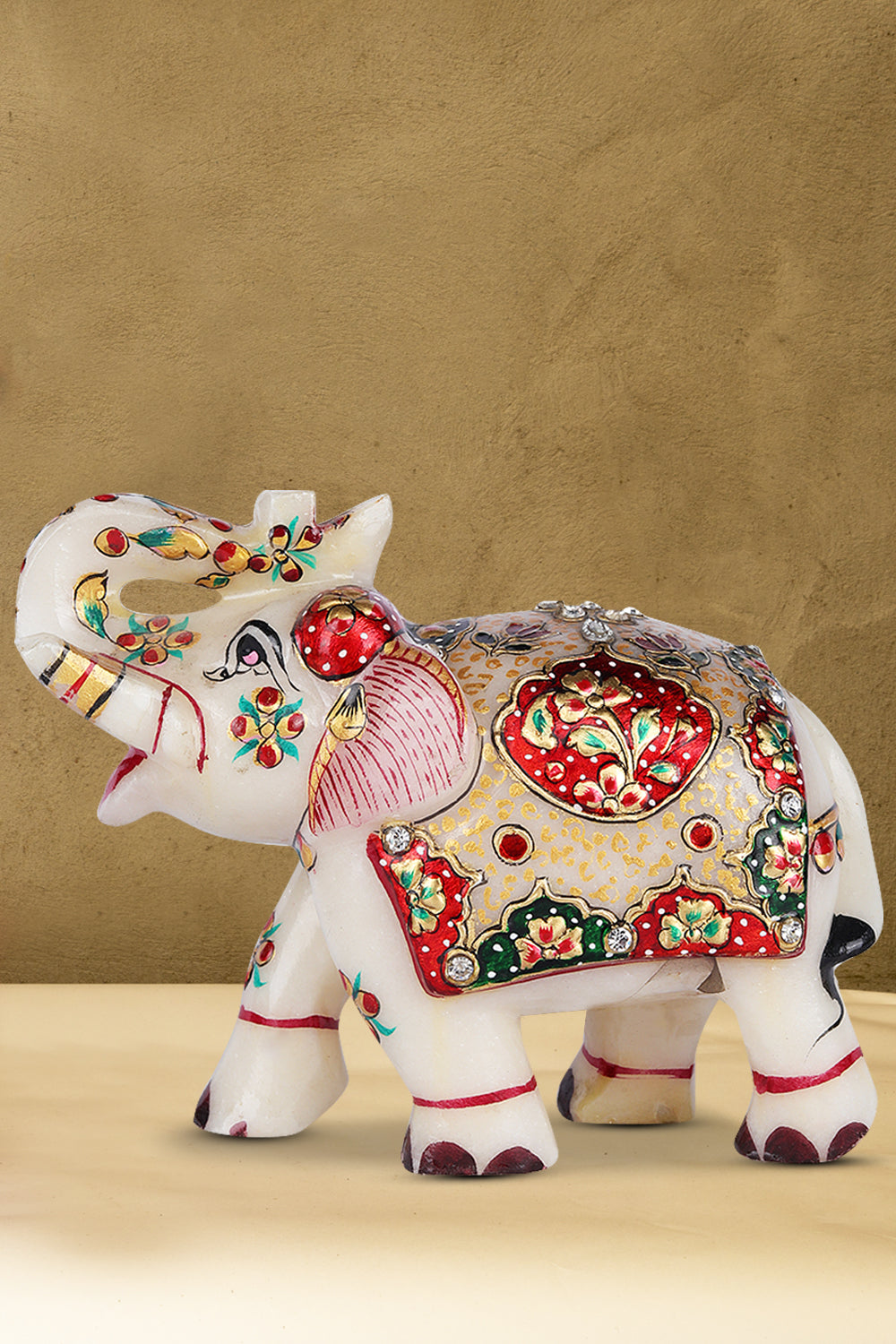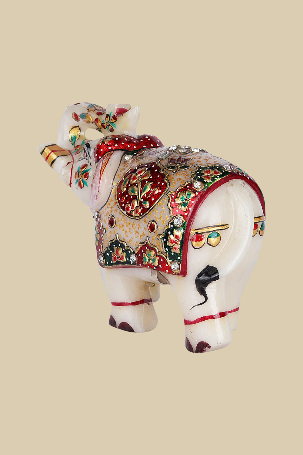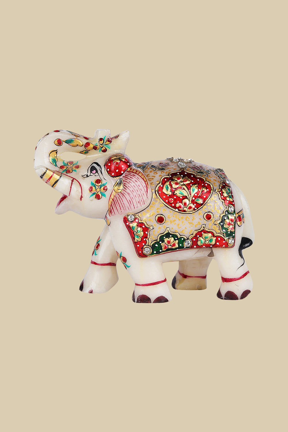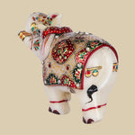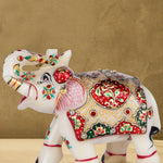 This regal marble elephant sculpture showcases Indian miniature artistry with its white marble base enriched by crimson, green, and gold enamel motifs. The ornate saddlecloth and inset gemstones reflect the grandeur of royal processions, while fine linework on the ears and lifelike eyes add expressive detail. Symbolizing strength and ceremonial elegance, this handcrafted piece is a striking statement piece for luxury home decor. Ideal for enhancing heritage-inspired spaces or modern interiors with its cultural depth.
