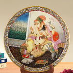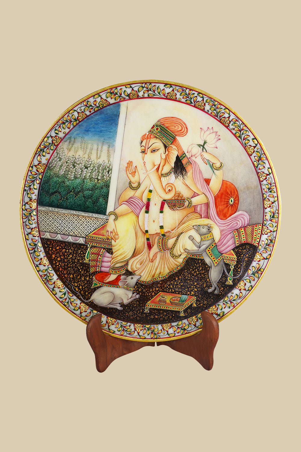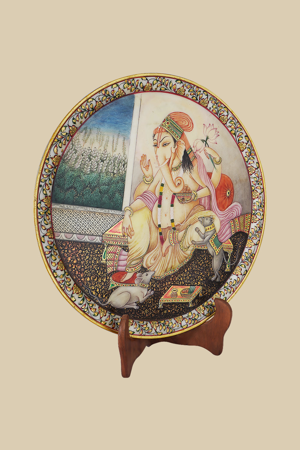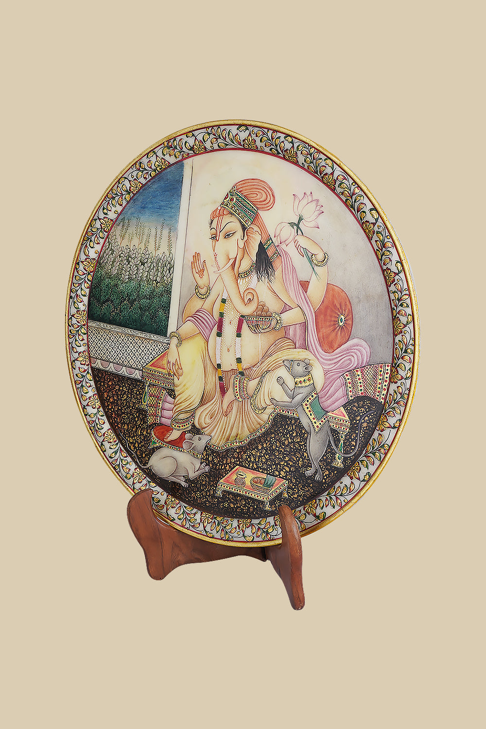 Measuring 38 cm by 38 cm, it features an exquisite hand-painted depiction of Lord Ganesha, the beloved remover of obstacles and harbinger of prosperity. With vibrant hues and intricate detailing, this plate transforms the sacred into a breathtaking visual experience.