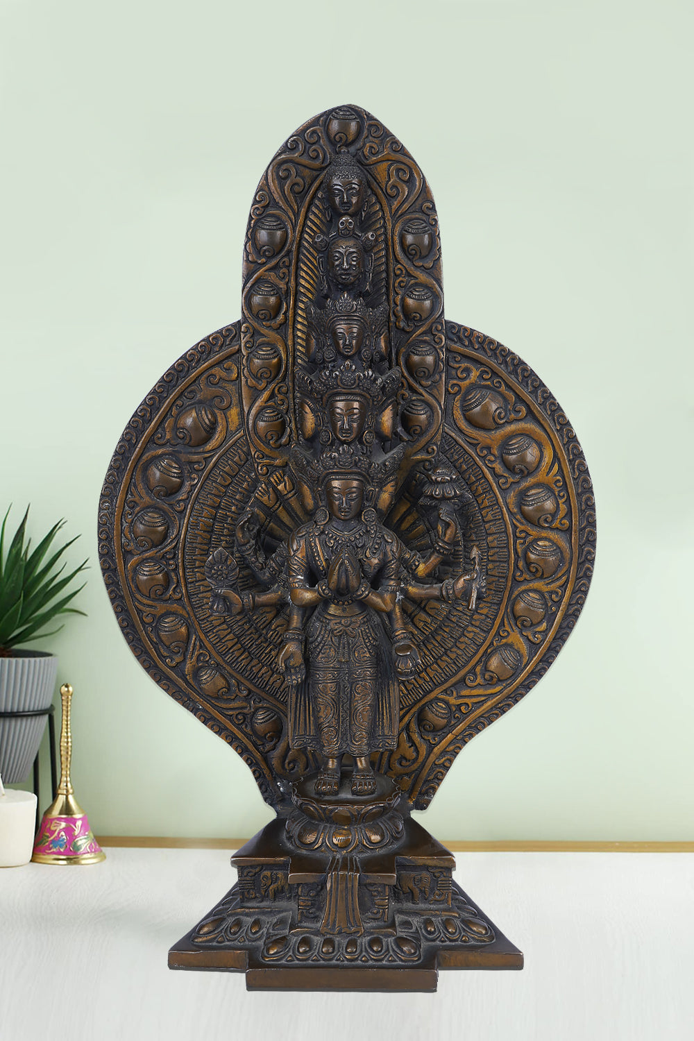 Loketeshwara is depicted in a seated posture, radiating tranquility and an aura of spiritual authority. The gleaming brass surface enhances the statue’s divine charm, making it a centerpiece that draws attention and reverence. This decorative statue is an ideal addition to sacred spaces, meditation corners, or collections of Buddhist antiques.