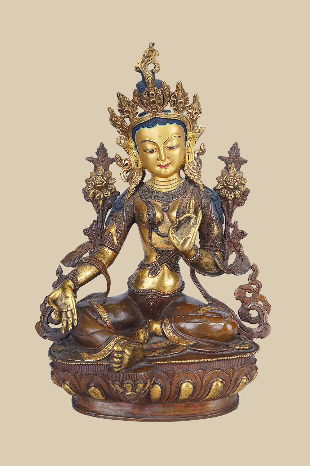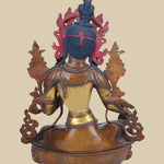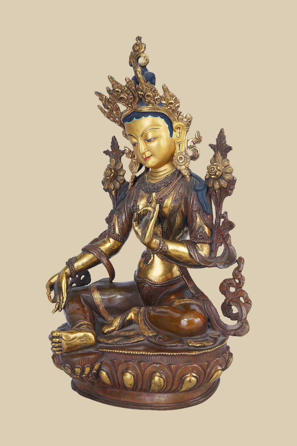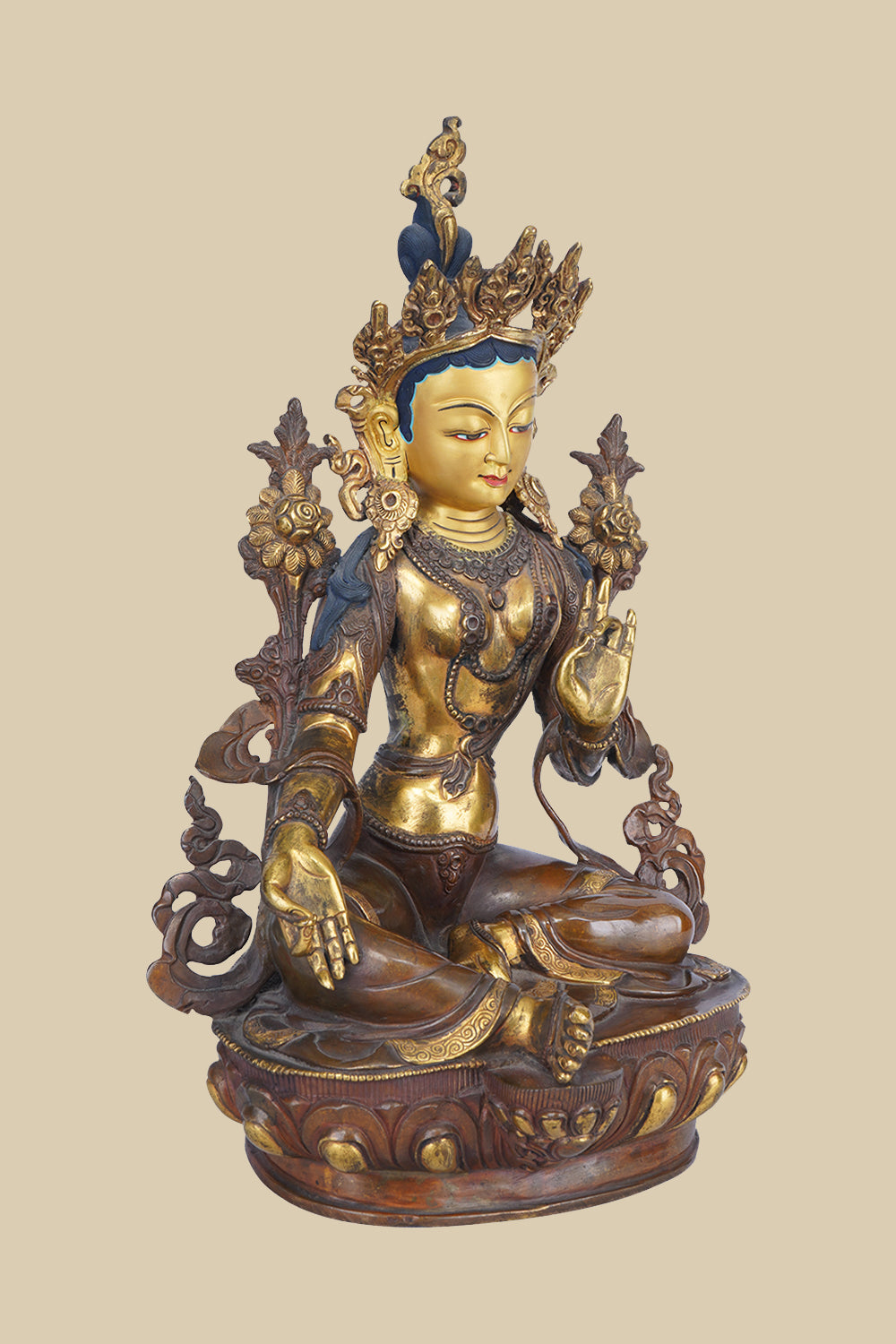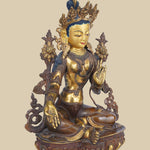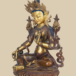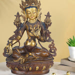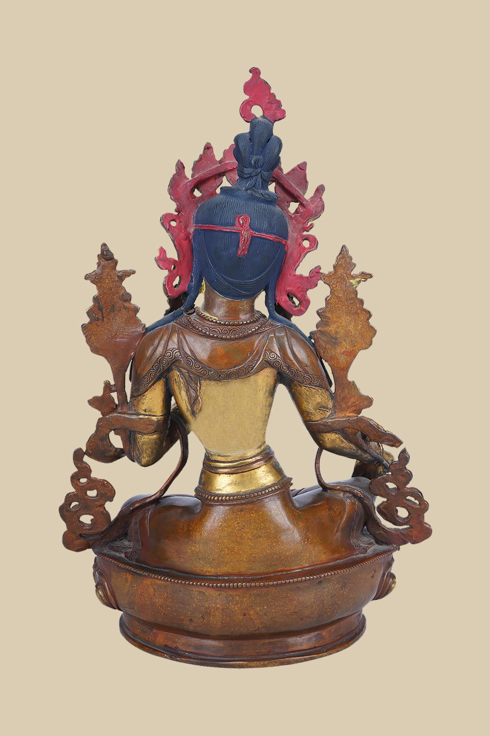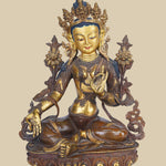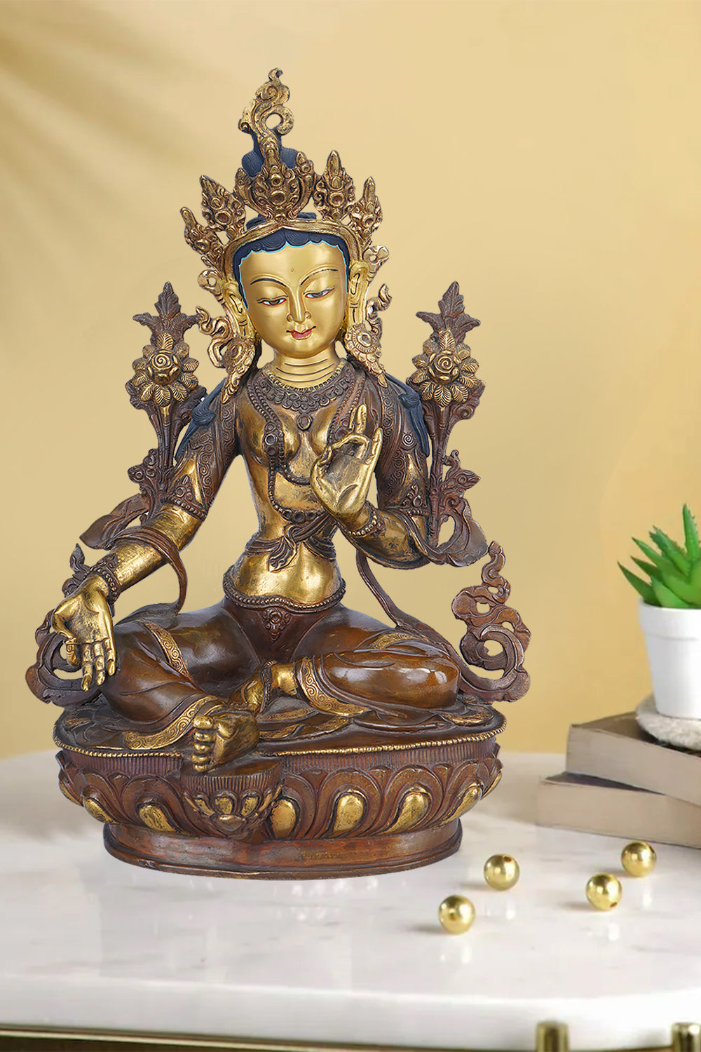 Known for her swift action in alleviating suffering, Green Tara is depicted in a dynamic seated posture, symbolizing her readiness to leap into action to aid those in need. The fine brass construction and radiant gold finish highlight the intricate details of her form, from the delicate folds of her robes to the graceful curvature of her posture.The 33 cm Brass Green Tara statue encapsulates the serene power and compassionate energy of this revered Buddhist goddess.