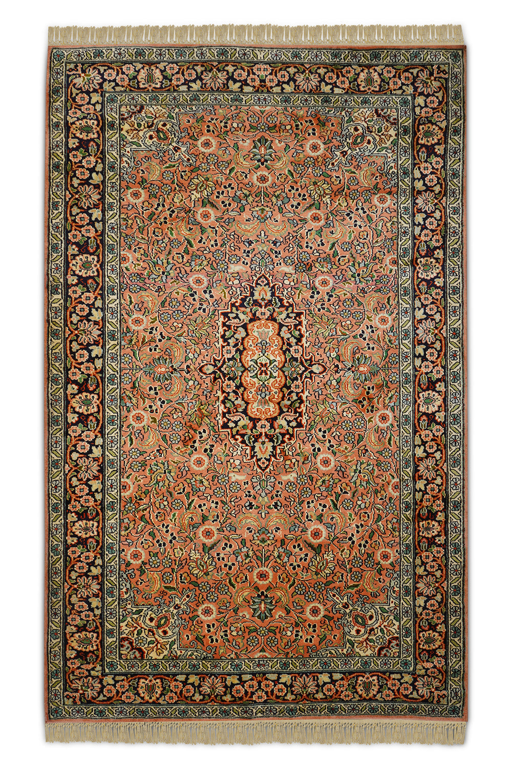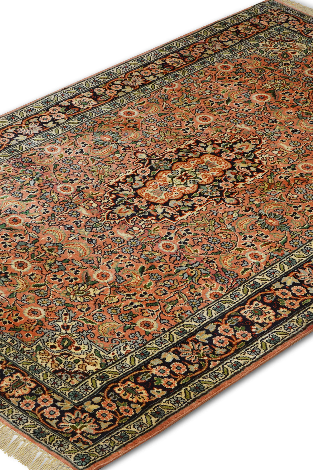 A detailed close-up of the Kirman Persian rug, highlighting its soft, plush texture and intricate floral motifs. The rich peach background contrasts beautifully with navy, green, and ivory accents, showcasing the fine knotting and artistry of traditional Persian weaving.