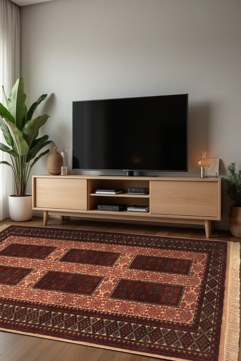 Enhance your space with this rectangular rug, where every thread weaves a narrative of historical legacy and modern warmth. The tribal geometric design, rooted in ancient symbolism, complements both rustic and contemporary interiors with its earthy charm. Ideal for modern homes, it blends durability with a weathered elegance, creating a striking yet inviting focal point. Its neutral tones transform any room, infusing it with a sense of tradition and cultural richness. Discover a rug that brings the spirit of nomadic artistry into today’s living spaces.