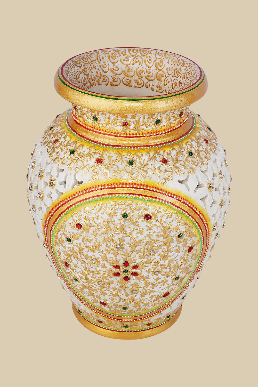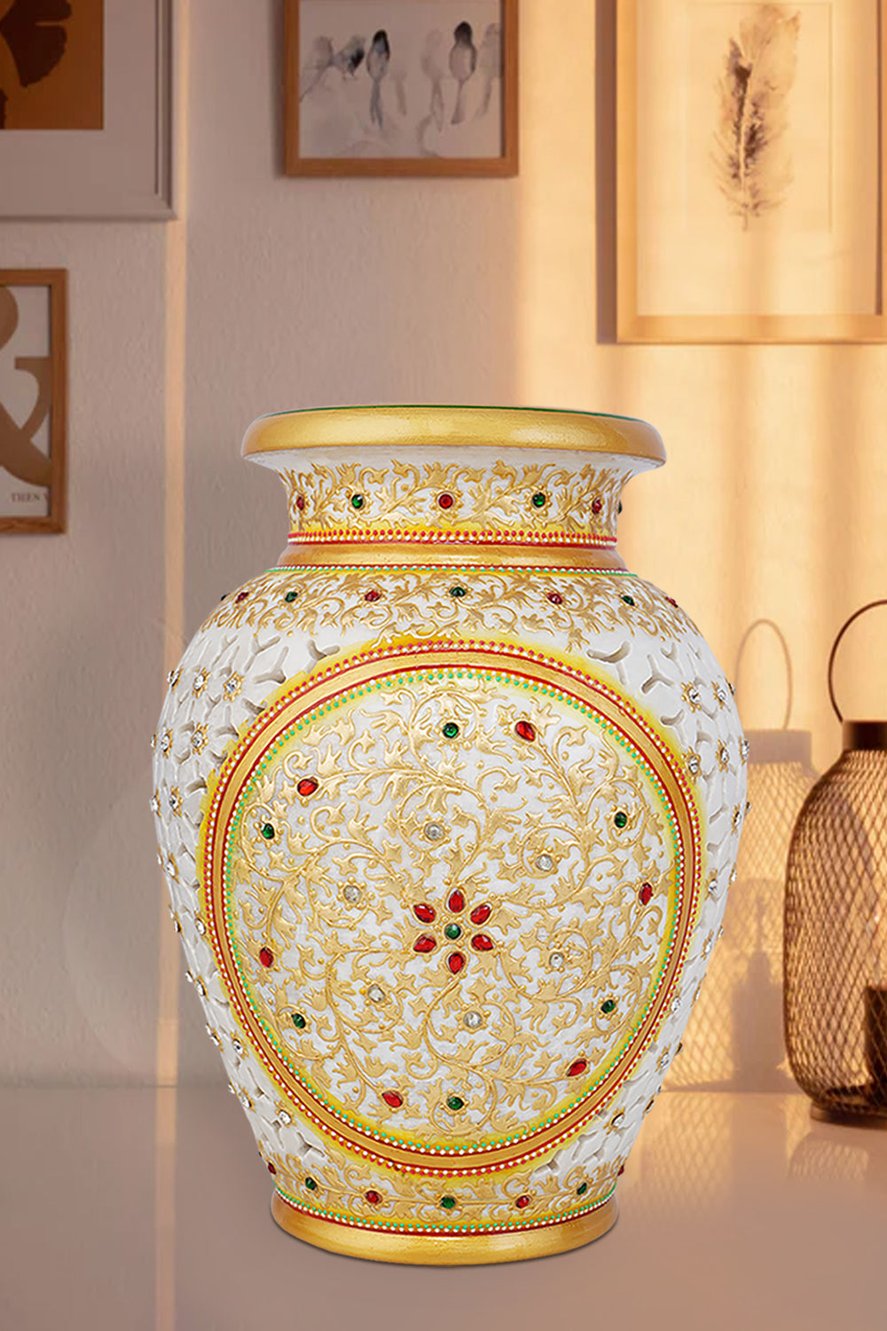 Beautiful white marble flower vase featuring intricate undercut carving, hand-painted with golden floral designs and embellished with embedded red and green gemstones.