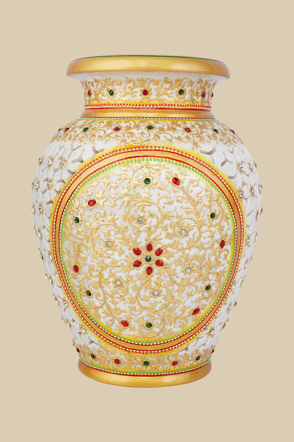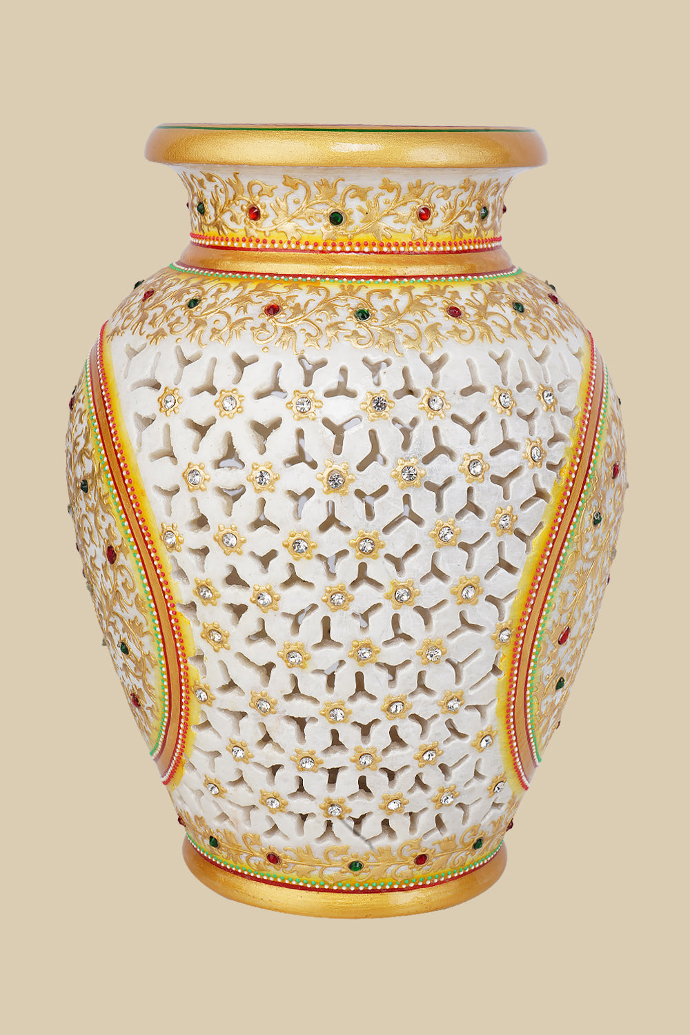 Fashioned from fine marble with intricate undercut detailing, this hand-painted vase measures 25 cm in height. Its elegant white base serves as the foundation for a vibrant design that radiates timeless beauty.  Delicate brushstrokes bring the vase to life with intricate patterns in striking colors, accented by the luxurious gleam of gold. This gilded detailing gracefully highlights the contours of the design, creating a harmonious balance between opulence and subtlety. Hints of red and green stonework are carefully embedded into the piece, adding a jewel-like quality that evokes the regal artistry of ancient decorative statues and figurines. The undercut marble work introduces an additional layer of intricacy, its delicate carving reflecting the patience and skill of master artisans. Each detail is a celebration of heritage, reminiscent of antique sculptures that once adorned royal palaces and temples. The juxtaposition of vibrant colors, shimmering gold, and polished marble creates a symphony of textures and shades that captivate the eye.