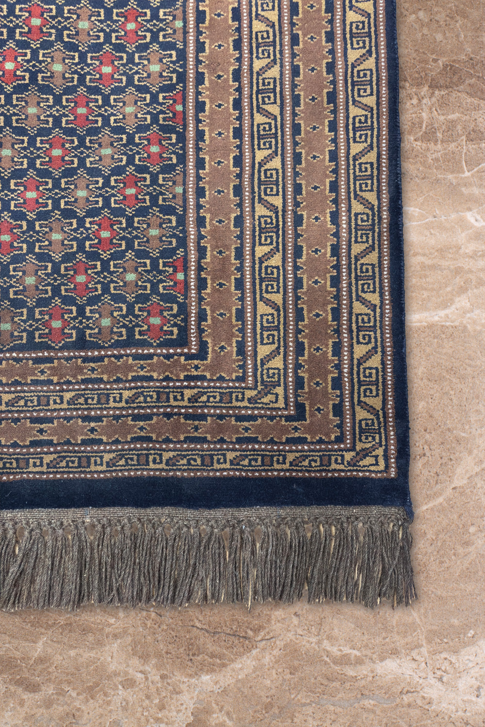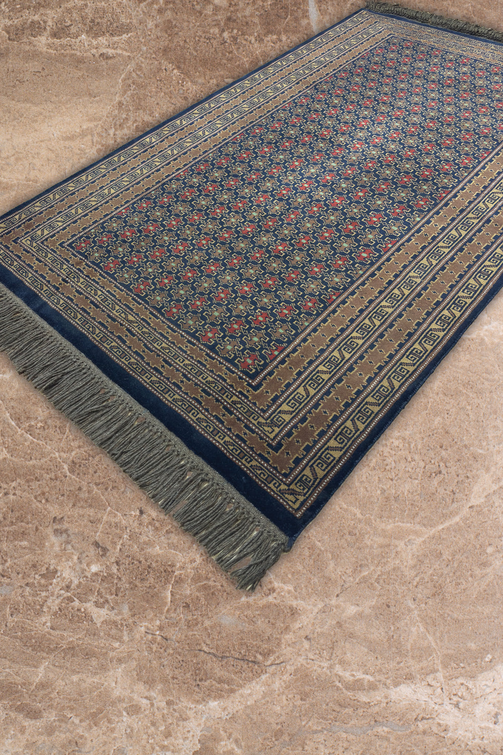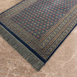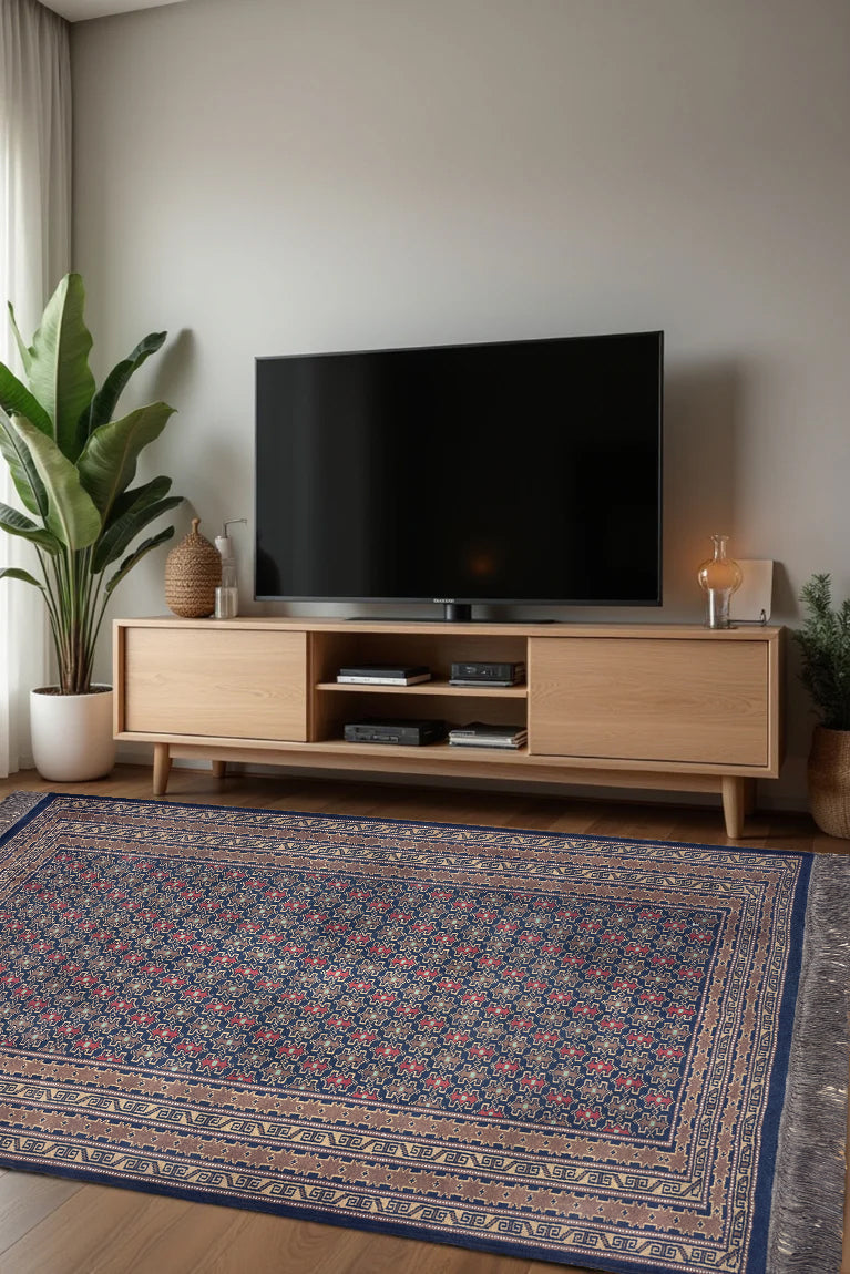 Whether placed in a living room or bedroom, Kalyan enhances the interior with understated luxury. The navy tones introduce refinement, while the brown borders add grounding warmth. With its blend of tradition and versatility, this rug is a statement of enduring craftsmanship.