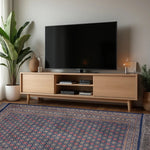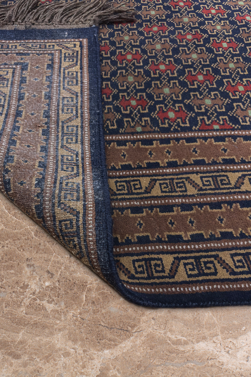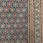 The Kalyan rug showcases a rich interplay of navy and brown in a structured yet lively design. Small repeating motifs bring texture and rhythm across the field, with red highlights adding vibrancy. Framed by a wide border of earthy brown, the rug achieves harmony between boldness and restraint.