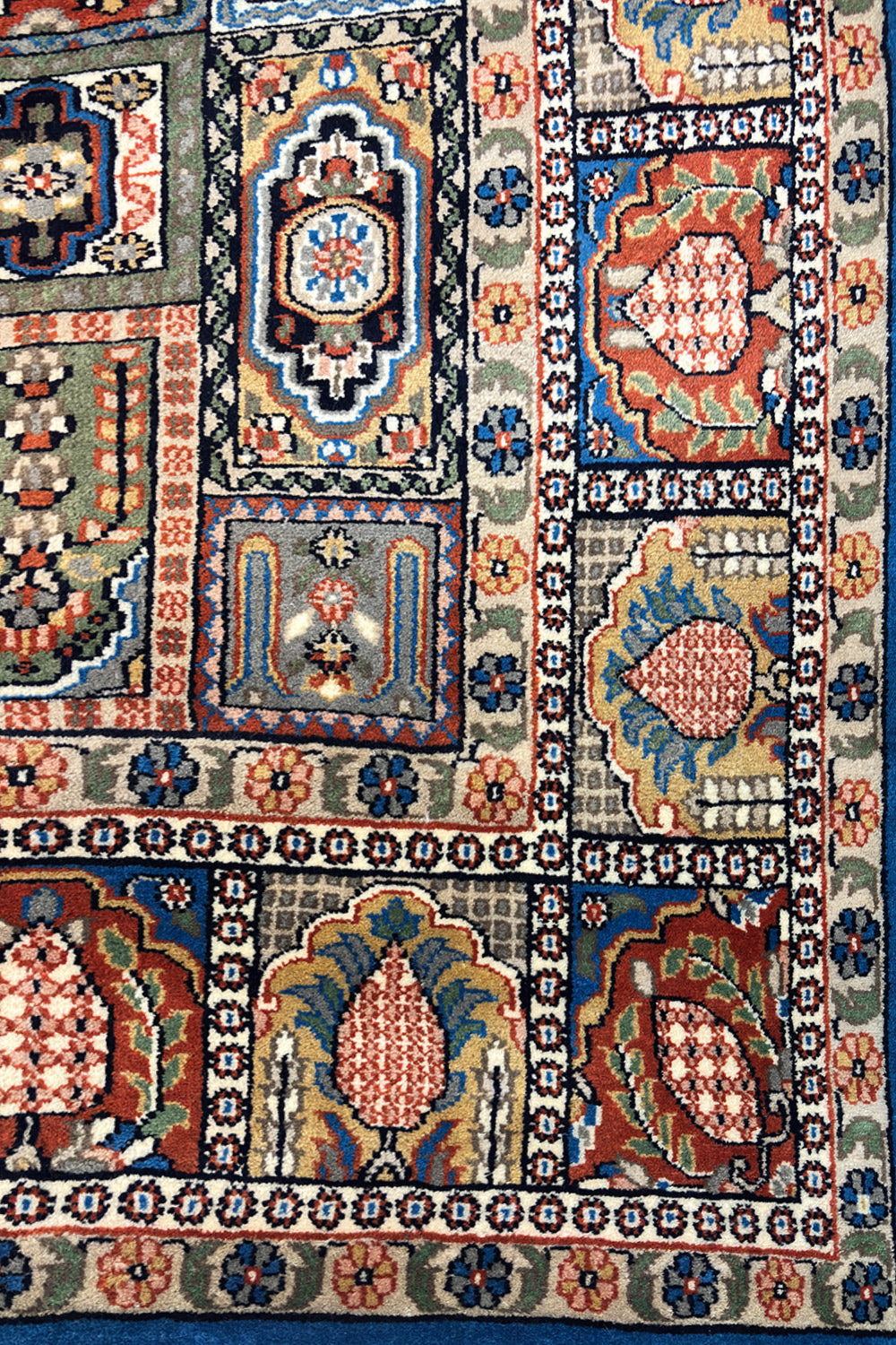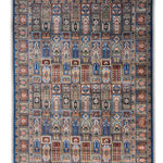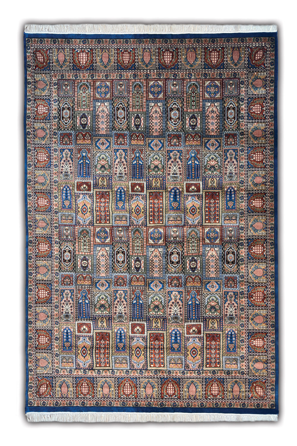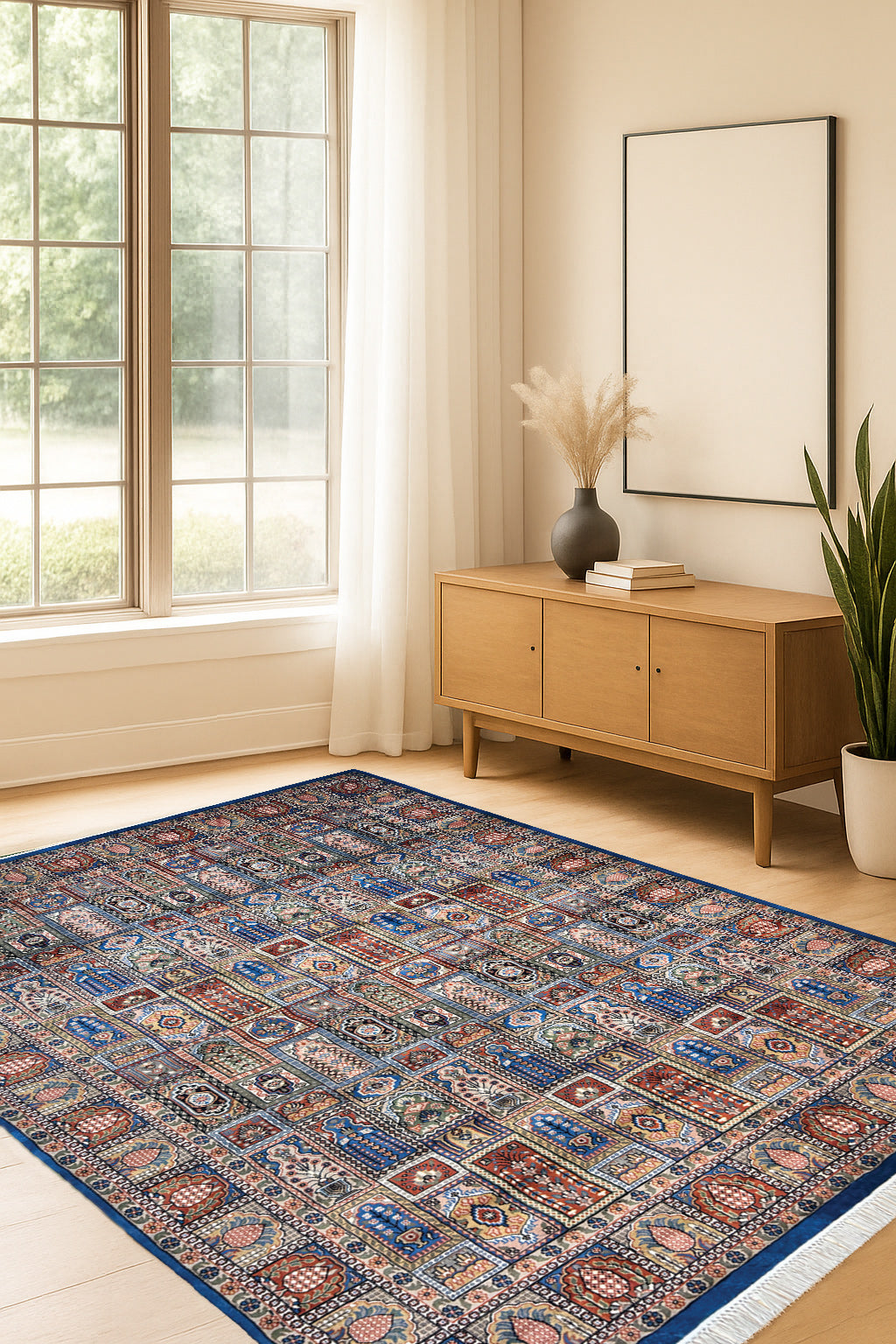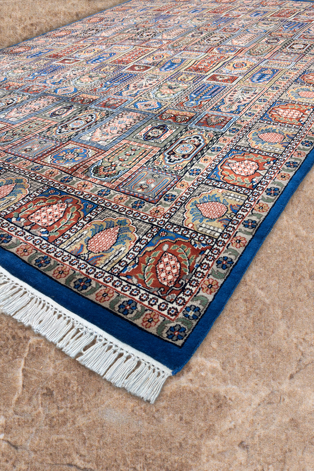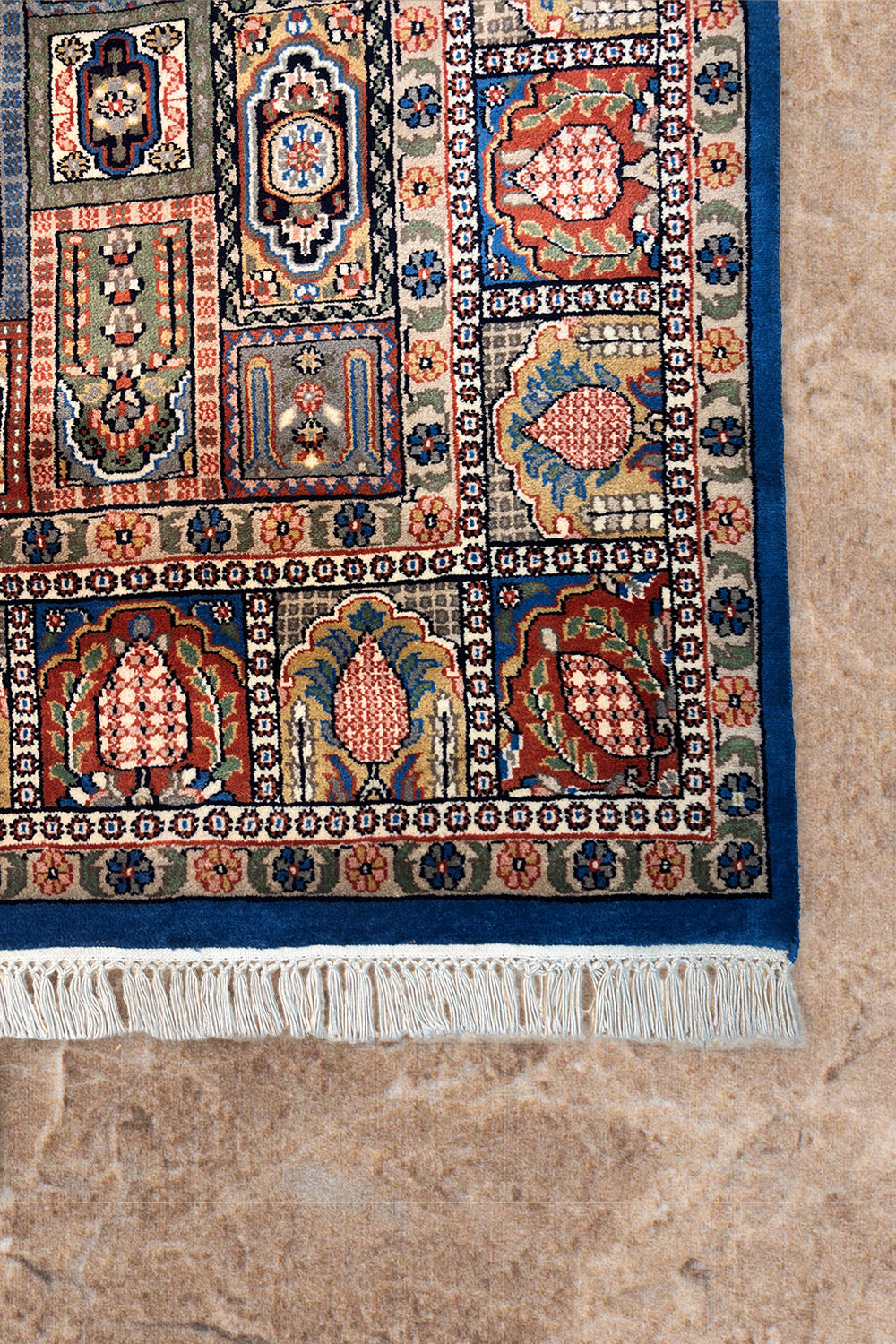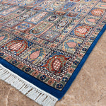 The Karun rug is a celebration of geometry and heritage, where repeating motifs unfold across an ivory cream backdrop enriched with cobalt blue accents. Each panel is a world in itself—ornate, symmetrical, and infused with cultural storytelling. Hand knotted in fine wool, Karun represents the patience and artistry of master weavers, creating a piece that is both visually striking and timeless.