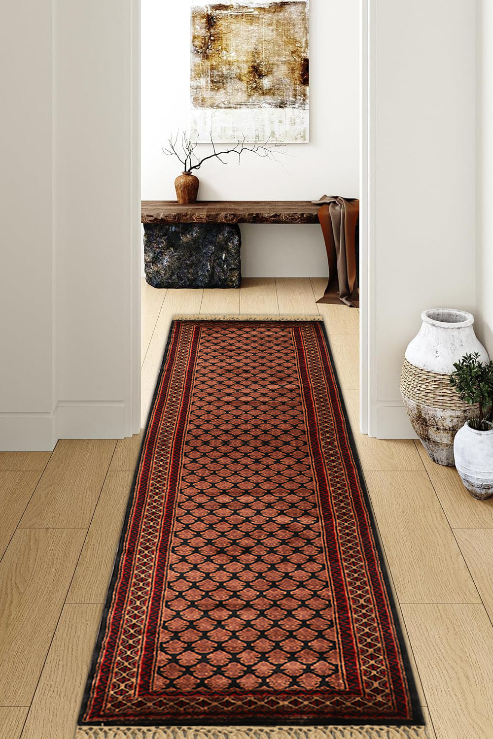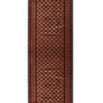 Elevate your home with this runner rug, where every knot weaves a story of historical depth and modern warmth. The tribal geometric design, rooted in ancient Persian symbolism, complements both traditional and contemporary interiors with its bold patterns. Ideal for modern homes, it blends durability with a cozy aesthetic, creating a striking yet inviting pathway. Its rich tones transform any space, infusing it with a sense of cultural richness and timeless strength. Discover a rug that connects the past’s artistry with today’s living environments.