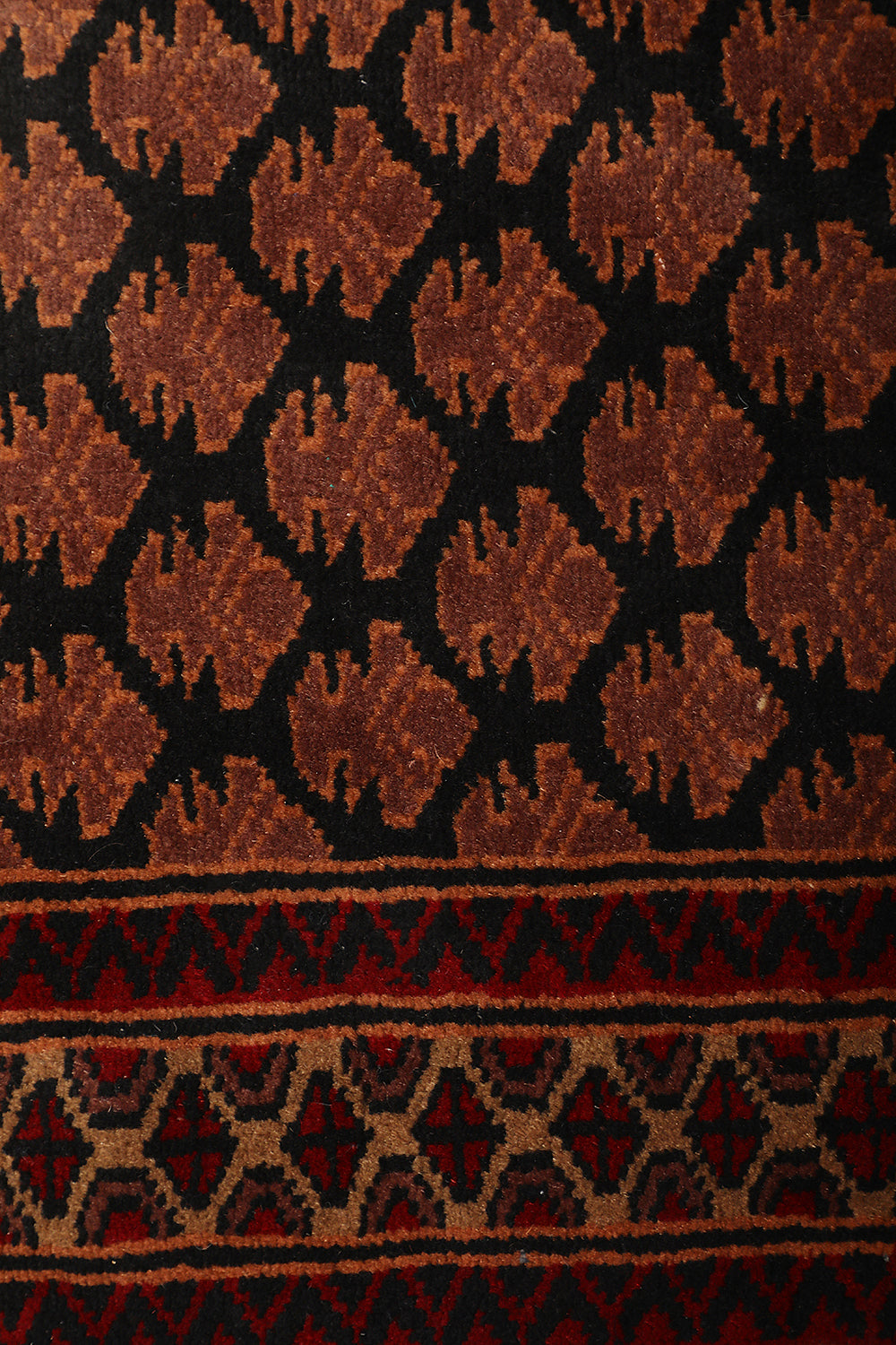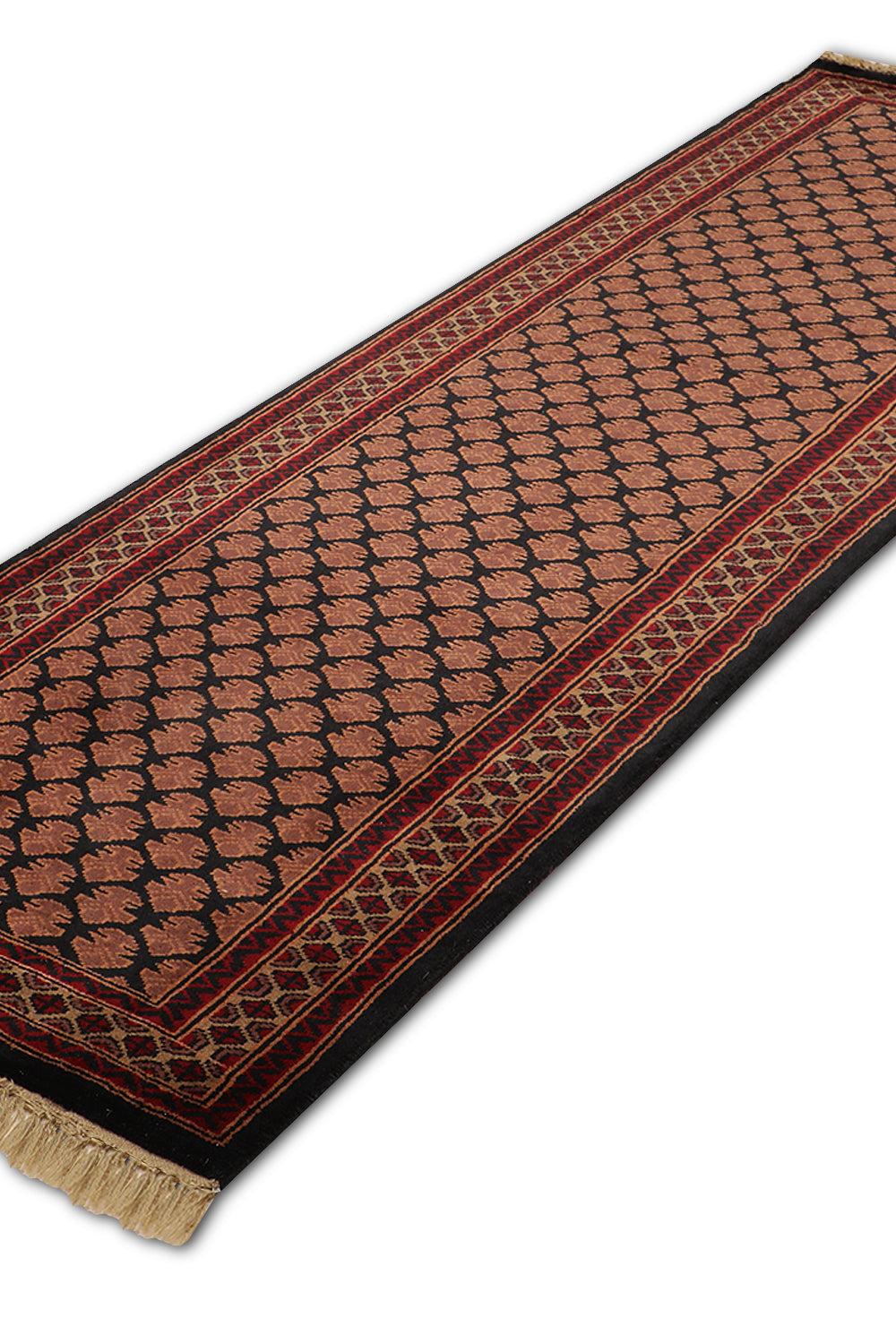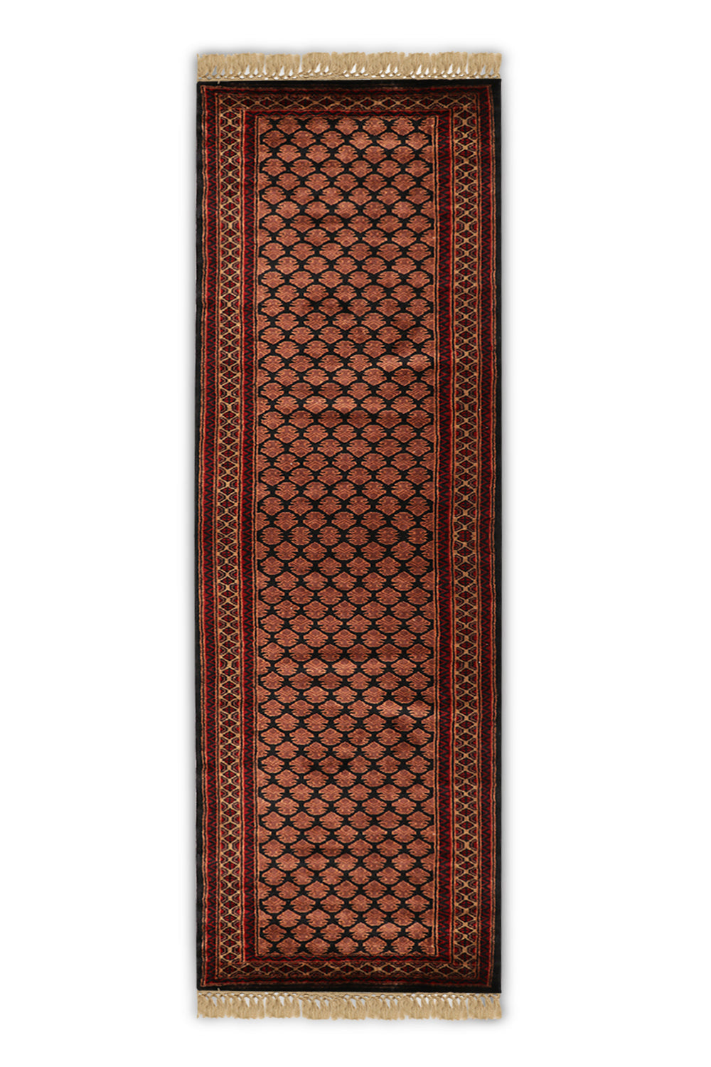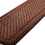 Enhance your hallway with the Kashan rug, a skillfully hand-knotted runner from our Junoon Collection that embodies the essence of tribal craftsmanship. This 2.6 x 8 ft wool rug, featuring a medium pile with a mild soft texture, showcases a series of diamond and geometric motifs in deep navy twilight, earthy walnut brown, and hints of soft mocha. Its design draws from Persian and Central Asian traditions, where geometric patterns symbolized protection and unity since ancient times, often woven into tribal runners for nomadic and ceremonial use. These motifs, reflecting cultural narratives of resilience and community, influenced textile arts across trade routes, blending heritage with rustic appeal. The tactile feel makes it perfect for hallways seeking a grounded accent.
