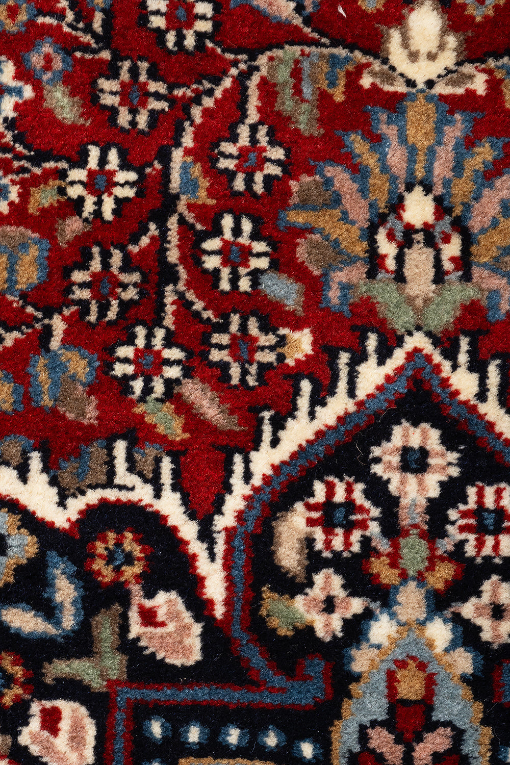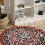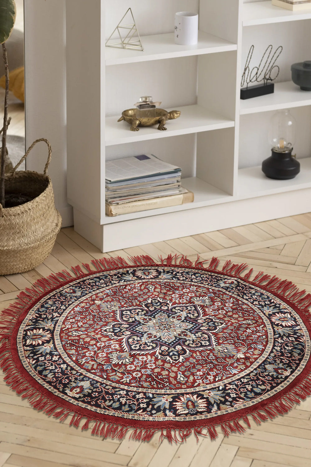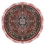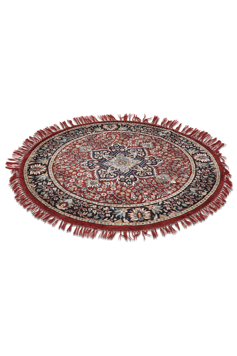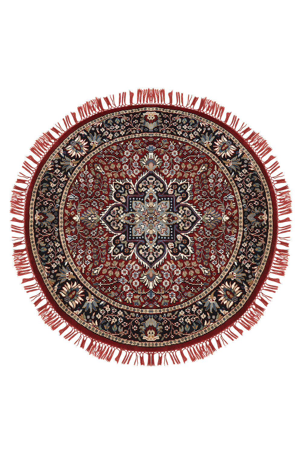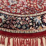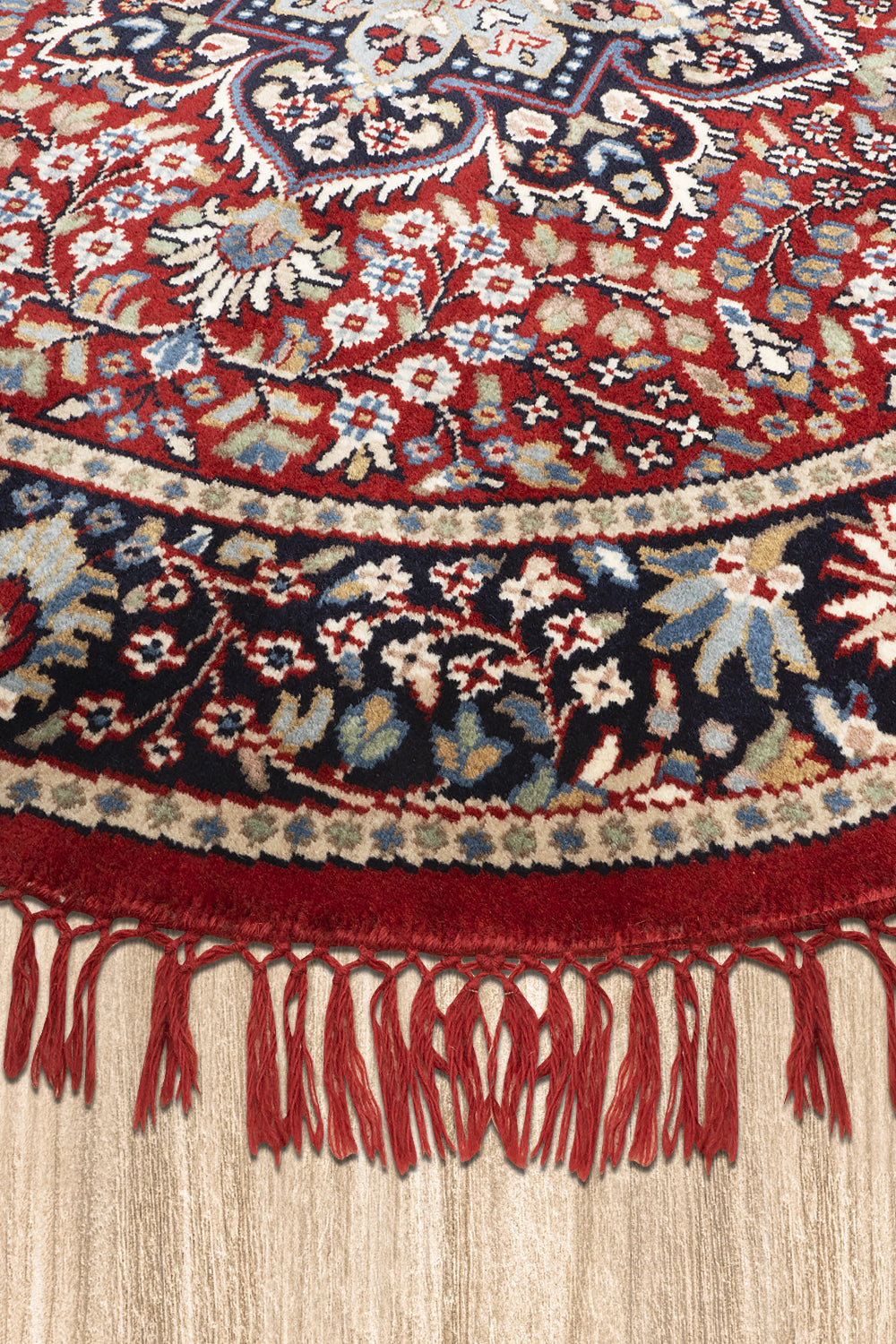The Virasat Collection introduces a stunning fusion of colors and craftsmanship with this traditional oriental Kashan design carpet. The rich crimson red and deep navy hues intertwine to create a bold yet refined visual narrative, capturing the intricate beauty of the Kashan design. Hand-knotted in luxurious wool, this carpet strikes the perfect balance between a mild softness and a medium pile, making it an excellent choice for hallways or living rooms. Its circular form adds a unique touch to any space, effortlessly becoming a standout centerpiece.