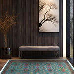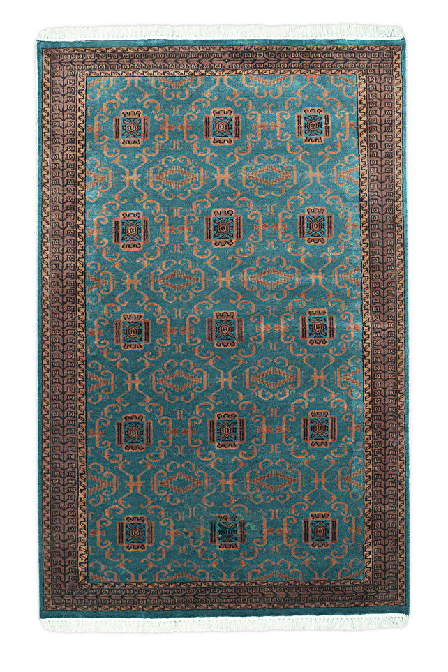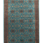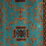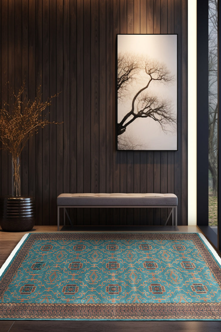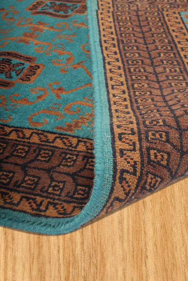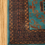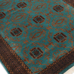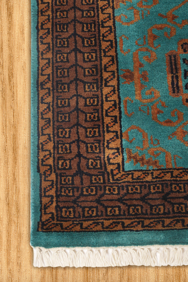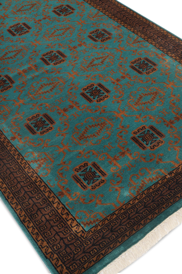Step into the timeless allure of tribal craftsmanship with the Khorasan rug, a striking piece from our Junoon Collection that honors ancient weaving artistry. This 4x6 hand-knotted wool rug, featuring a medium pile, showcases a pattern of geometric medallions in vibrant turquoise blue, earthy sienna brown, and hints of copper rust. Its design echoes the tribal rugs of Central Asia, particularly the Turkmen "Gul" patterns, symbolizing fertility, protection, and tribal identity since the 18th century. These motifs, woven into rugs for dowries and ceremonial use, carried deep cultural narratives, reflecting the nomadic lifestyle’s resilience and community spirit. The mild soft texture underfoot adds a cozy feel, ideal for living rooms or bedrooms seeking a heritage-inspired accent.