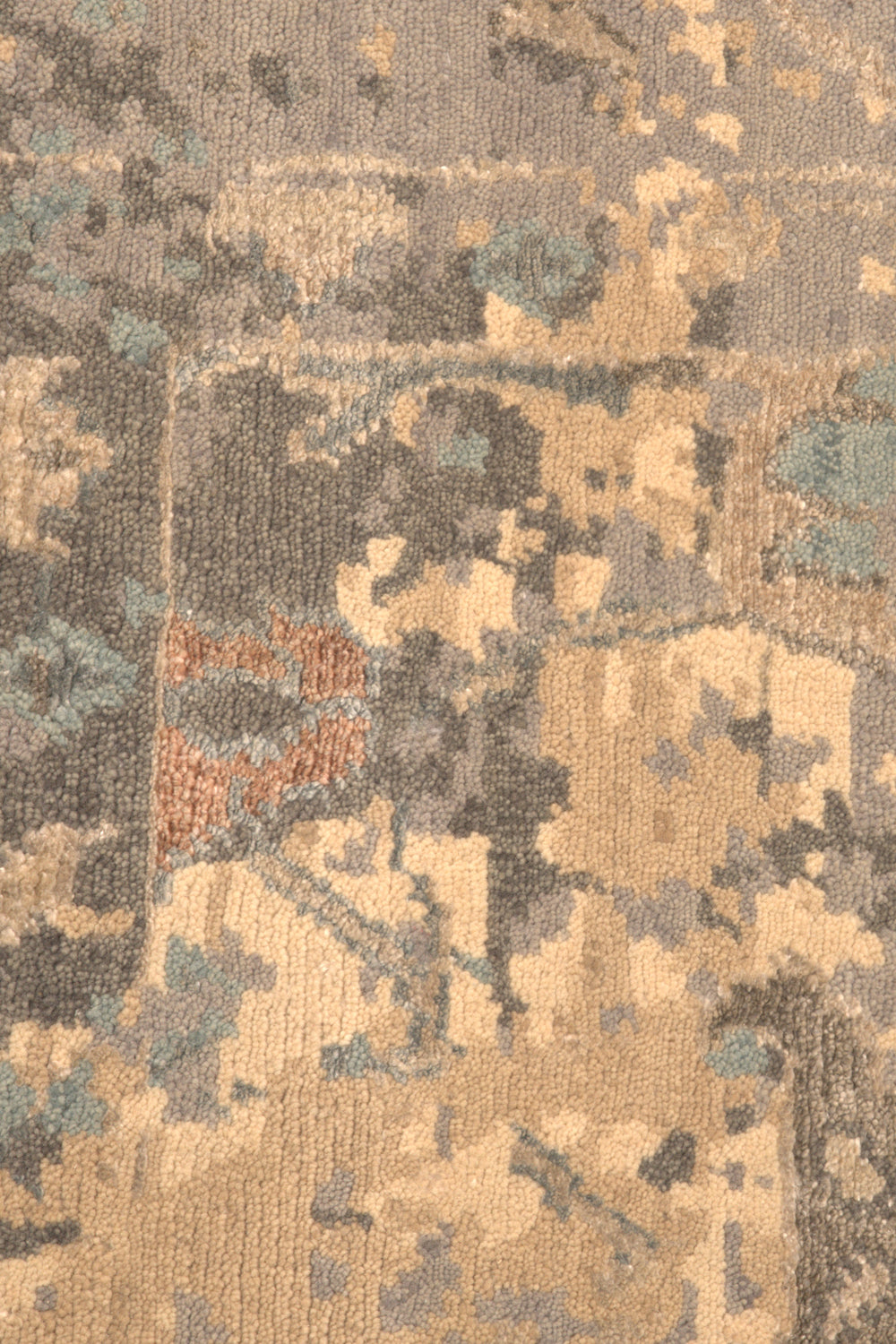 Discover the captivating allure of modern design with the Kshetra-Vichar rug, a remarkable piece from our Odyssey Collection that exemplifies skilled craftsmanship. This 6 x 9 ft hand-knotted wool rug, featuring a medium pile with a mild soft texture, showcases an abstract pattern of asymmetrical brushstroke shapes and faded gradients in cool slate grey, warm beige taupe, and hints of soft ash. Its design draws inspiration from Persian textile traditions, where faded textures and organic shapes symbolized the passage of time and natural impermanence since the 17th century, often woven into rugs for ceremonial use. These patterns, reimagined in an abstract form, influenced global decorative arts through trade routes, blending cultural depth with contemporary appeal. The cozy feel underfoot makes it ideal for living rooms or dining rooms seeking a refined statement.