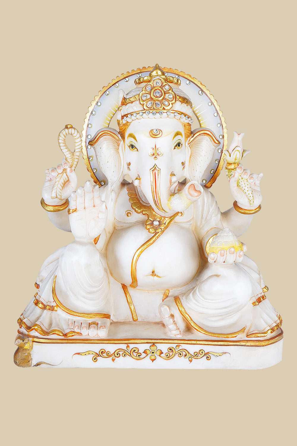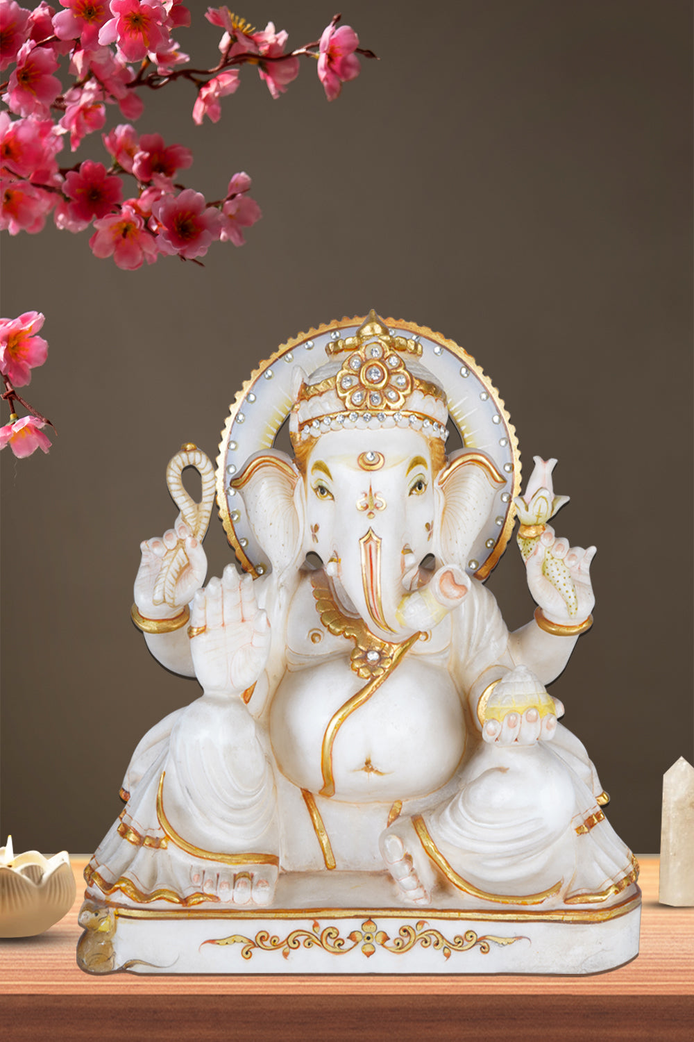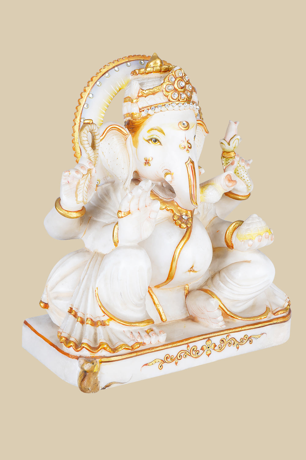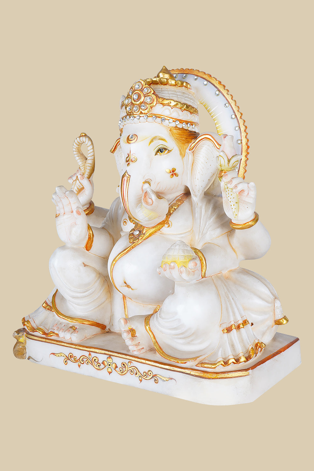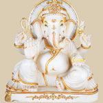 This marble statue of Lord Ganesha channels the essence of prosperity, divinity and craftsmanship. Hand-carved from pristine marble, this sculpture radiates prosperity and calm, wisdom, and auspicious energy. Lord Ganesha, revered as the remover of obstacles and the forerunner of success and new beginnings, is depicted seated gracefully, exuding peace and divine presence.