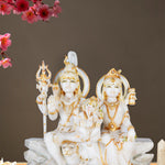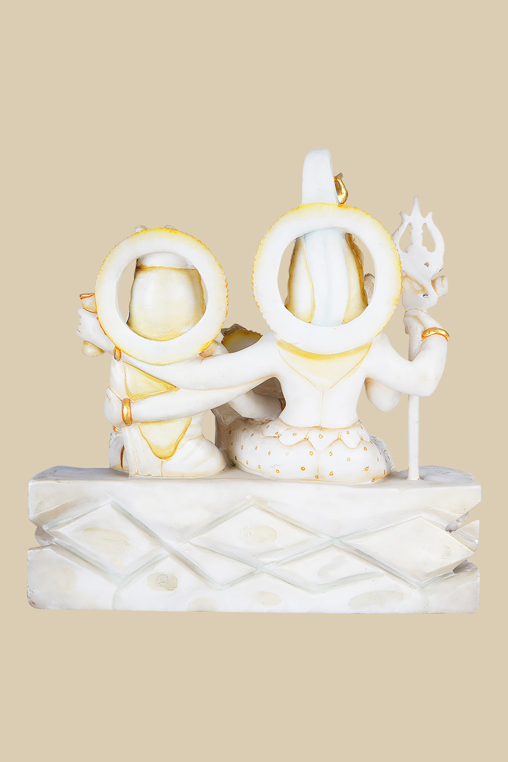 This is an intricate showcase of Shiva's Family, that symbolizes the essence of unity of family. Hand-carved from pure marble, this sculpture features Lord Shiva, Goddess Parvati, and their child Lord Ganesha seated together in serene harmony. One can also see Shiva’s ride (Nandi) and Parvati’s tiger in the frame too. The composition embodies familial love, cosmic balance, and the essence of divine blessings.