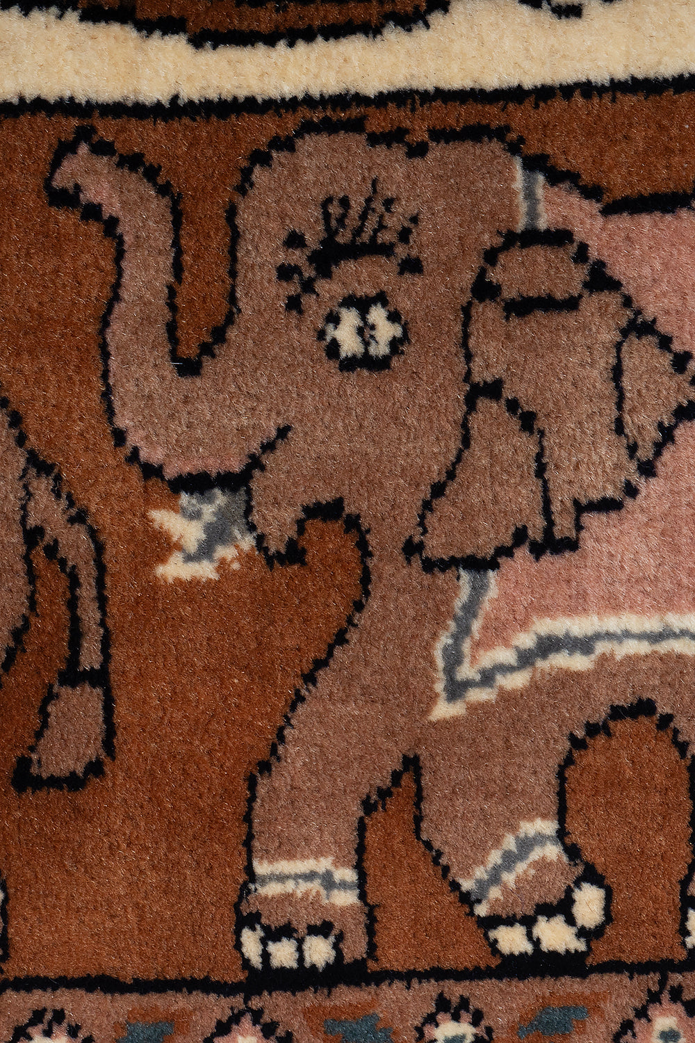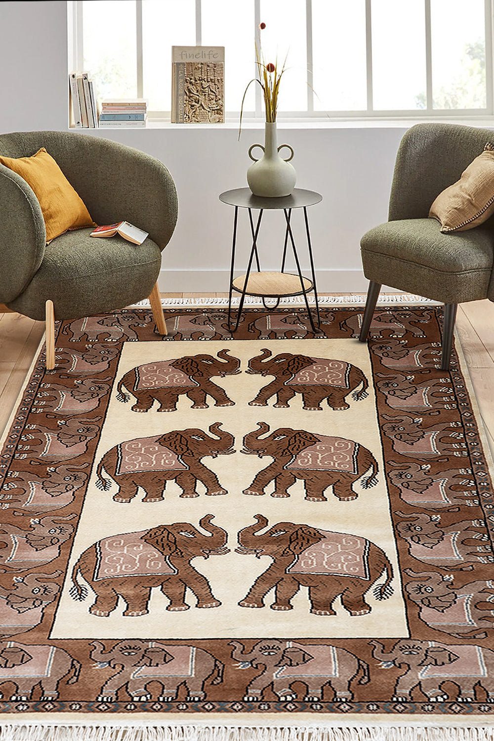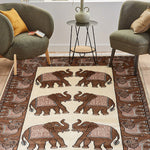 In the harmonious amalgamation of cream and brown, our Sangam Collection nestles a transitional figurative rug that features elephants standing symmetric to each other, decorated in traditional Jaipuri back covering. Elephants, back in the day, were a popular mode of transport and this carpet features them in an aesthetic light. that merges artistry with simplicity. Hand-knotted in wool, this 4x6 rectangular rug brings the timeless craft of rug-making to modern interiors, weaving a story that celebrates tradition and creativity.