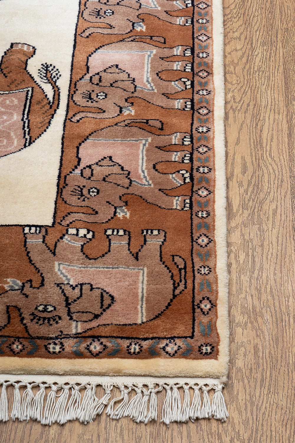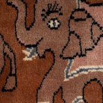 One can notice the beautiful border work that also features a caravan of walking elephants. Every fiber of this rug tells a tale of authenticity, from the meticulous craftsmanship to the medium pile that provides a luxurious yet durable finish. Its mild soft texture invites warmth and comfort, ensuring it is as functional as it is beautiful. Whether anchoring a contemporary living space or enhancing a classic room, this designer carpet seamlessly blends the past and present.