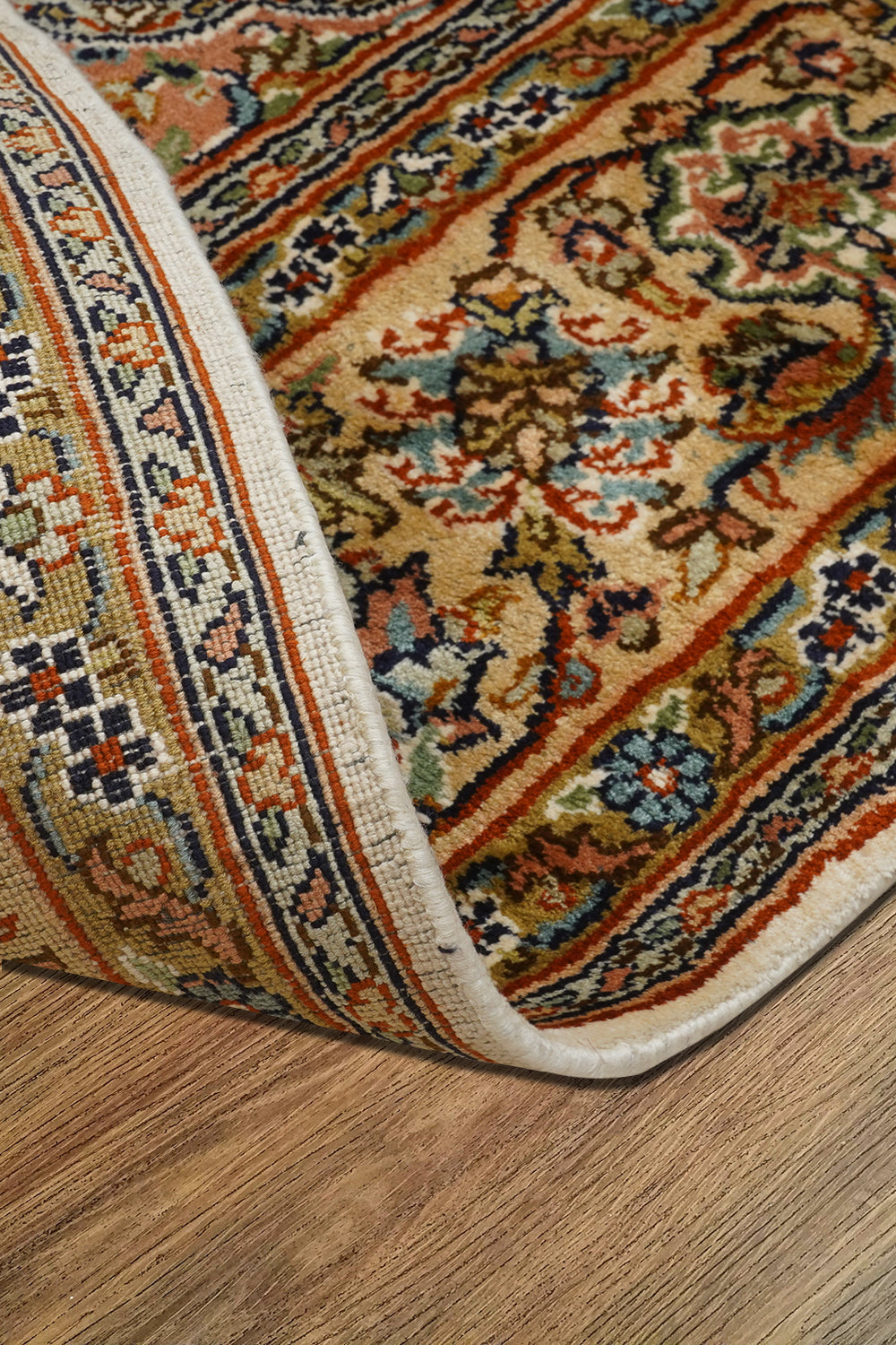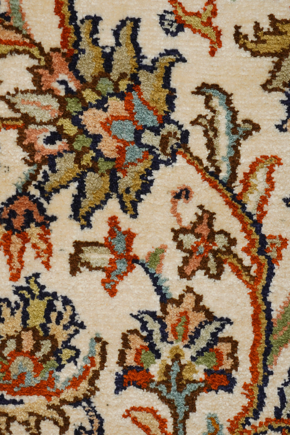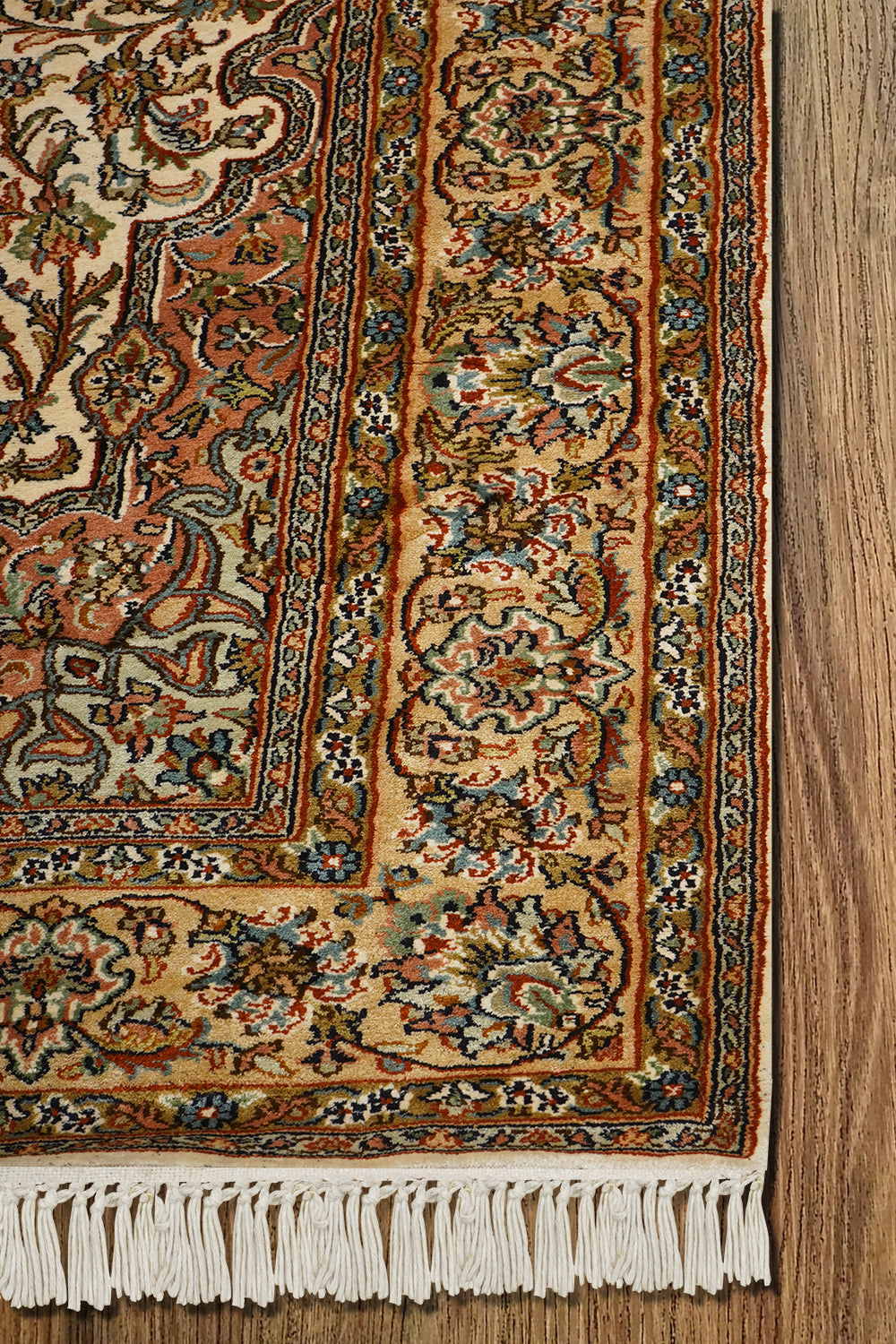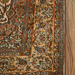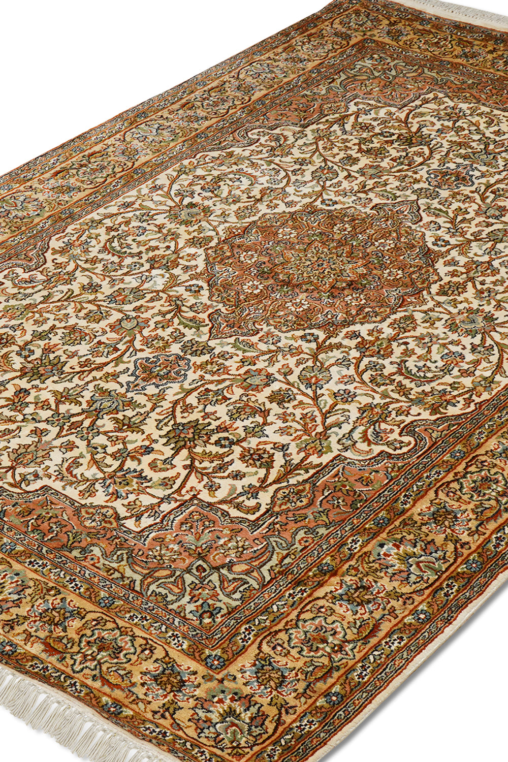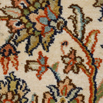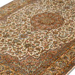 The medallion at its heart, adorned with curving vines and blooming florals, captures the elegance of nature in full bloom—a homage to the vibrant gardens of Isfahan. The russet and ebony tones of the borders embrace the creamy expanse of the central field, creating a harmonious interplay of color and design. This artistic masterpiece reflects both the enduring Persian influence and India’s unparalleled skill, making it a true heirloom.