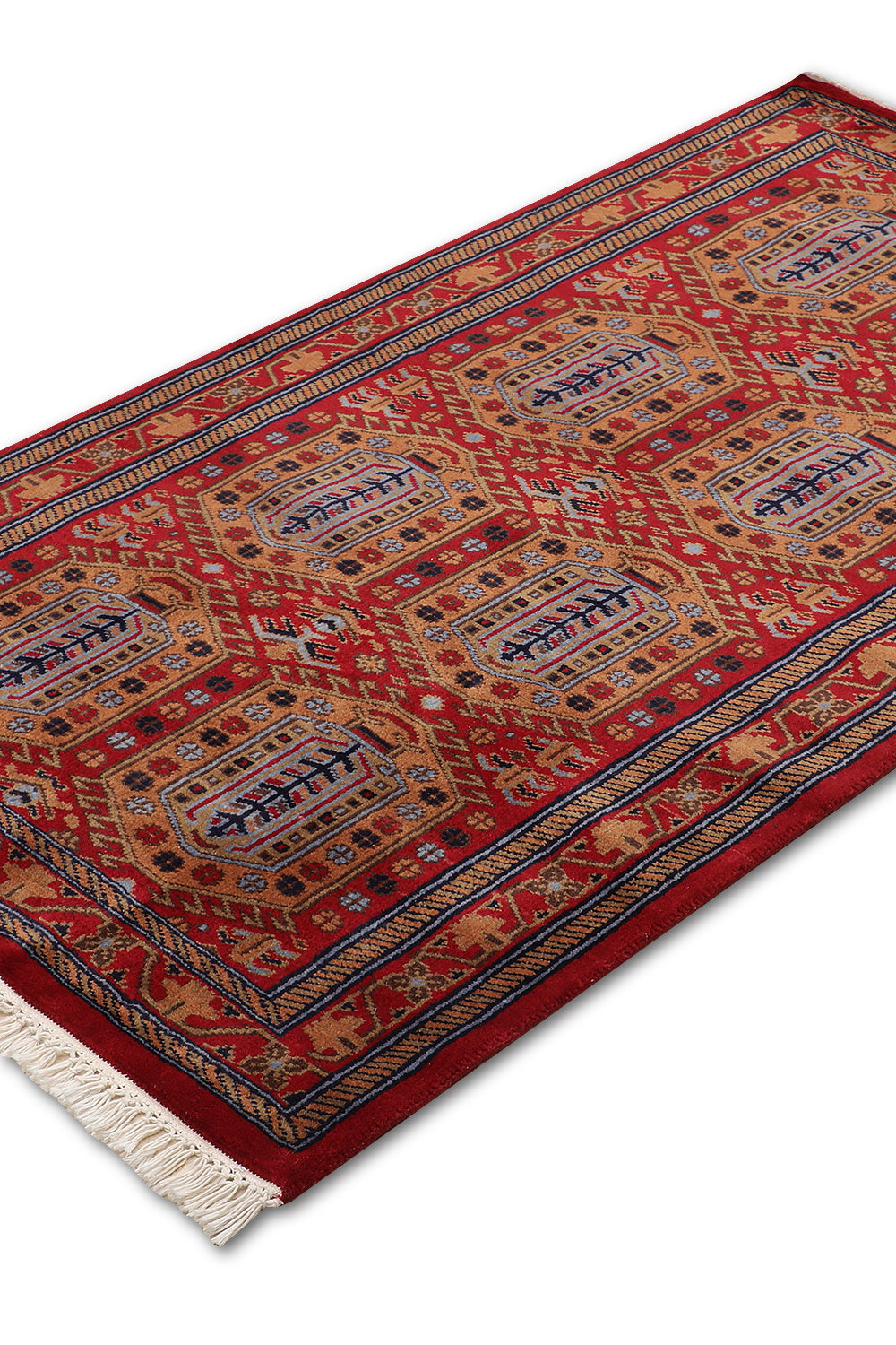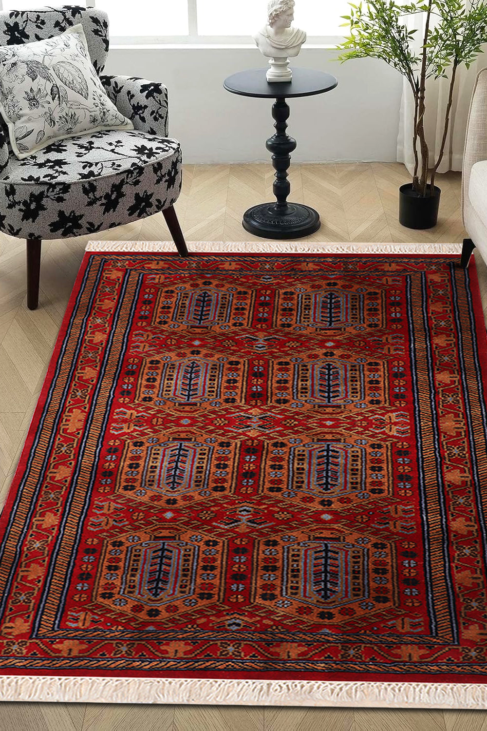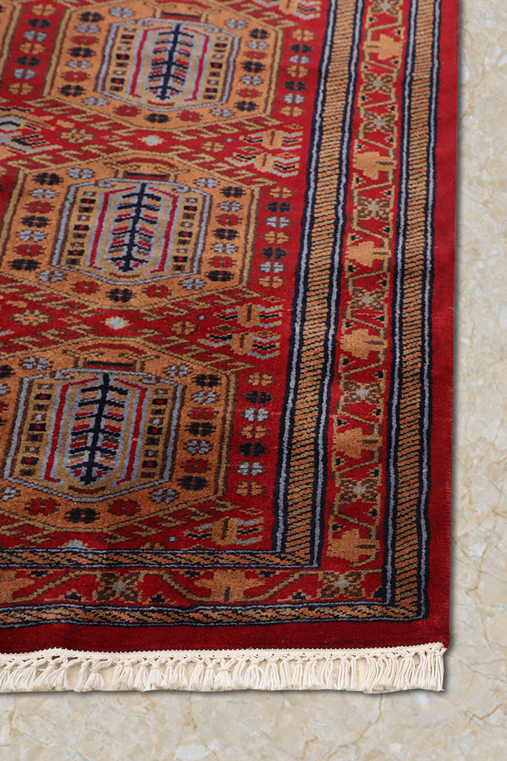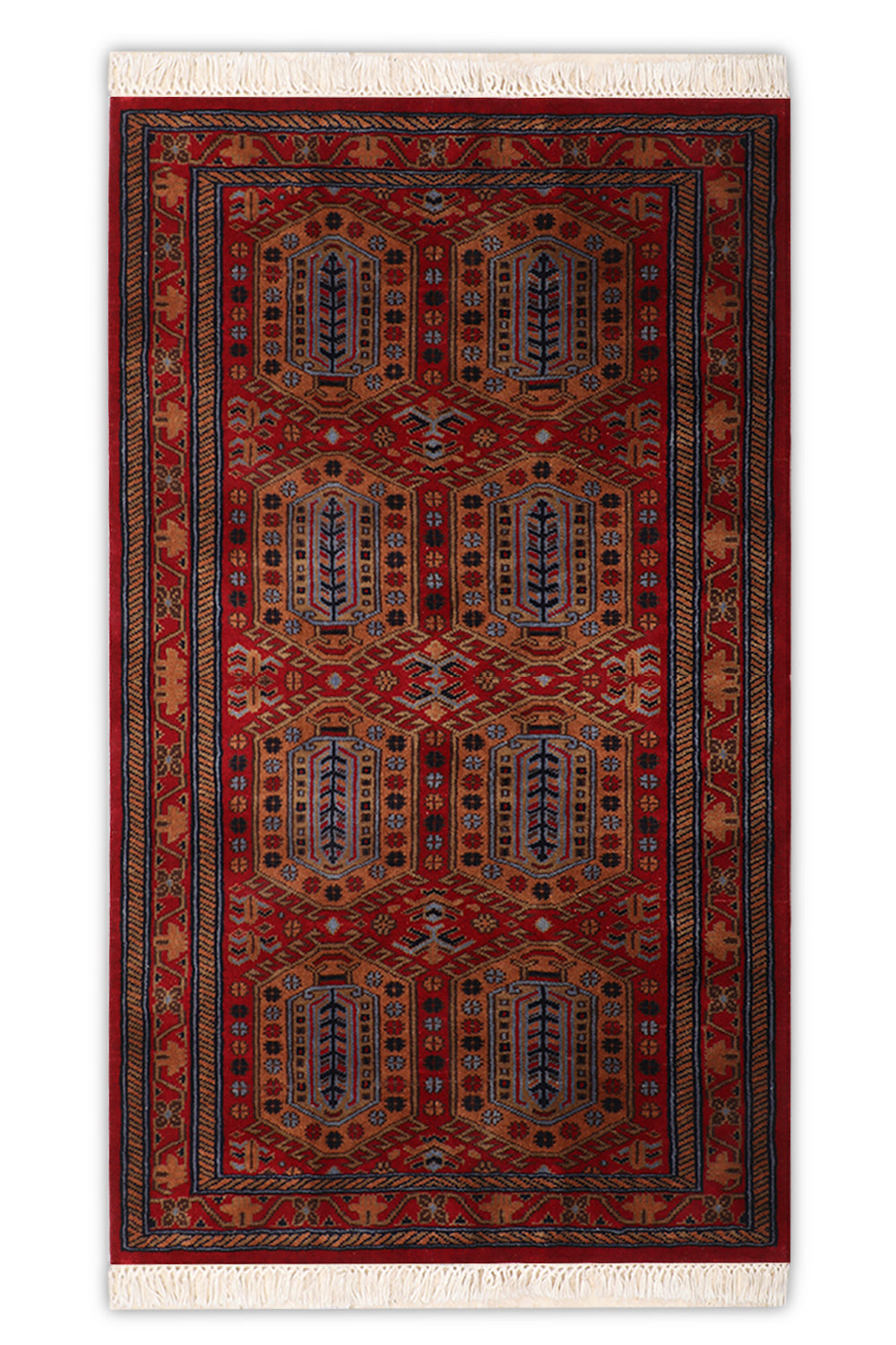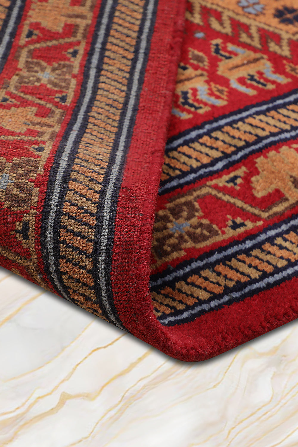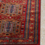 Bring rustic charm to your space with the Mahsa rug, a carefully hand-knotted piece from our Junoon Collection that embodies tribal artistry. This 3 x 5 ft wool rug, featuring a medium pile with a mild soft texture, showcases a series of diamond and geometric motifs in bold maroon claret, deep walnut brown, and hints of earthy taupe. Its design draws from Persian and Central Asian traditions, where geometric patterns symbolized protection and unity since ancient times, often woven into tribal rugs for nomadic and ceremonial use. These motifs, reflecting cultural narratives of resilience and community, influenced textile arts across trade routes, blending heritage with timeless appeal. The cozy texture makes it ideal for living rooms or bedrooms seeking a grounded accent.