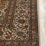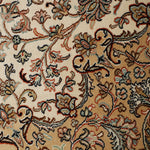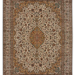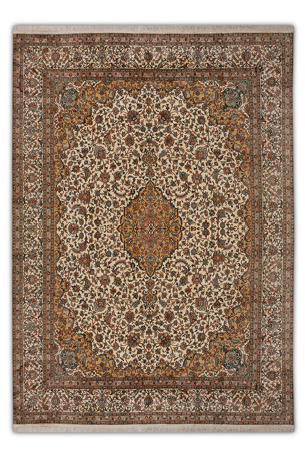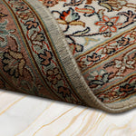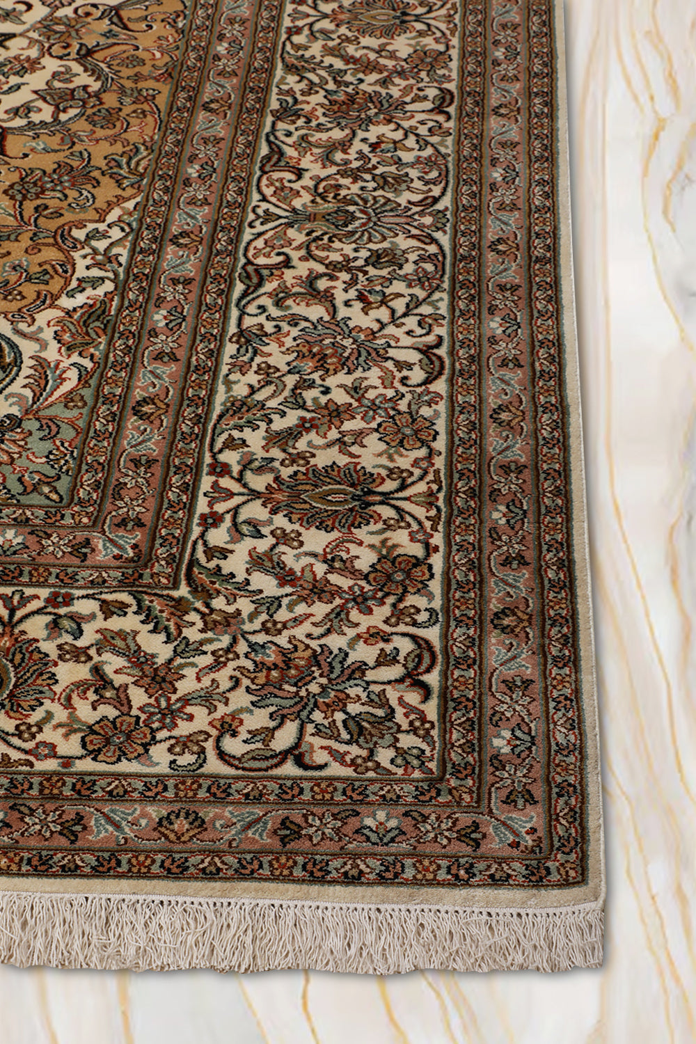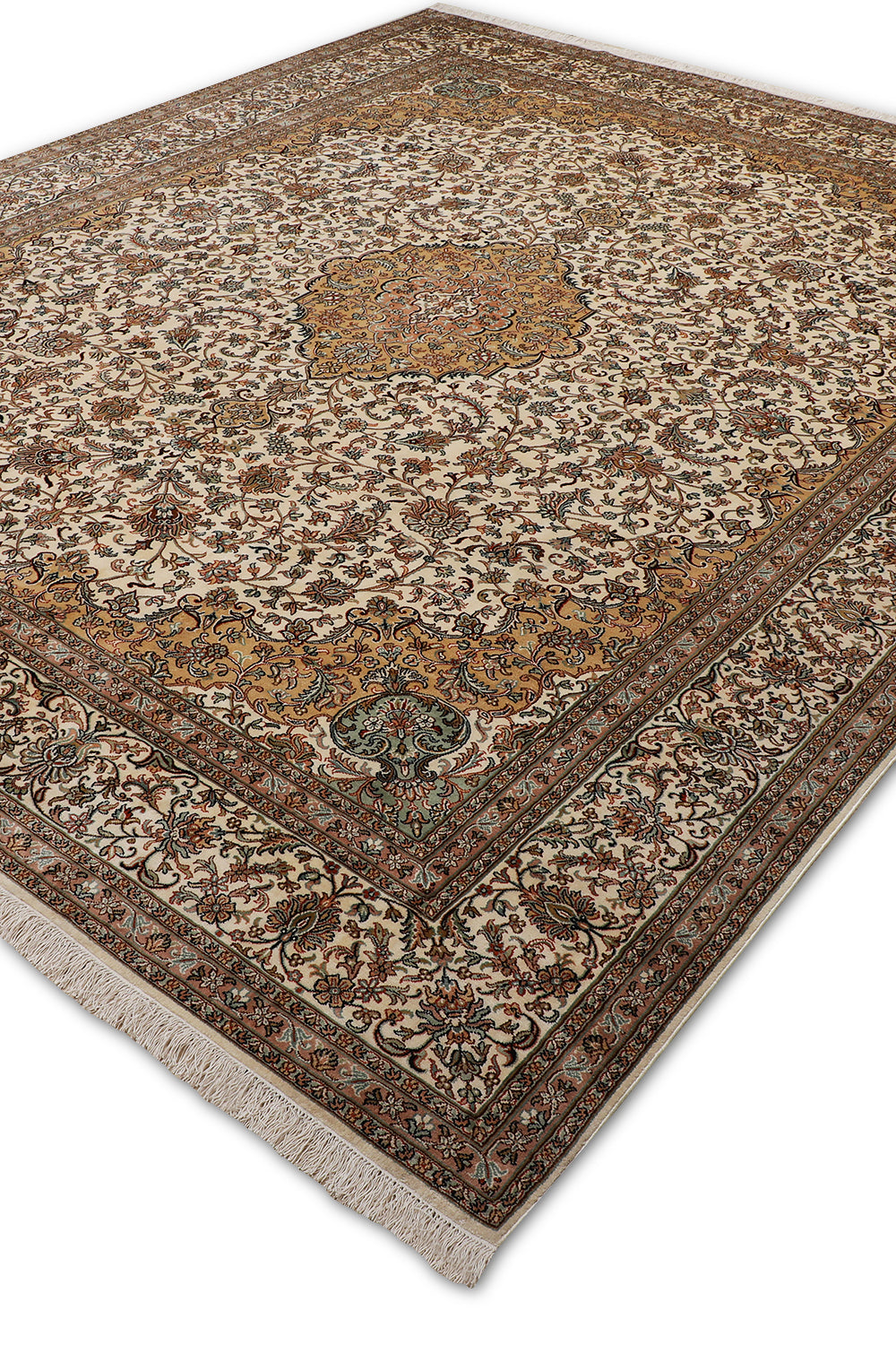 Elevate your space with the Marika rug, a stunning hand-knotted silk piece from our Virasat Collection that reflects the richness of Oriental artistry. This 8 x 10 ft rug, featuring a low pile with a soft texture, showcases a central medallion with intricate floral and vine motifs in creamy ivory pearl, warm ivory blush, and hints of soft beige. Its design draws from Persian and Central Asian traditions, where medallions and floral patterns symbolized harmony and abundance since the 16th century, often crafted into silk rugs for royal and ceremonial settings. These motifs, embodying cultural narratives of prosperity and elegance, influenced textile arts across trade routes, blending heritage with timeless beauty. The delicate texture makes it ideal for living rooms or dining rooms seeking a luxurious touch.