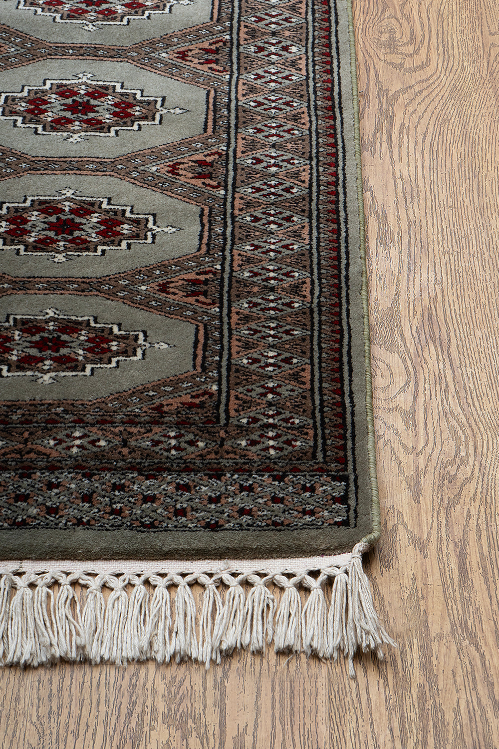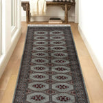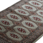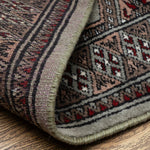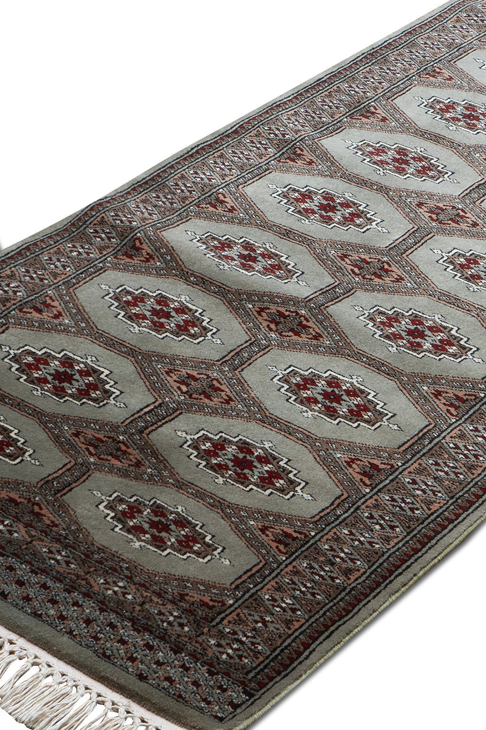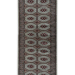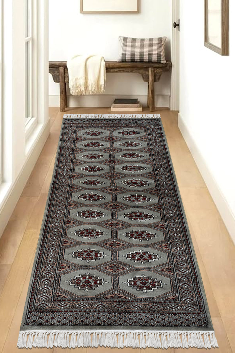 Step into a world of earthy elegance with the tribal Runner from the Junoon Collection. In a harmonious blend of olive green and maroon, this 2.6x8 hand-knotted wool masterpiece pays homage to the rich heritage of tribal carpets, showcasing the intricate beauty of Turkmen Bokhara design.