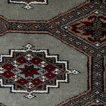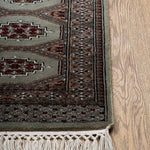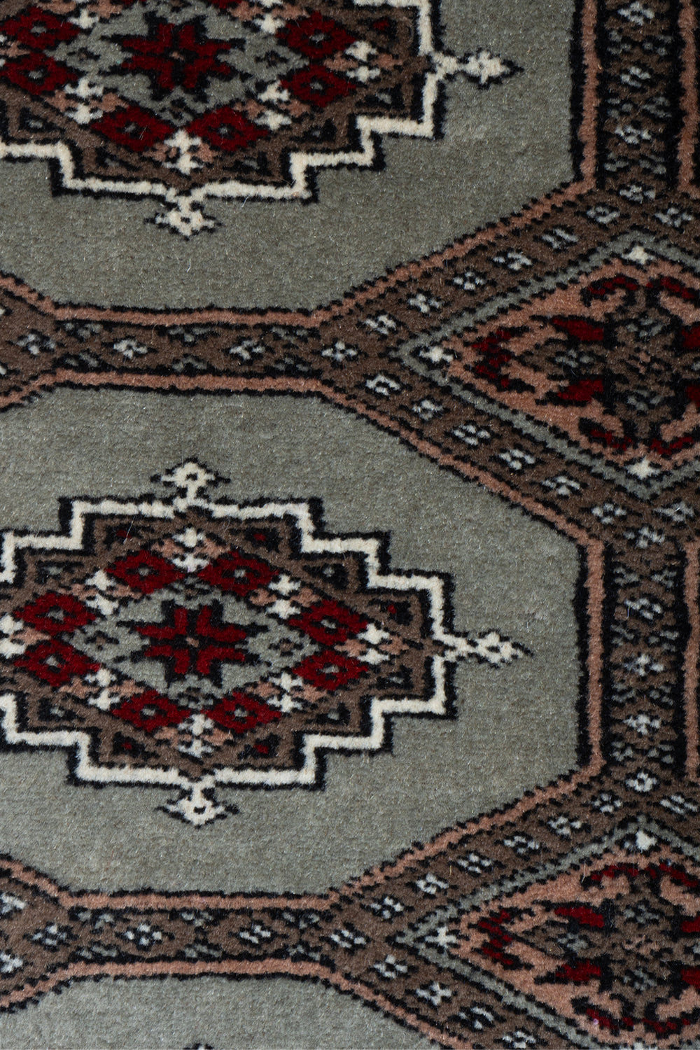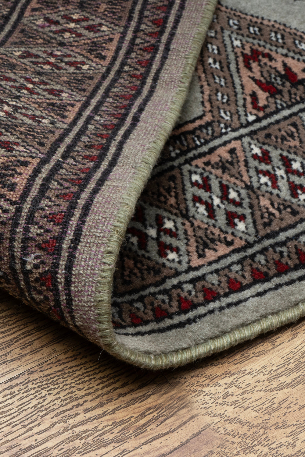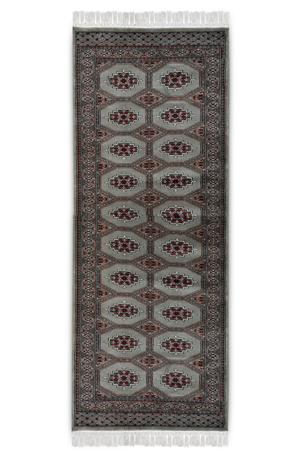 Step into a world of earthy elegance with the tribal Runner from the Junoon Collection. In a harmonious blend of olive green and maroon, this 2.6x8 hand-knotted wool masterpiece pays homage to the rich heritage of tribal carpets, showcasing the intricate beauty of Turkmen Bokhara design.