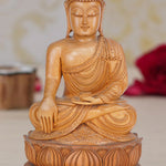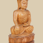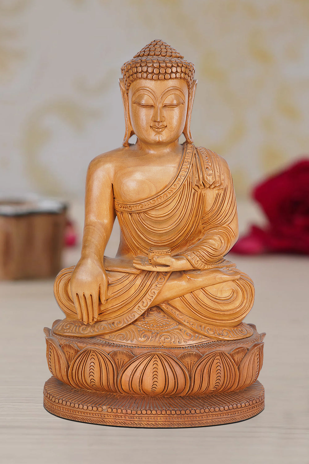 Carved from richly textured wood, the Buddha statue (30 cm x 21 cm x 12 cm) radiates serenity and wisdom. This hand-carved masterpiece portrays Buddha in a meditative pose, with tranquil features that seem to invite peace into the space it adorns. The warm tones of the wood add an earthy, grounding quality, emphasizing the spiritual connection between nature and the divine.