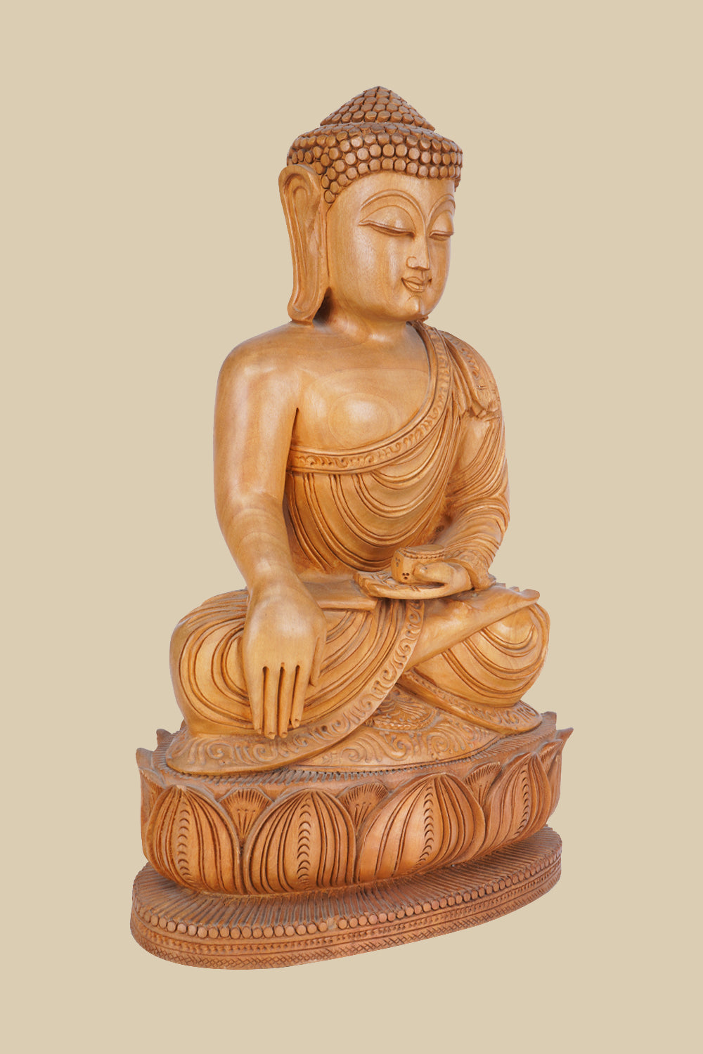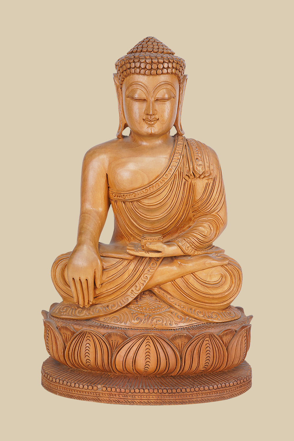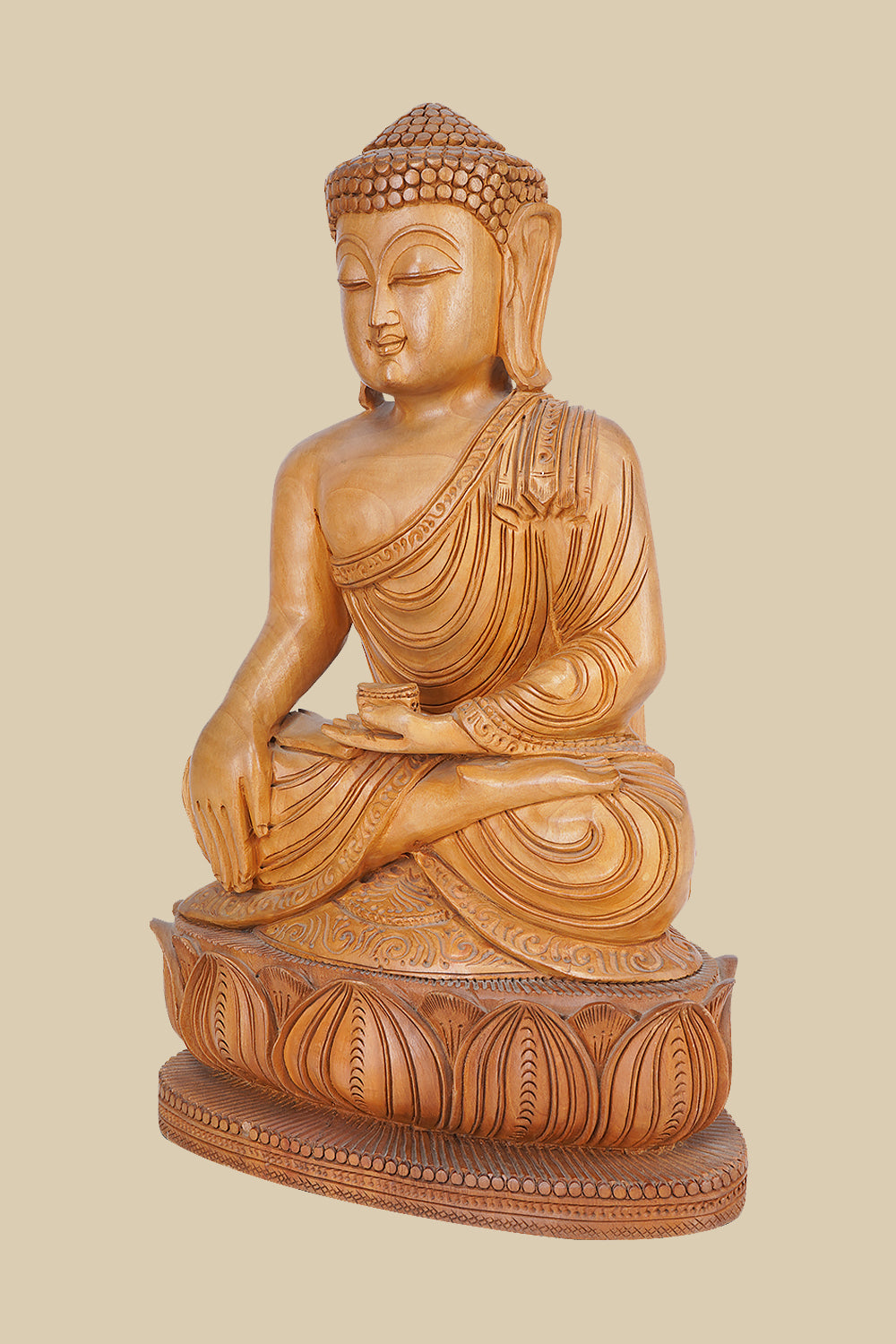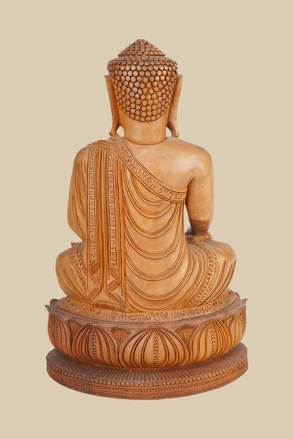 The artistry in this sculpture lies in the intricate carvings that highlight Buddha’s serene expression and flowing robes. Each curve and line reflects the devotion and skill of the craftsman, bringing to life a figure that has inspired millions across centuries. The wood’s natural grains add depth to the sculpture, making it as tactile as it is visually captivating. Whether placed in a meditation room, a living area, or as part of an antique collection, it creates a tranquil atmosphere and celebrates the enduring appeal of Indian craftsmanship.