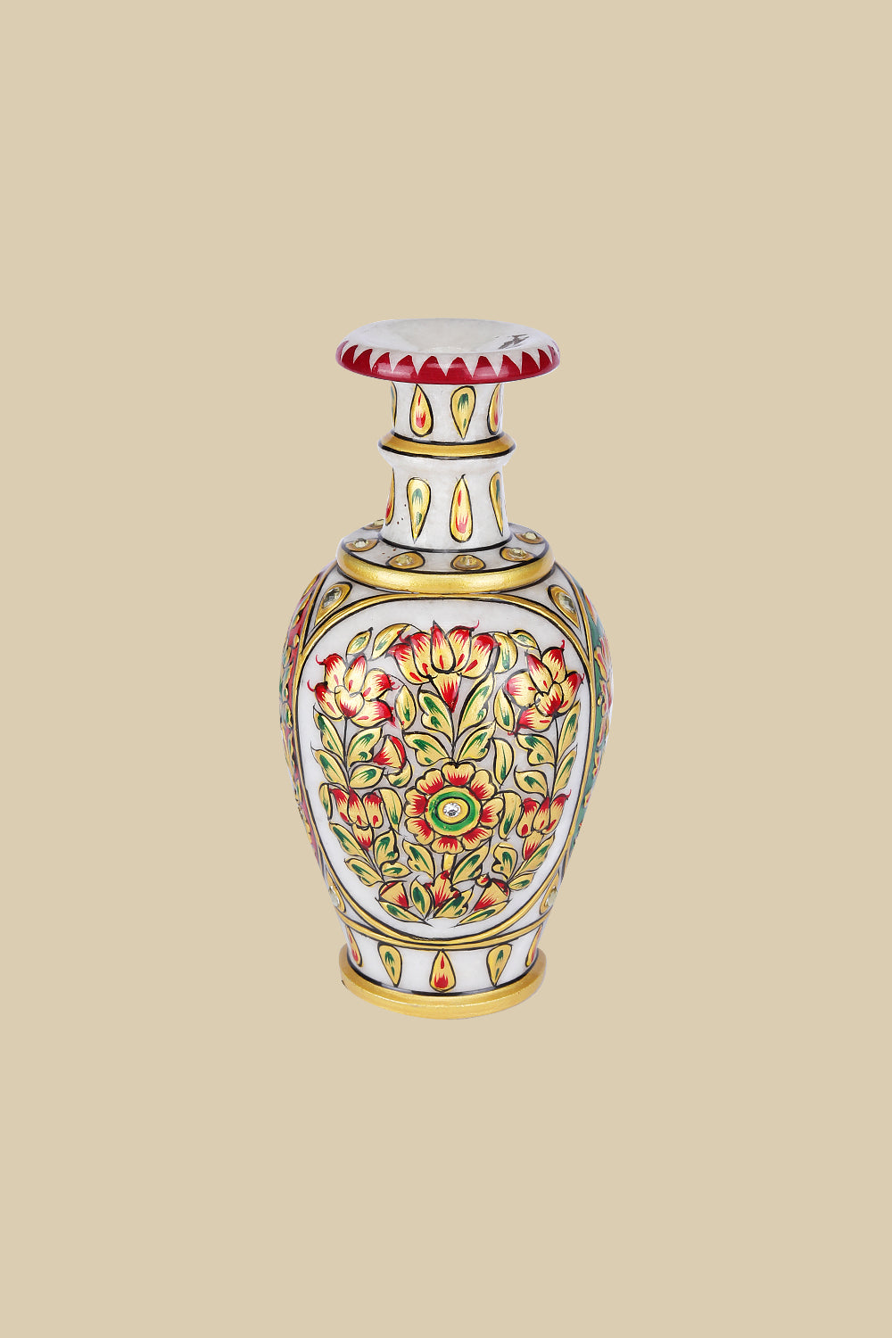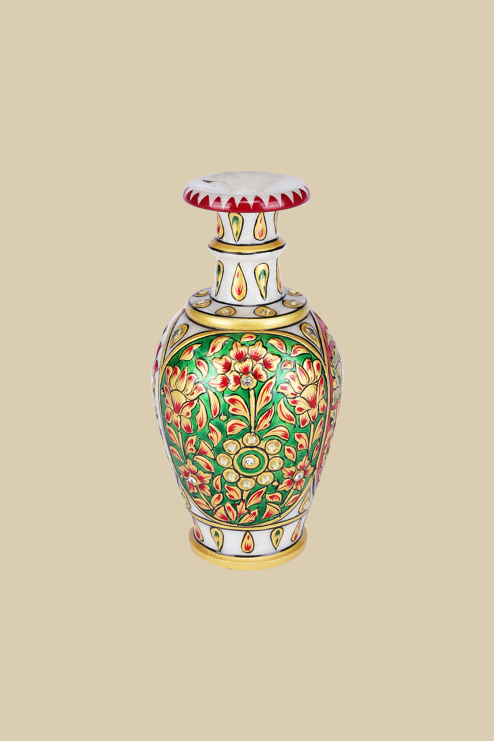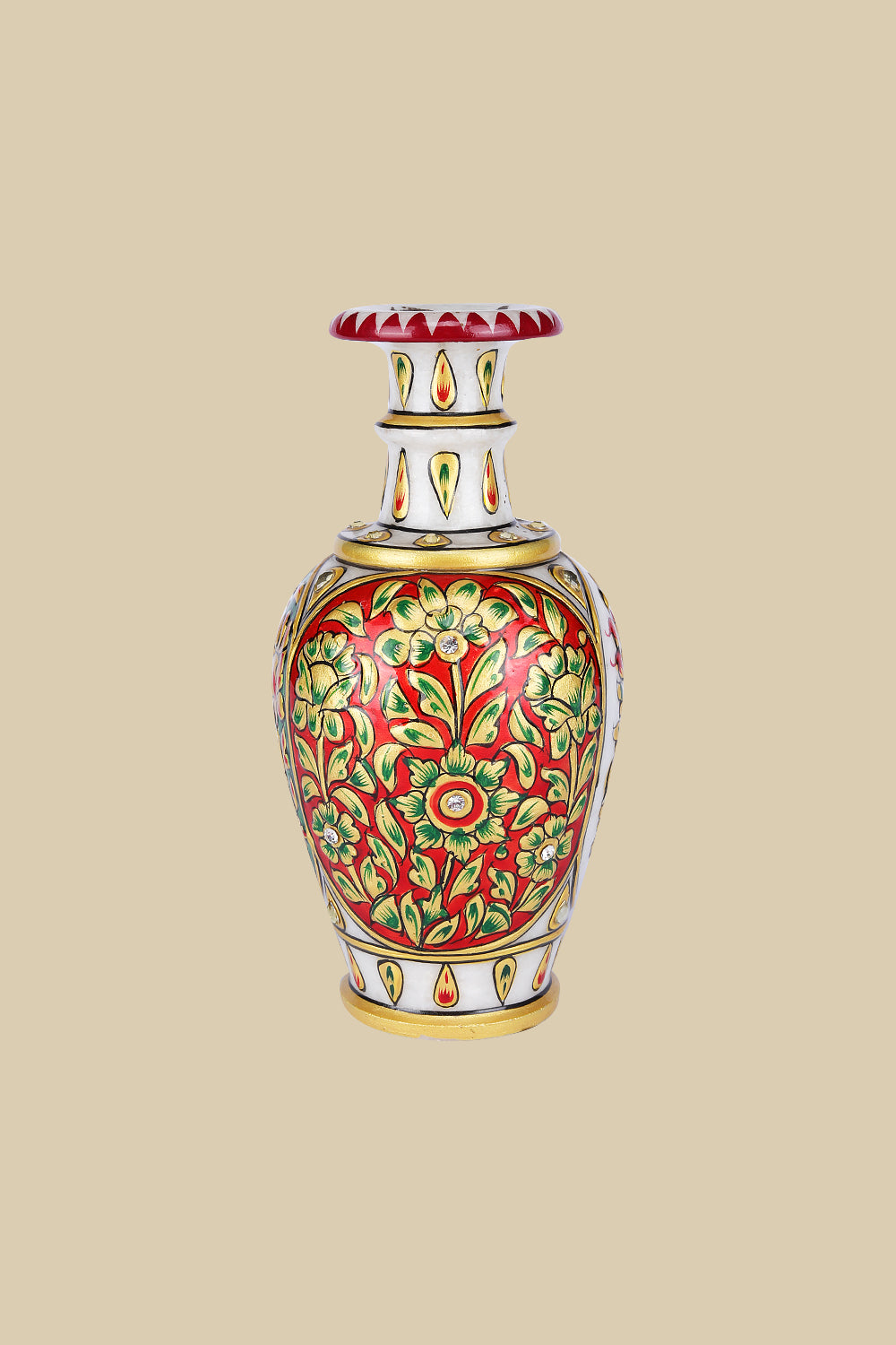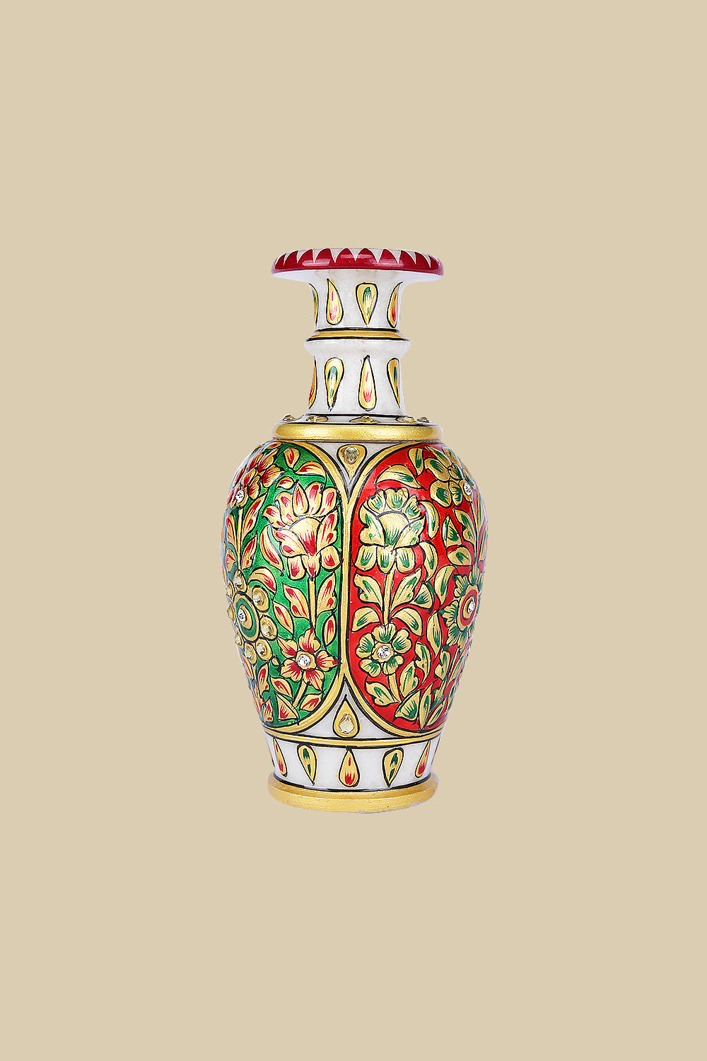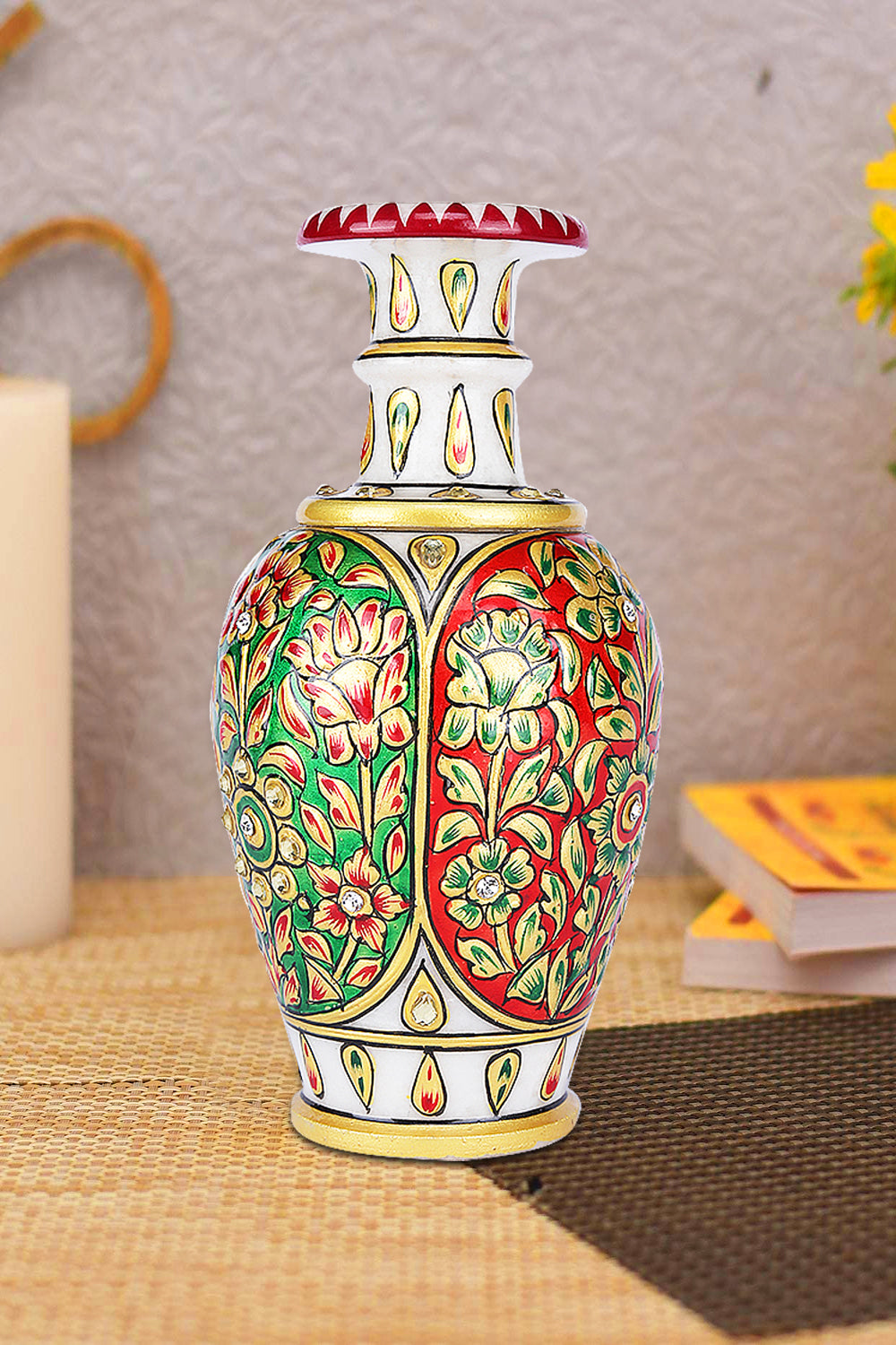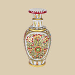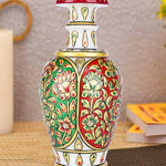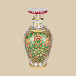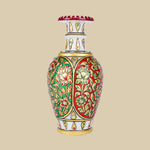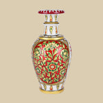 This exquisite marble vase reflects the artistry of Indian handcrafted decor, adorned with vibrant hand-painted floral and vine patterns in deep red and emerald green, accented with golden detailing and embedded stones. Inspired by Mughal enamel work, the  flared neck and regal charm make it a testament to luxury craftsmanship. This vase is a perfect decorative accent for shelves or corner tables, enhancing heritage-inspired interiors or modern spaces with timeless elegance.