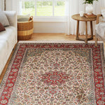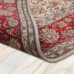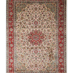 Add a touch of heritage to your space with the Narges rug, a finely hand-knotted piece from our Viraasat Collection that embodies Oriental elegance. This 4 x 6 ft silk rug, featuring a low pile with a soft texture, showcases a central medallion with floral and vine motifs in creamy pearl blush, rich crimson ember, and hints of soft coral. Its design draws from Persian and Central Asian traditions, where medallions and floral vines symbolized harmony and abundance since the 16th century, often woven into silk rugs for ceremonial and elite settings. These patterns, reflecting cultural narratives of prosperity and balance, influenced textile arts across trade routes, blending tradition with luxurious charm. The silky texture makes it perfect for living rooms or bedrooms seeking a refined accent.