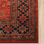 This hand-knotted wool rug, inspired by the renowned Oushak design, is a harmonious blend of tribal artistry and contemporary charm. The rust orange and black tones evoke a sense of grounded warmth. The Oushak design is a celebration of elegance and subtle sophistication, originating from the renowned weaving traditions of the Oushak region in Turkey. Known for its large-scale floral motifs and soft, flowing patterns, this design exudes a sense of understated luxury. What sets Oushak rugs apart is their loose, free-flowing artistry, combining geometric influences with floral elements in a unique blend, as can be seen with the hexagonal style executed here. Handwoven with premium wool, they are prized for their plush texture and durability. Unlike more intricate or rigid designs, the Oushak style embraces simplicity with a touch of grandeur, making it versatile for both modern and traditional interiors.