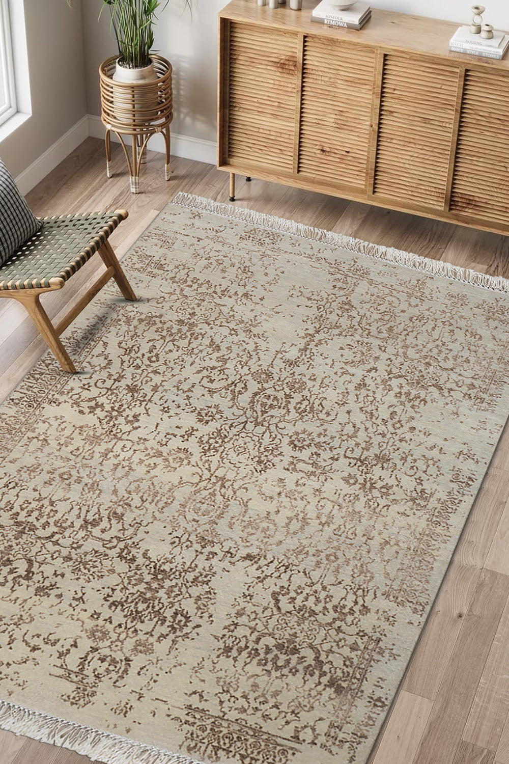 At 5x7, this rectangular piece creates a seamless blend of vintage-inspired distress and contemporary poise. A true celebration of craftsmanship, it grounds spaces with its quiet yet commanding presence.