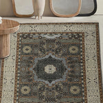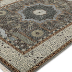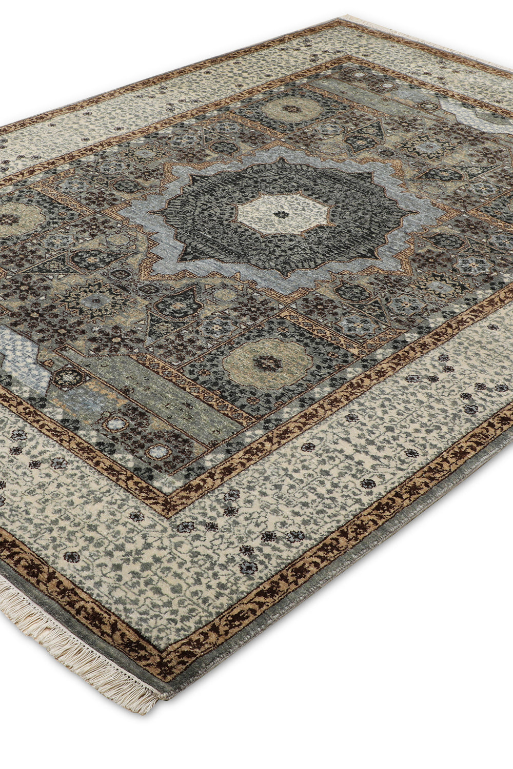 Enrich your space with the Parisa rug, a beautifully hand-knotted piece from our Virasat Collection that embodies the spirit of Oriental heritage. This 6 x 8.6 ft wool rug, featuring a medium pile with a mild soft texture, showcases a central medallion with geometric and floral motifs in soft slate ash, creamy ivory glow, and hints of warm taupe. Its design draws from Persian and Central Asian traditions, where medallions and floral patterns symbolized harmony and prosperity since the 16th century, often woven into rugs for ceremonial and elite use. These motifs, reflecting cultural narratives of balance and abundance, influenced textile arts across trade routes, blending history with enduring elegance. The inviting texture makes it perfect for living rooms or dining rooms seeking a luxurious accent.
