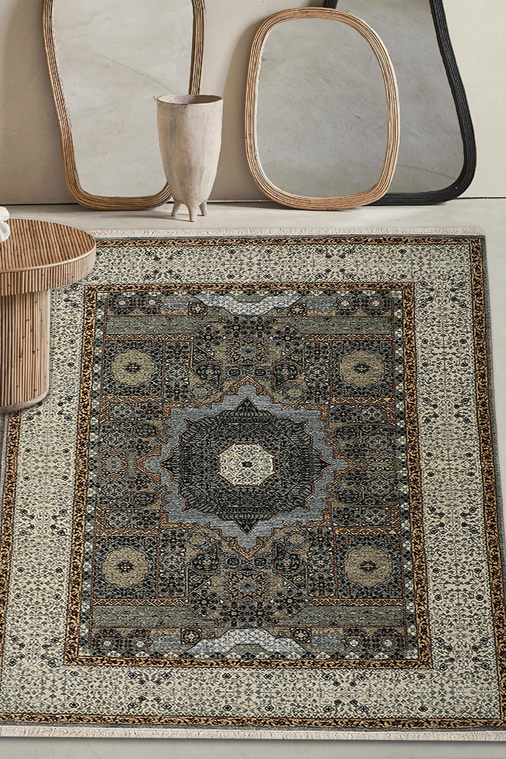 Elevate your home with this rectangular rug, where every knot weaves a story of historical depth and modern charm. The Oriental medallion design, rooted in ancient Persian symbolism, complements both traditional and contemporary interiors with its intricate patterns. Ideal for modern homes, it blends durability with a rich aesthetic, creating a striking yet cozy focal point. Its neutral tones transform any room, infusing it with a sense of cultural richness and timeless sophistication. Discover a rug that connects the past’s craftsmanship with today’s living spaces.