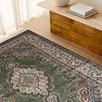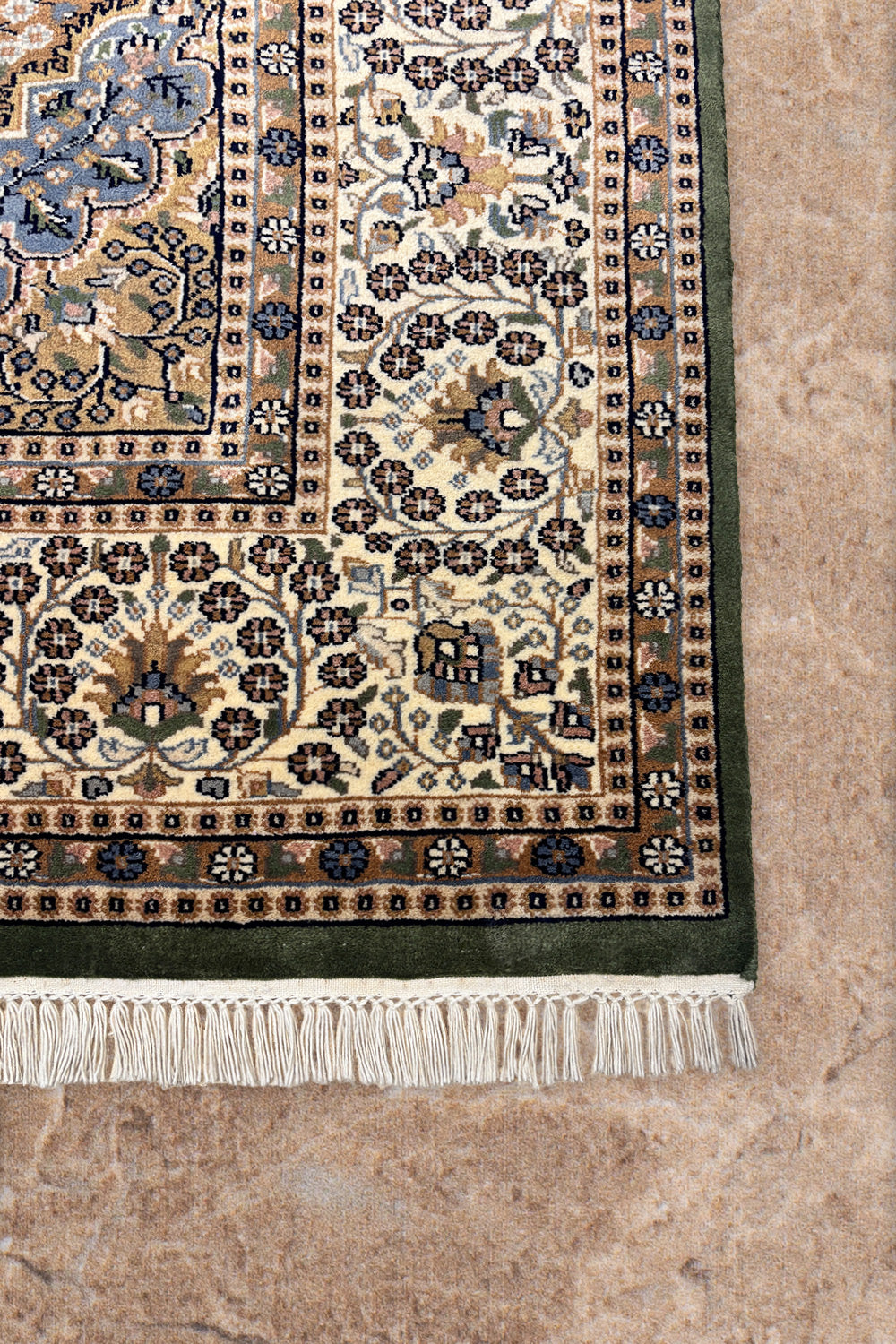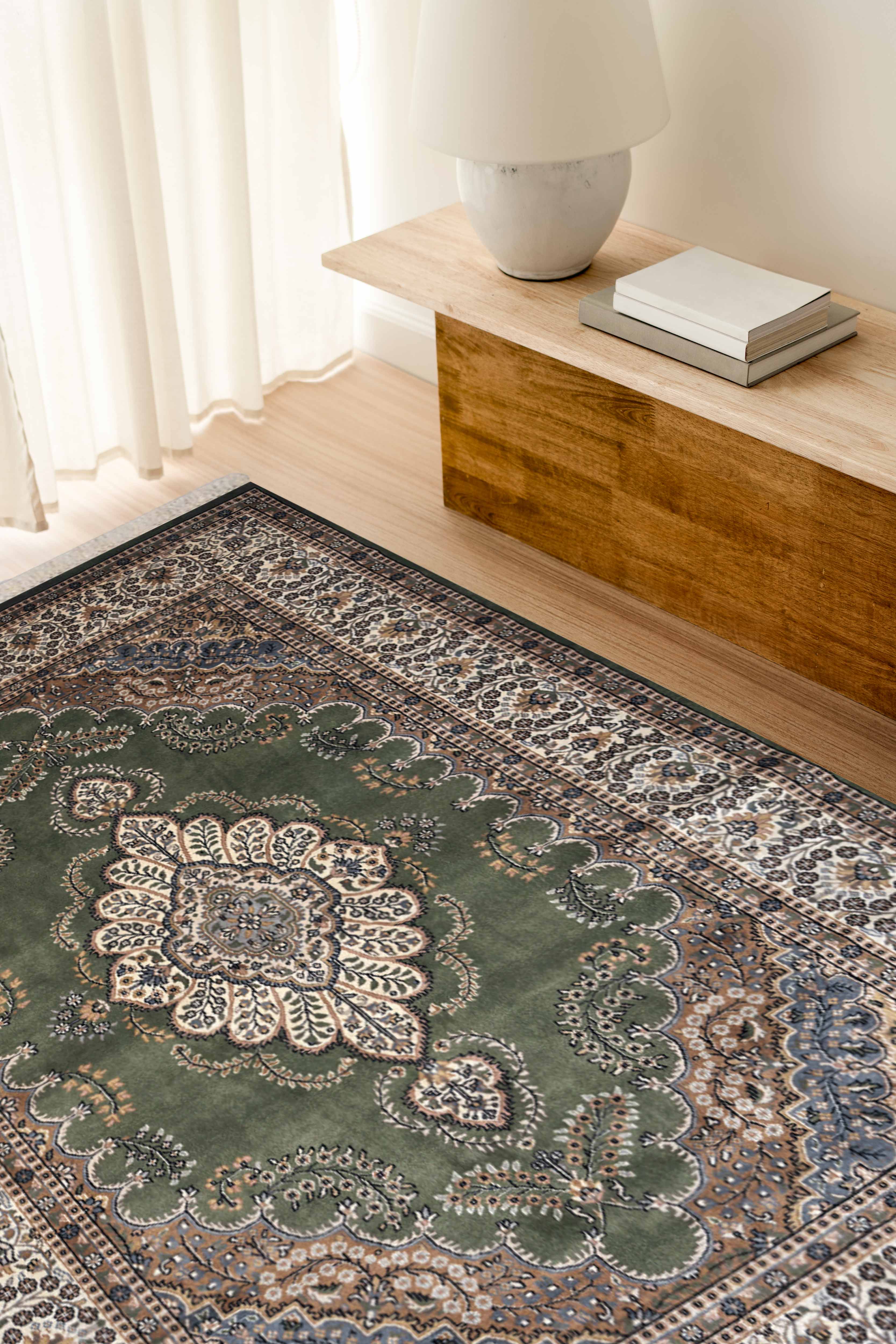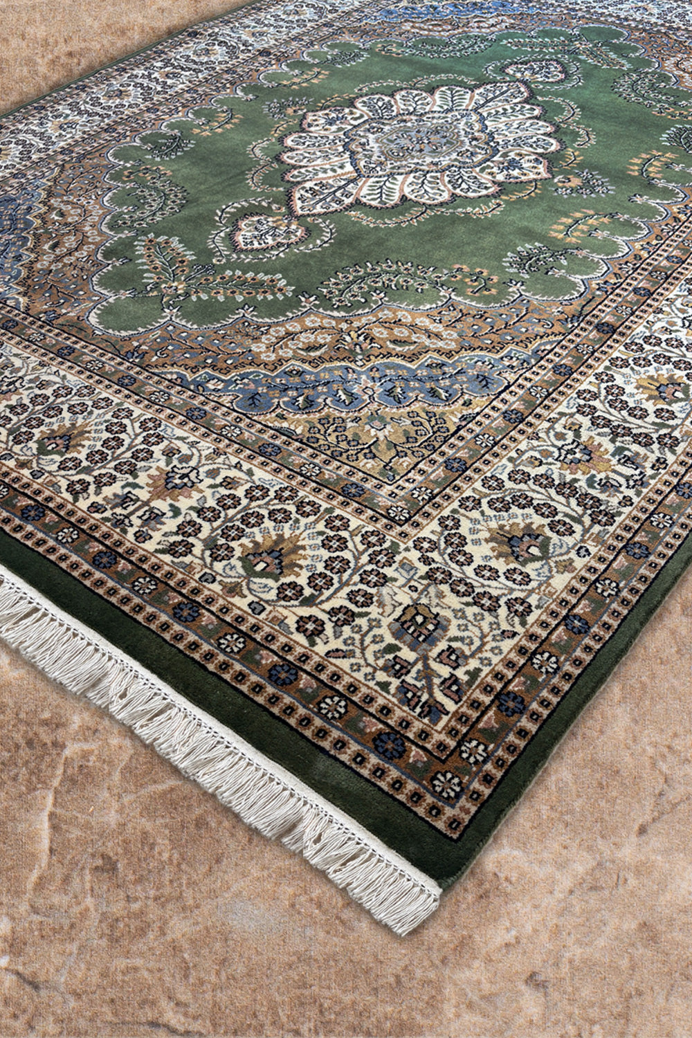 The natural palette of Parnav makes it an inviting statement piece. Its olive green field brings grounding calm, while the beige borders add light and balance. Perfect for creating warmth in a dining room or understated elegance in a lounge, this rug is both décor and legacy—crafted to endure in beauty and meaning.
