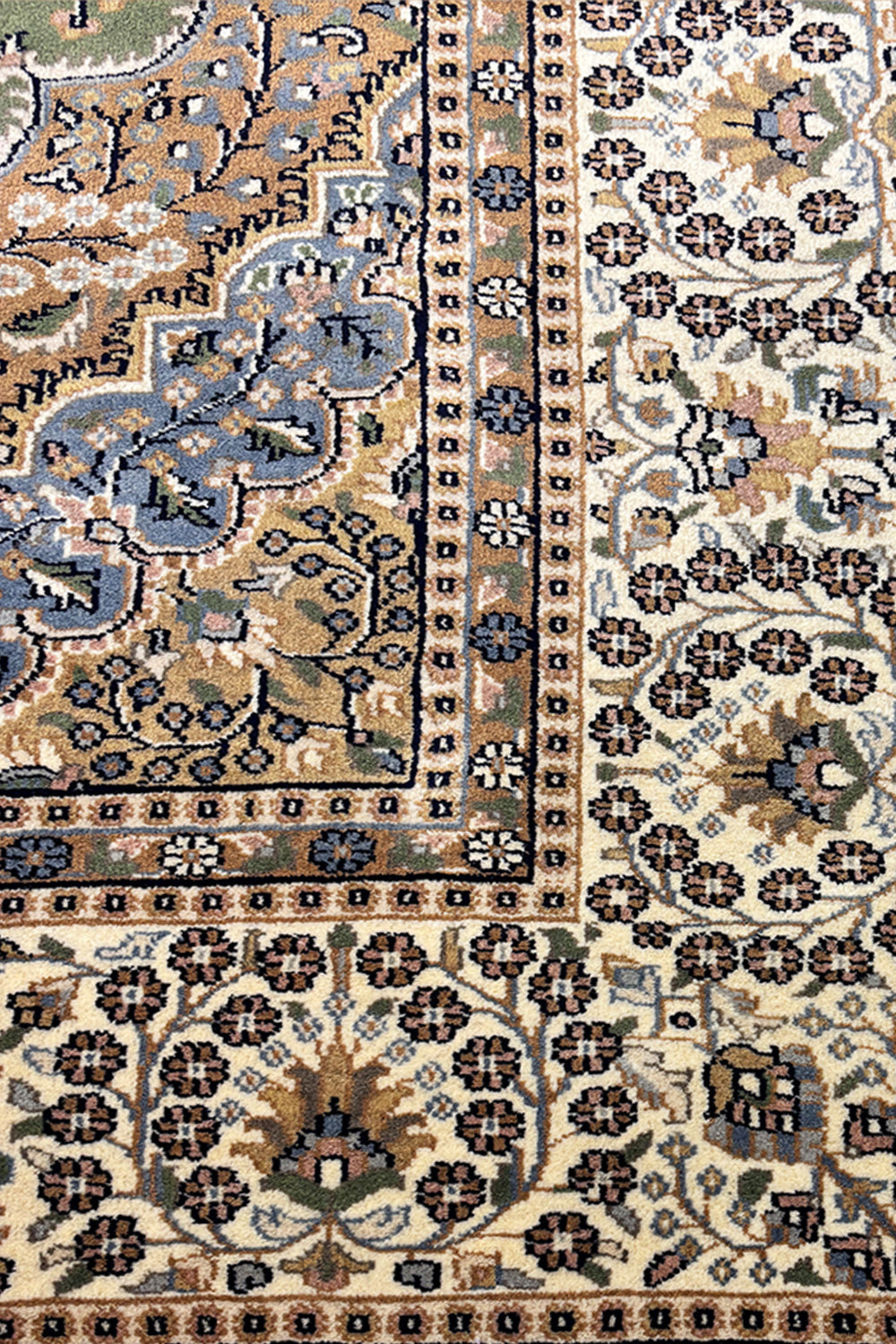 Rooted in tradition and refined in detail, the Parnav rug blends olive green depth with beige accents that highlight every curve of its floral medallion. The design carries the rhythm of heritage weaving, where motifs symbolise growth, harmony, and grace. Each hand knotted wool thread is a testament to artistry preserved across generations.