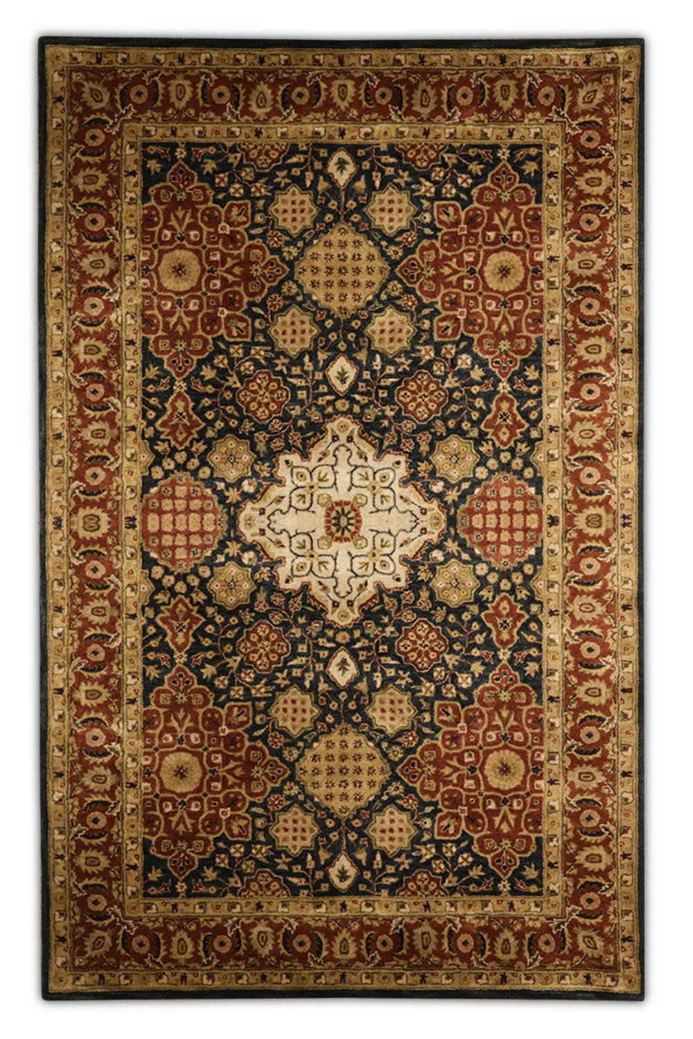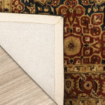 The color palette is both bold and earthy, navy blue anchors the design with its deep richness, while mud brown adds a grounding warmth, creating a harmonious blend that can elevate living rooms and bedrooms alike. The soft wool construction, carefully hand-tufted by India’s legacy carpet designers, ensures a plush feel underfoot while maintaining its durability for high-traffic spaces.