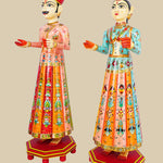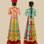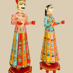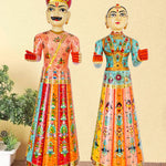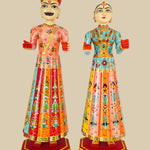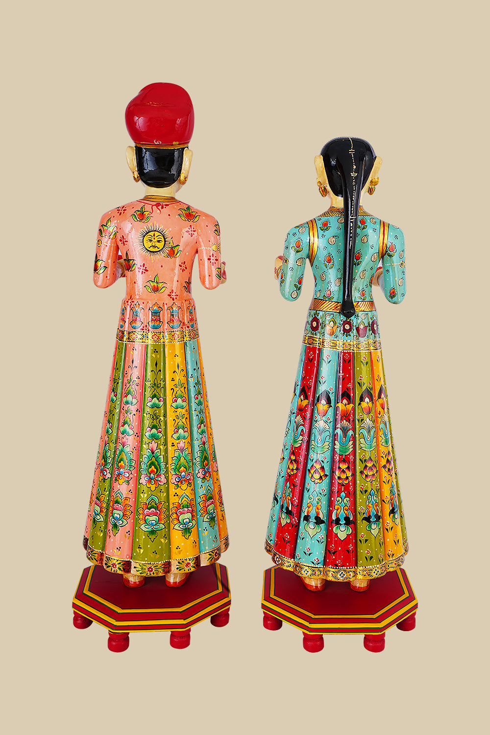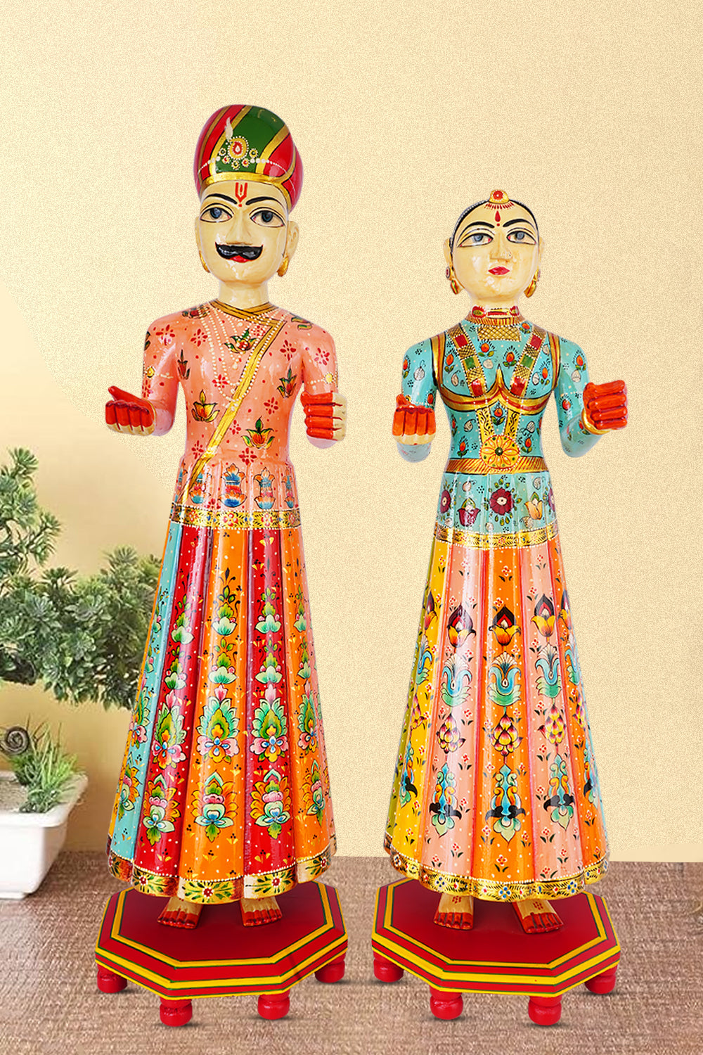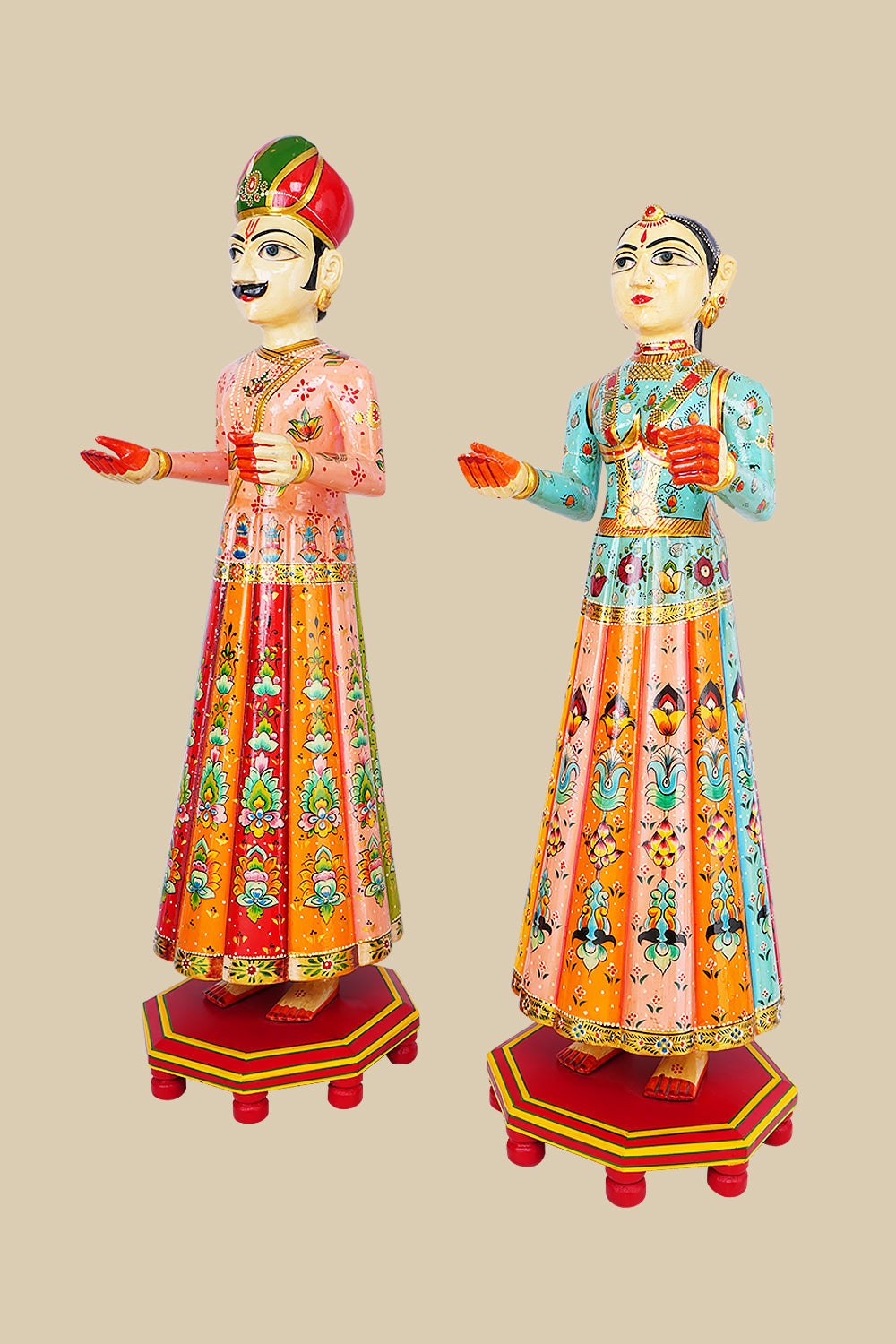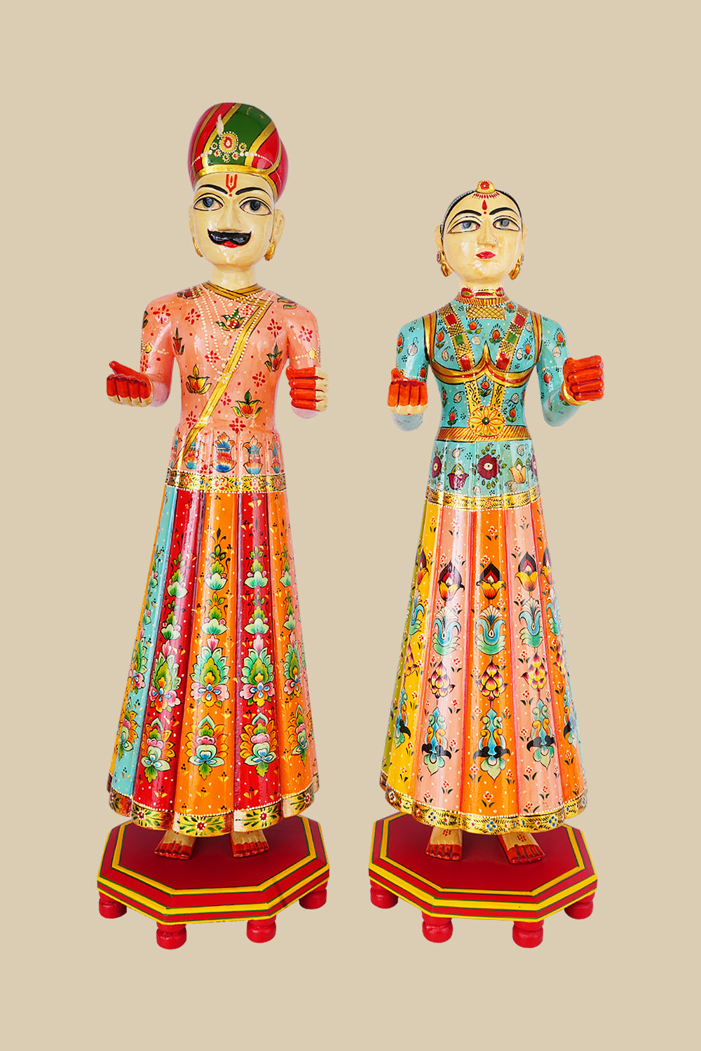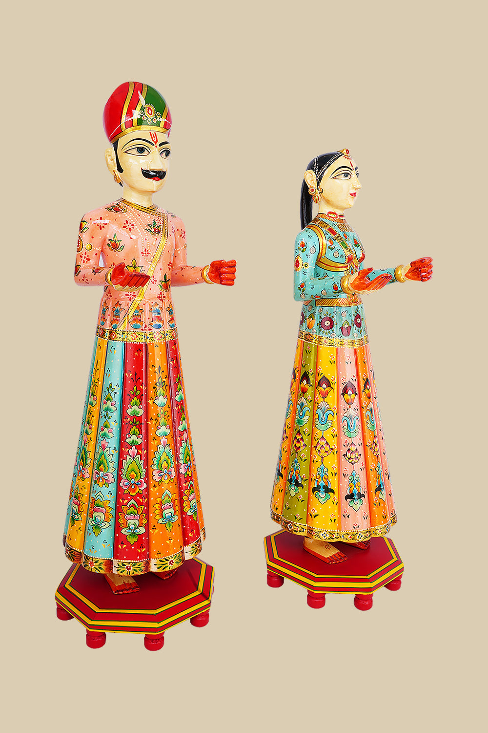 The Rajasthani Gangaur figurine pair celebrates the timeless love and devotion of Shiva and Parvati through an intricately hand-painted wooden design. The Gudda (Male) and the Gudiya (Female) reflects the intricacies of Rajasthani folk art, from garments and jewellery, to even the length of the eyebrows and density of the moustaches.The expressive features, reminiscent of the art of puppeting in Rajasthan, pay homage and honor their tradition. Ideal for festive decor or as a centerpiece, this decorative pair embodies cultural storytelling, bridging history and artistry seamlessly.