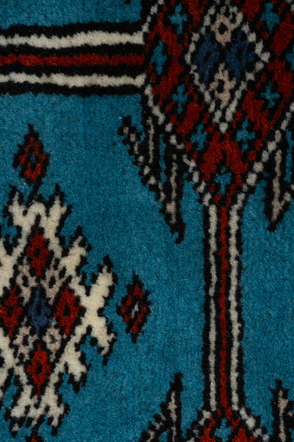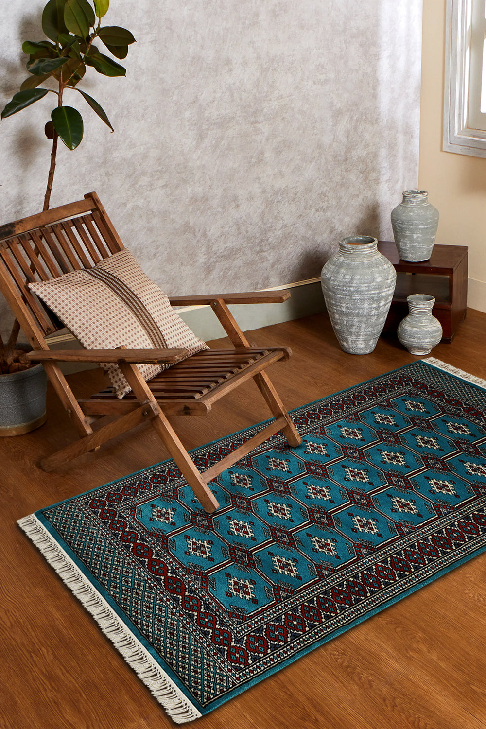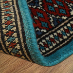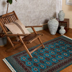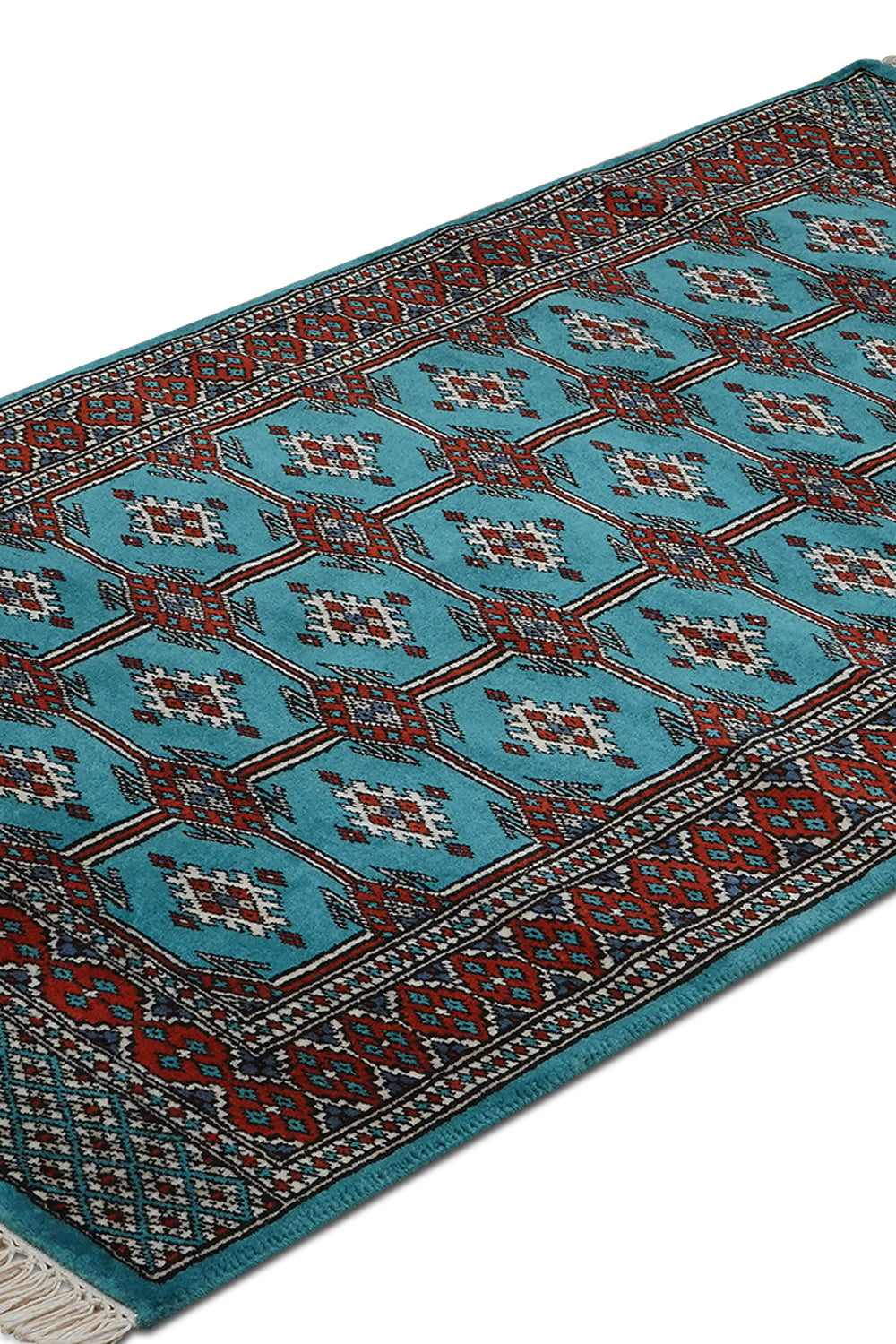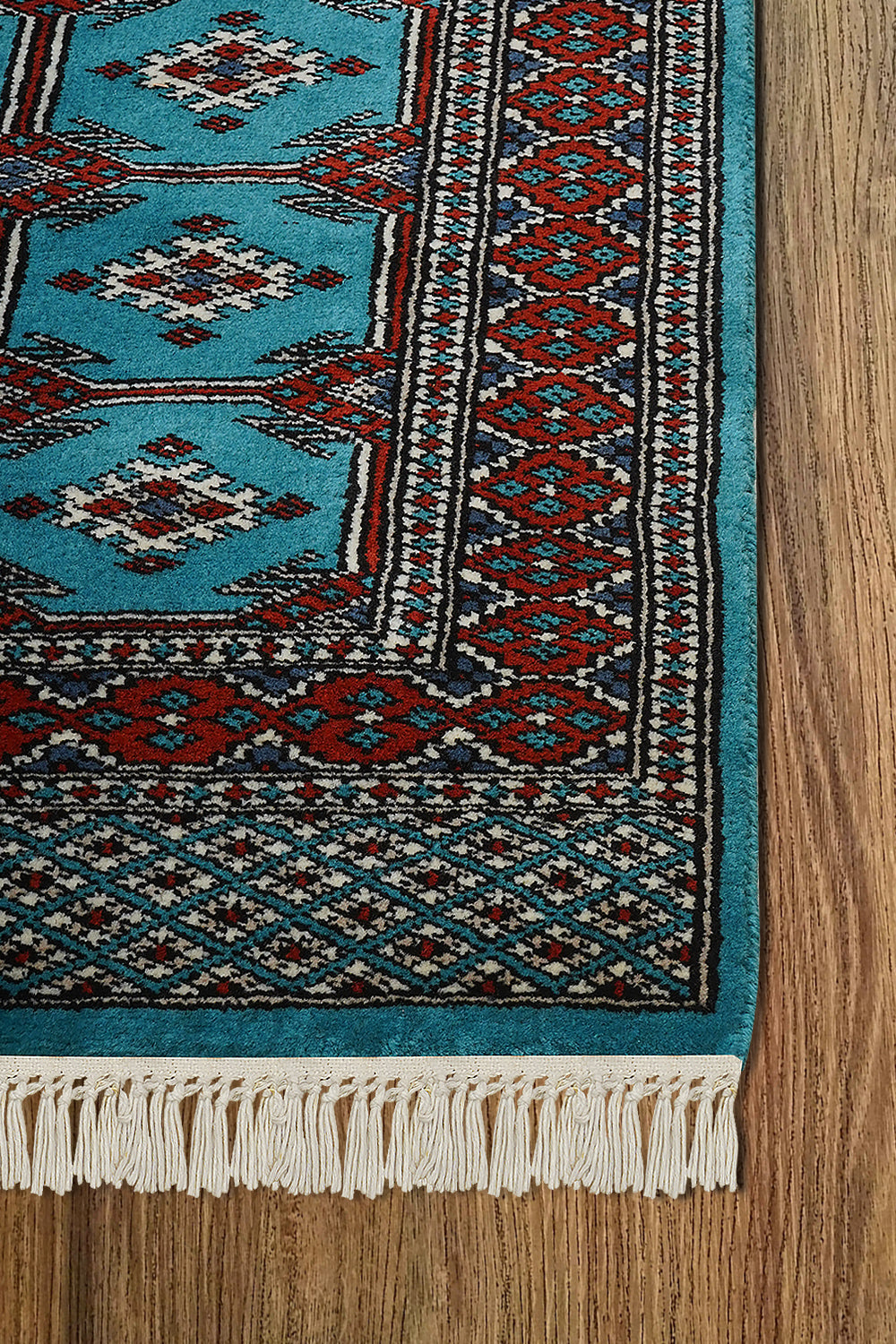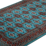 This hand-knotted wool rug captures the eternal appeal of traditional tribal artistry, inspired by the iconic Turkmen Bokhara design. With its striking turquoise blue and red oxide palette, this piece evokes a sense of vibrant heritage and refined elegance, perfectly suited for living rooms or bedrooms.