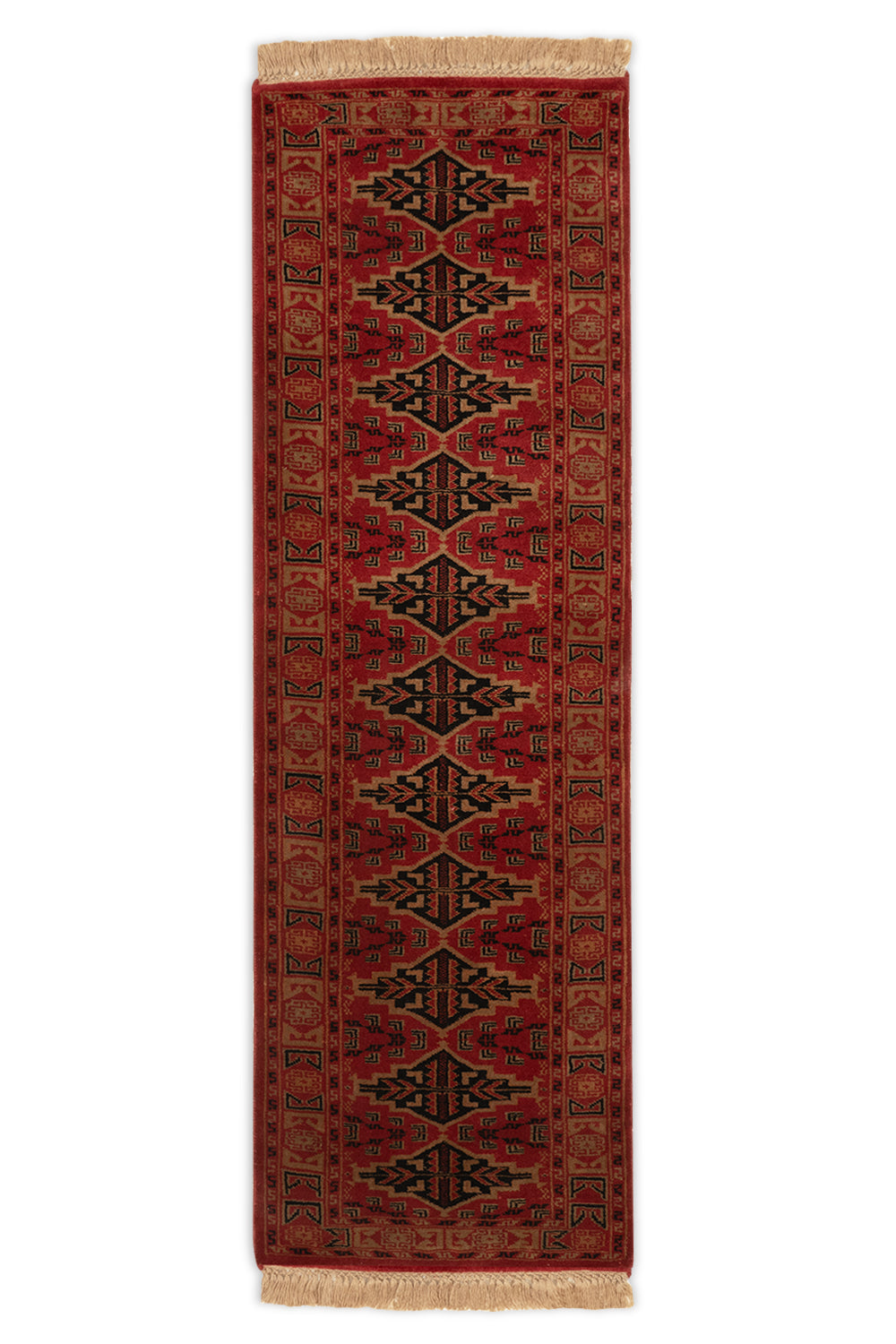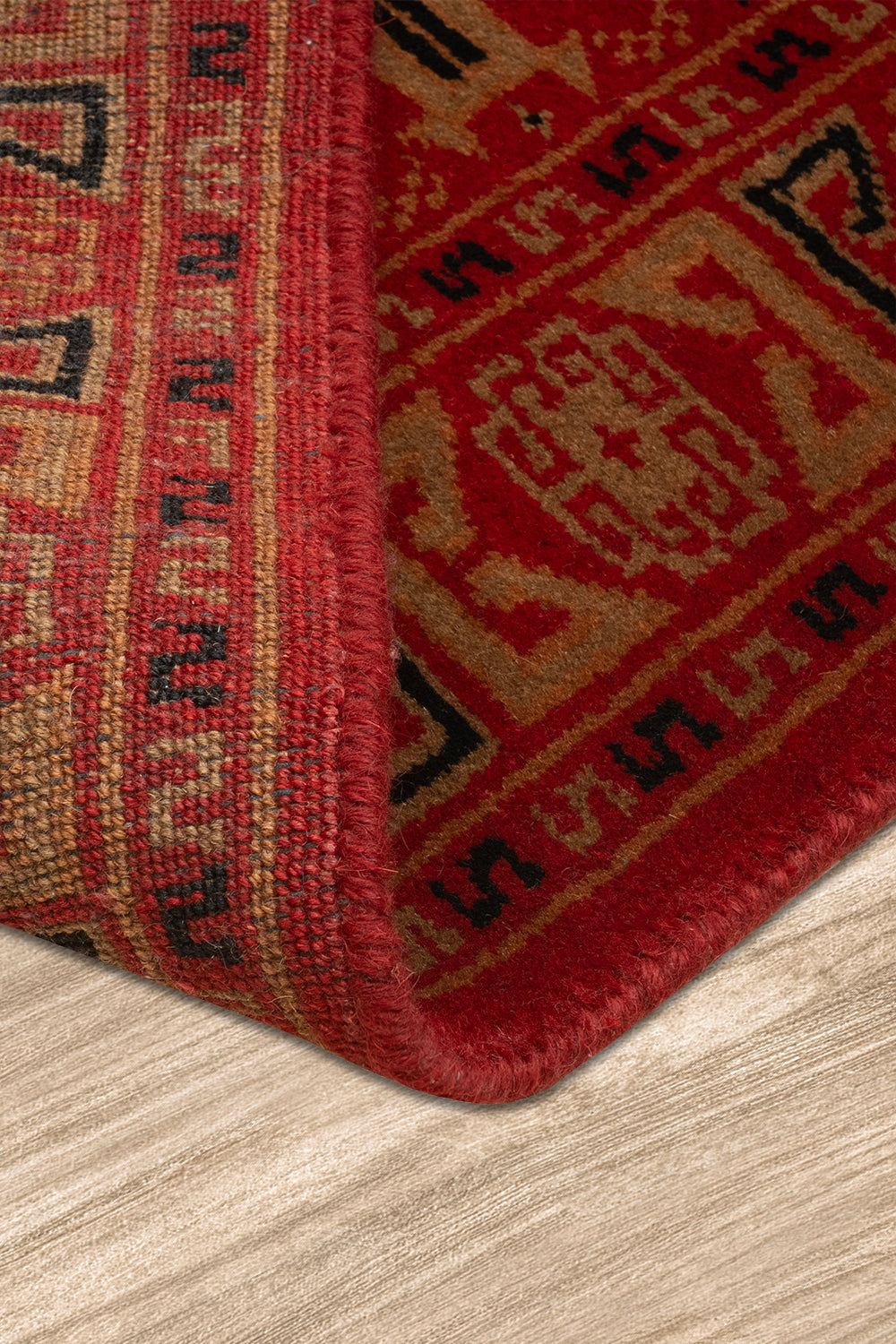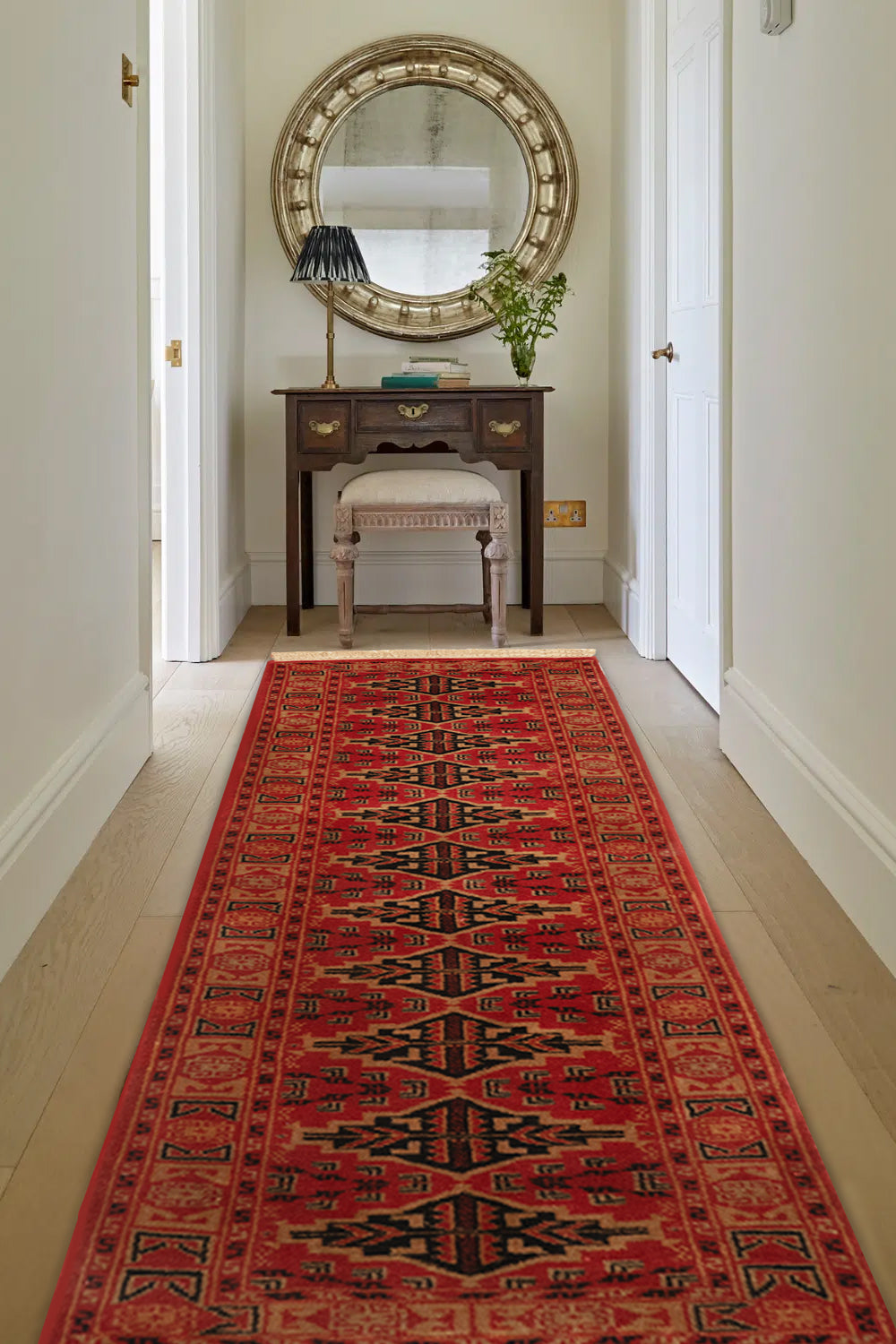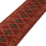 The Path of Colors. Inspired by the raw elegance of traditional tribal patterns, the Rang Raah runner brings a touch of timeless heritage to modern hallways. Its rich reddish-maroon hue evokes the warmth of ancient tales, where bold geometric motifs meet the precision of Indian hand-knotted craftsmanship. Interweaving age-old traditions with contemporary flair, making it an essential piece for those who appreciate culture and authenticity. Made from soft wool, this runner boasts a high pile that feels luxurious underfoot while providing durability. Perfect for narrow spaces, it’s a journey into the legacy of India's finest carpet weavers, preserving the spirit of Tribal Carpets in India, renowned for their skill and creativity.