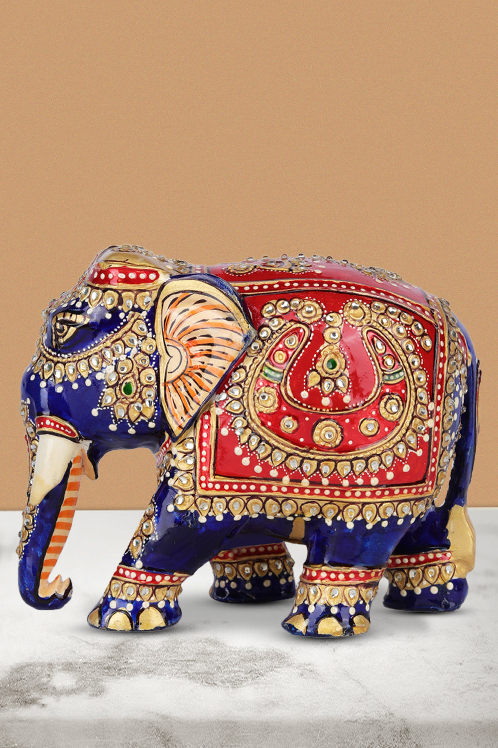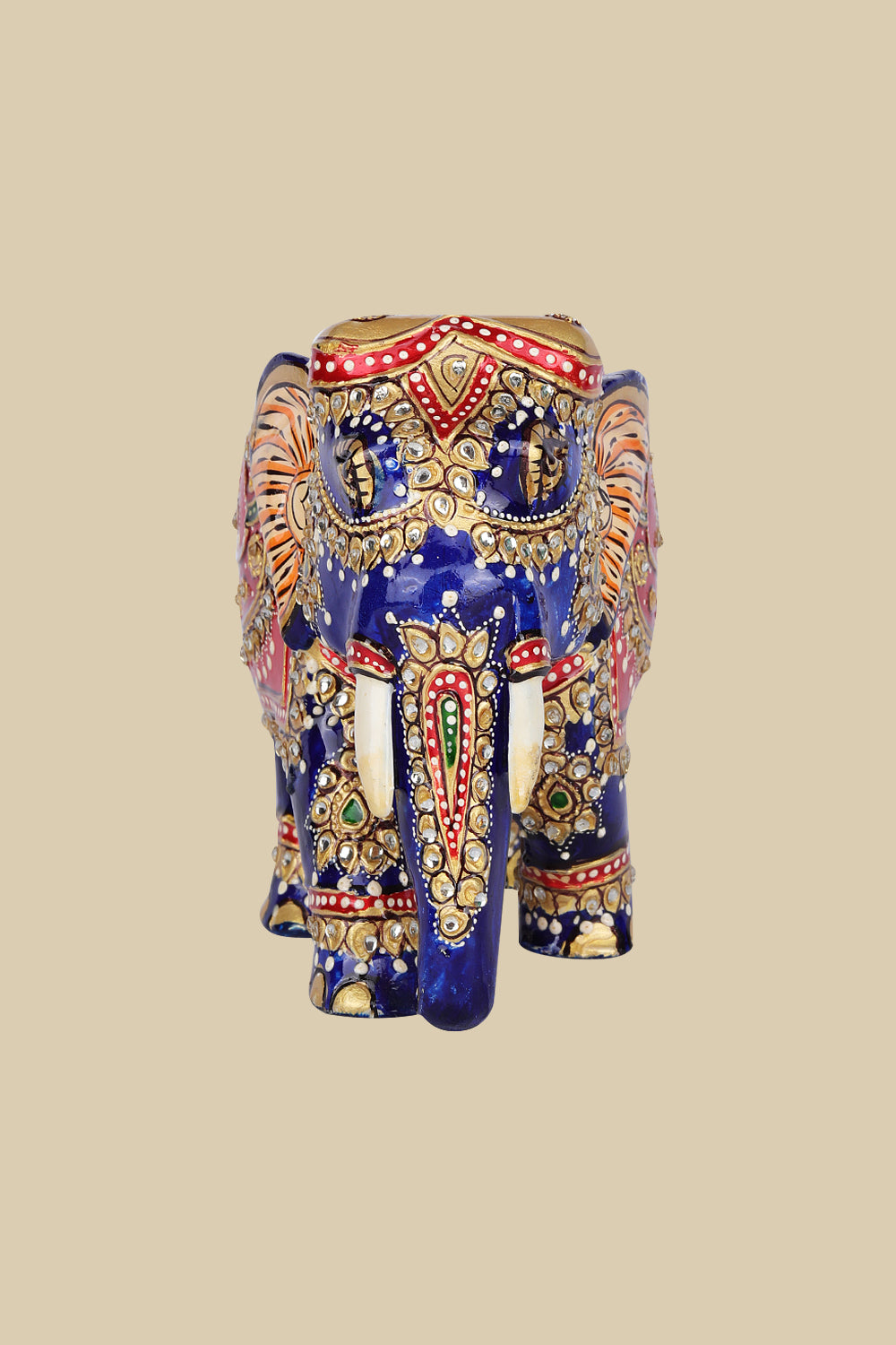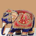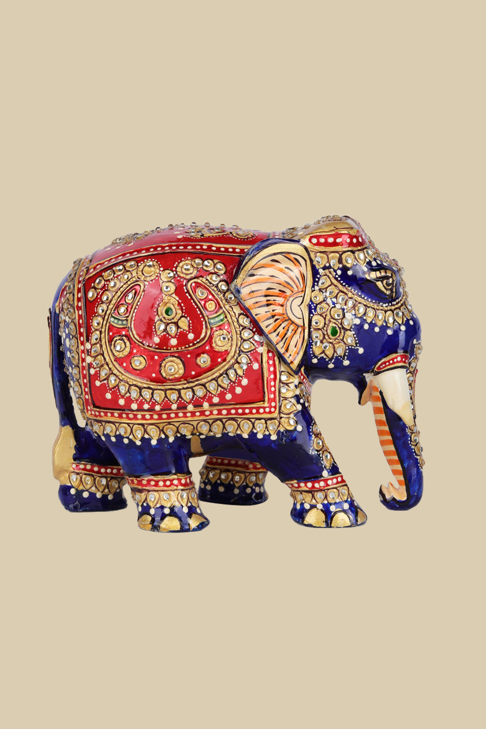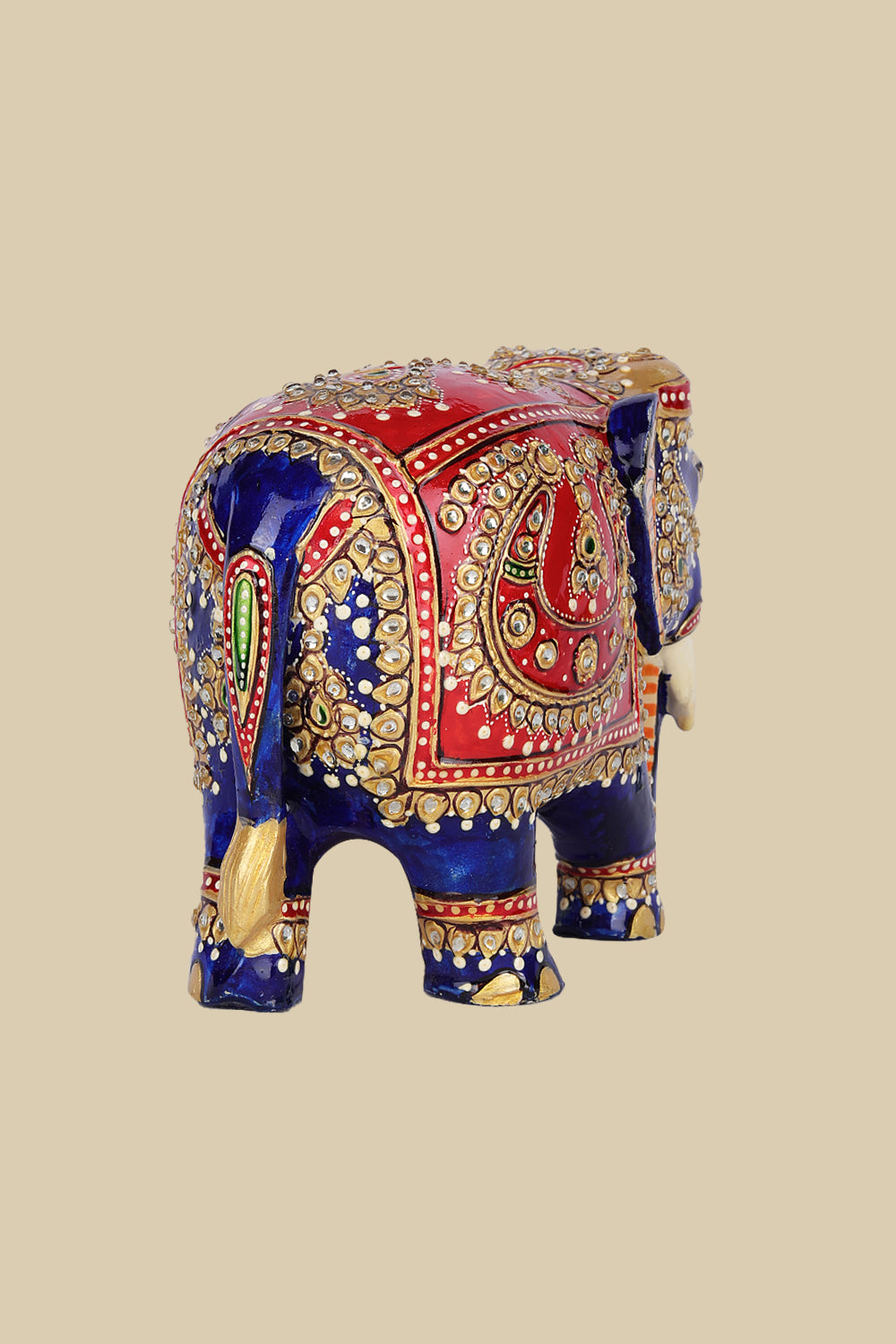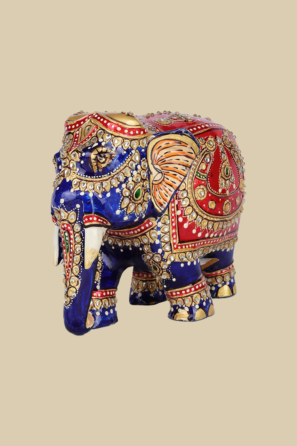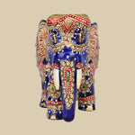This vibrant wooden elephant figurine celebrates Indian folk artistry, hand-carved from solid wood and painted in a vivid palette of red, navy blue, gold, and emerald green. Adorned with floral and geometric patterns, an ornate saddlecloth with embedded stones, and a lively curved trunk, it embodies cultural richness. This handcrafted sculpture is a perfect decorative accent for eclectic interiors or as a festive gift, seamlessly blending into modern or heritage-inspired decor.