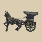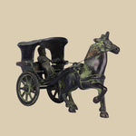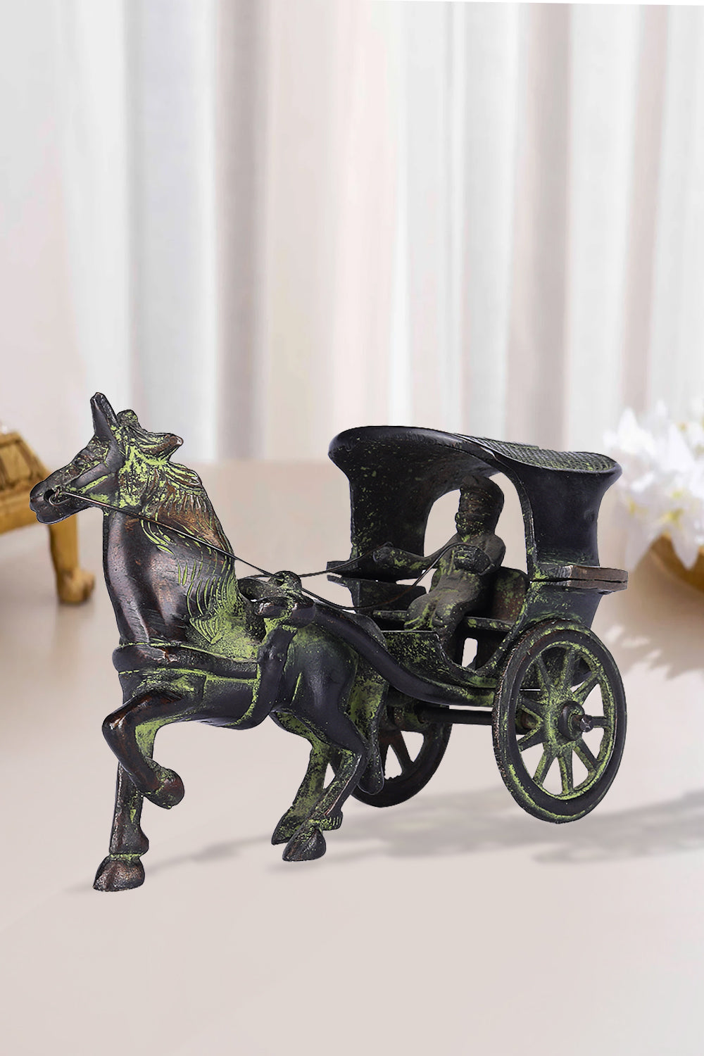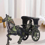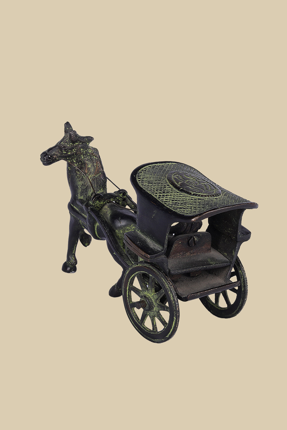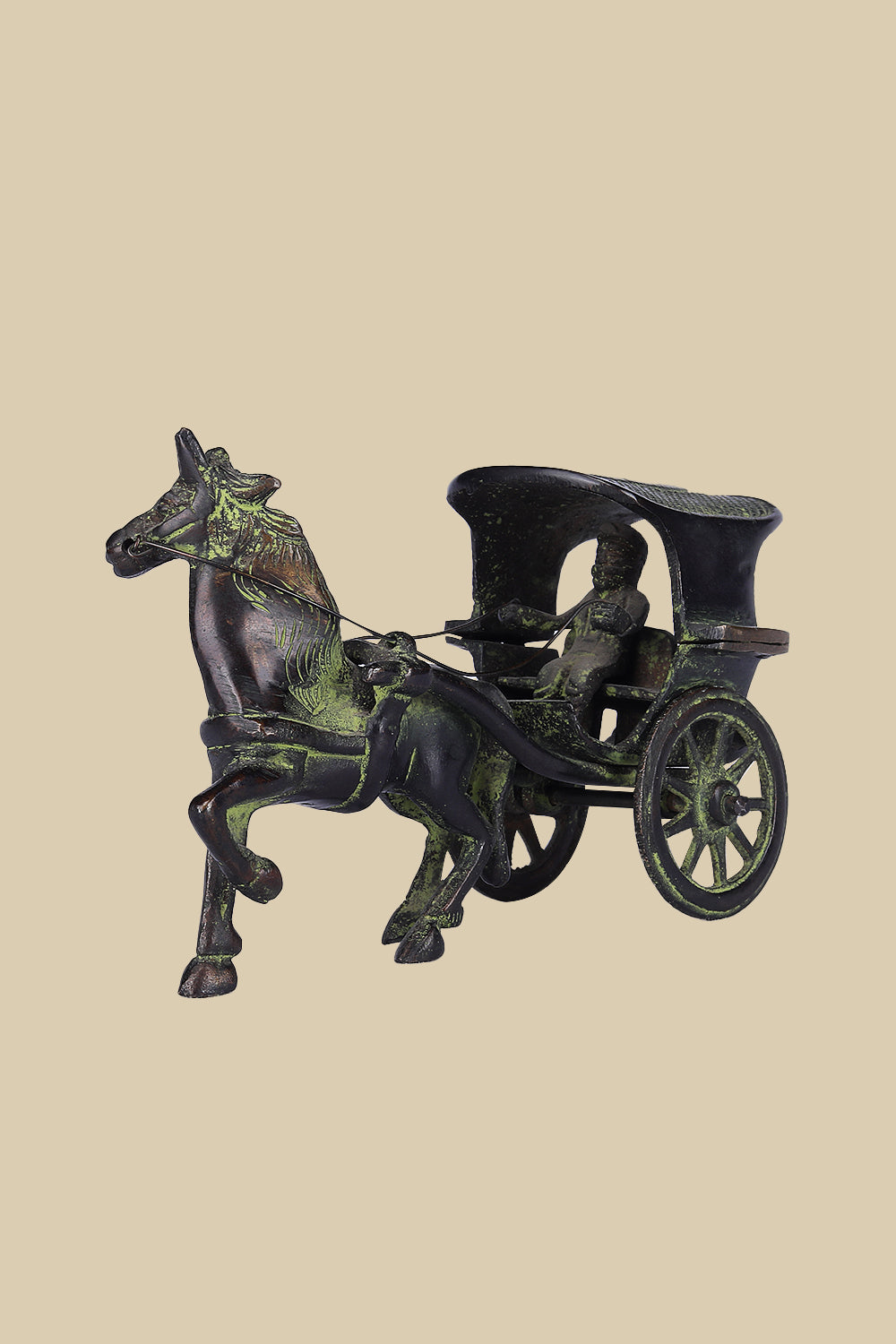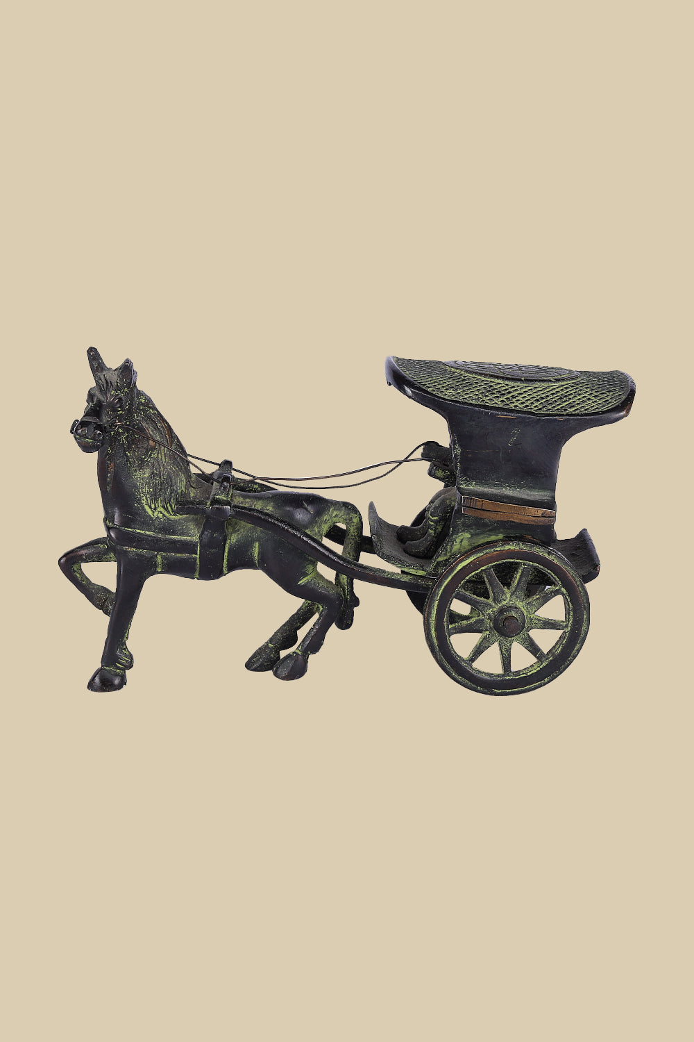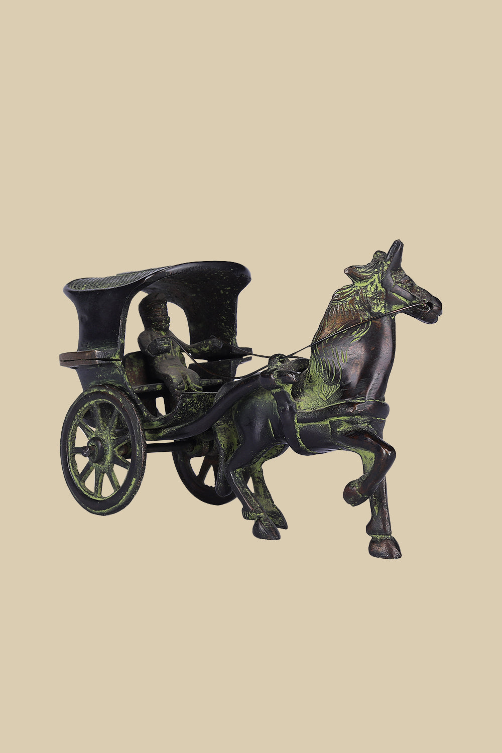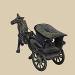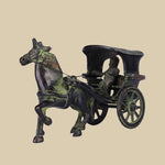 This exquisite bronze sculpture captures the timeless charm of Indian traditional artistry, depicting a horse-drawn carriage with a sense of historical nostalgia. The finely etched horse in mid-step and the arched canopy over a seated figure reflect meticulous craftsmanship, while the aged bronze finish with oxidized highlights evokes a vintage allure. Symbolizing travel and storytelling, this handcrafted piece is a perfect decorative accent for vintage decor themes or collections of heritage transport art, enhancing both modern and rustic interiors.